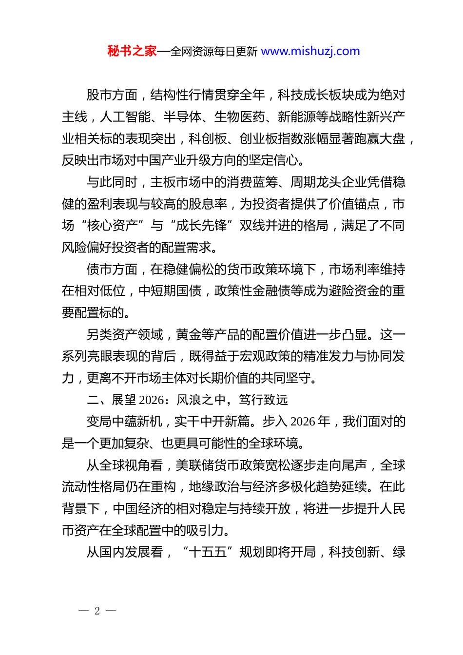 秘书之家—全网资源每日更新 www.mishuzj.com在 2026 投资策略会上的致辞:笃行致远,展望新年投资新局尊敬的各位来宾,各位客户,各位同事:大家好!新年伊始,我们齐聚上海,共叙投资新局,展望 2026 年的机遇与挑战。在此,我谨代表博时基金,向各位嘉宾、客户、专家及同仁的到来表示热烈欢迎,也向全体投研团队的辛勤筹备致以诚挚谢意。一、回顾 2025:稳中有进,结构活跃2025 年,全球经济仍处于地缘政治冲突扰动、复苏进程分化的复杂环境中,通胀余温未散与增长动能不足的矛盾交织,主要经济体政策调整节奏不一引发跨境资本流动和波动。在此背景下,中国经济凭借深厚的基本面支撑与精准的宏观调控,展现出超乎预期的发展韧性,全年经济增长稳稳落在合理区间,根据中央财办相关消息,预计 GDP 同比增长保持在5%左右的中高速水平,既实现了总量层面的平稳运行,更在结构优化中孕育了高质量发展的新动能。资本市场在政策护航与产业升级的双轮驱动下,呈现出“总量平稳、结构活跃”的鲜明特征,成为服务实体经济与居民财富管理的重要平台。— 1 —秘书之家—全网资源每日更新 www.mishuzj.com股市方面,结构性行情贯穿全年,科技成长板块成为绝对主线,人工智能、半导体、生物医药、新能源等战略性新兴产业相关标的表现突出,科创板、创业板指数涨幅显著跑赢大盘,反映出市场对中国产业升级方向的坚定信心。与此同时,主板市场中的消费蓝筹、周期龙头企业凭借稳健的盈利表现与较高的股息率,为投资者提供了价值锚点,市场“核心资产”与“成长先锋”双线并进的格局,满足了不同风险偏好投资者的配置需求。债市方面,在稳健偏松的货币政策环境下,市场利率维持在相对低位,中短期国债,政策性金融债等成为避险资金的重要配置标的。另类资产领域,黄金等产品的配置价值进一步凸显。这一系列亮眼表现的背后,既得益于宏观政策的精准发力与协同发力,更离不开市场主体对长期价值的共同坚守。二、展望 2026:风浪之中,笃行致远变局中蕴新机,实干中开新篇。步入 2026 年,我们面对的是一个更加复杂、也更具可能性的全球环境。从全球视角看,美联储货币政策宽松逐步走向尾声,全球流动性格局仍在重构,地缘政治与经济多极化趋势延续。在此背景下,中国经济的相对稳定与持续开放,将进一步提升人民币资产在全球配置中的吸引力。从国内发展看,“十五五”规划即将开局,科技创新、绿— 2 —秘书之家—全网资源每日更新 www.mishuzj.com色转型、内需提振、乡村振兴等国家战略将持续落地,为资本市场注入源源不断的产业动力。财政政策与货币政策的协同有望更加灵活精准,在稳增长、促转型、防风险之间寻求动态平衡。对于资本市场,我们抱有审慎乐观的态度。(一)股市结构性机会依然丰富在科技自立、能源转型、消费复苏等主线中,具备真实竞争力和成长性的企业将继续获得价值重估。科创、高端制造、数字经济等板块有望延续活跃,港股与A 股的联动也将带来跨境配置机遇。2026 年的权益市场,我们将深耕基本面,拥抱“新需求”与“新供给”。首先,“新需求”牵引,即围绕国家战略与产业升级,科技创新(如人工智能、高端芯片、生物制造)、绿色转型(新能源、新型电力系统)、国家安全(国防军工、信息安全)等领域的真实需求将持续释放,孕育一批具备核心竞争力的成长型企业。其次,“新供给”创造,即传统产业的转型升级与价值重估机会同样值得关注。受益于设备更新、技术改造、效率提升的制造业龙头,以及治理改善、盈利能力提升的优质央国企,可能提供具有较高性价比的投资选择。(二)债市仍具配置价值在利率中枢可能维持相对低位、政策托底经济的环境下,— 3 —秘书之家—全网资源每日更新 www.mishuzj.com利率债与高等级信用债的“压舱石”作用依然稳固。投资机会将更多来自对期限利差、信用利差的精细挖掘,以及“固收+”策略的灵活运用。可以关注与宏观周期关联度较低的细分品种,以及 REITs等具备稳定现金流特征的资产,以增强组合的收益弹性和抗波动能力。(三)资产配置需更注重均衡与灵活从“单一 Beta”走向“多元 Alpha”2026 年市场波动可能加...