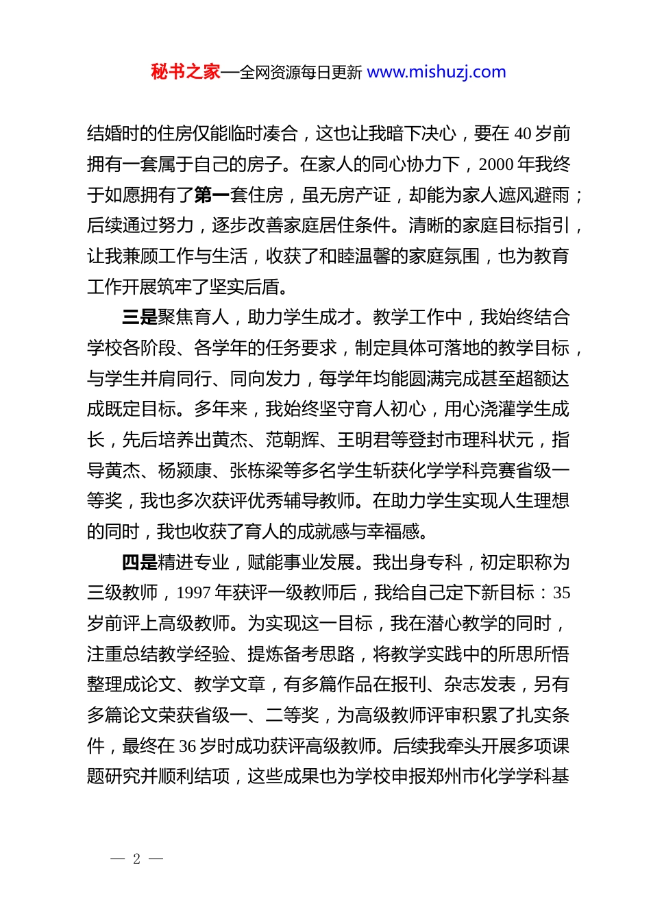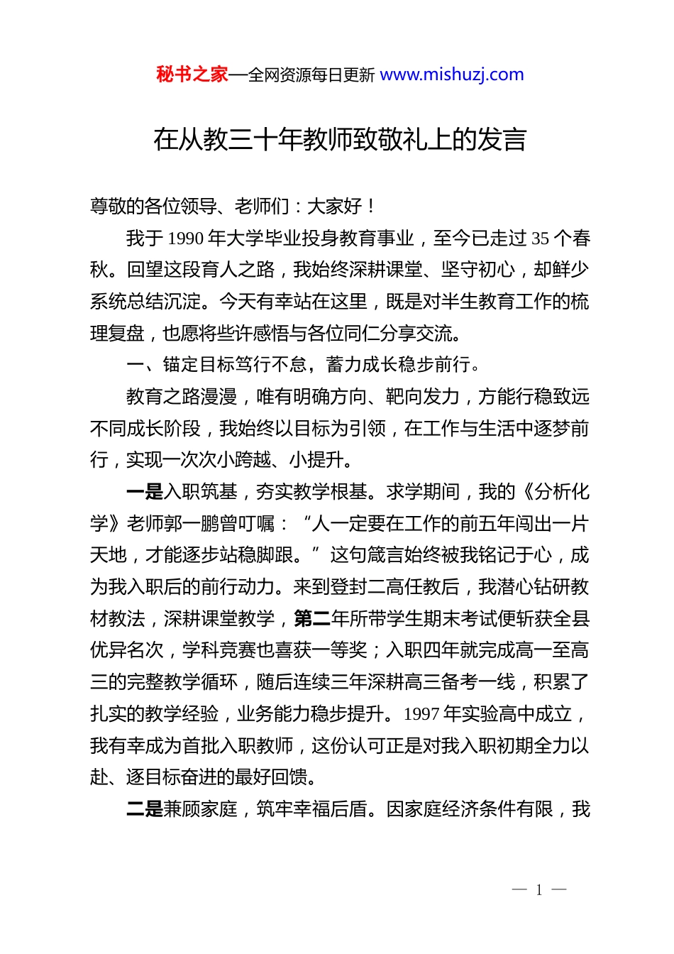 秘书之家—全网资源每日更新 www.mishuzj.com在从教三十年教师致敬礼上的发言尊敬的各位领导、老师们:大家好!我于 1990 年大学毕业投身教育事业,至今已走过 35 个春秋。回望这段育人之路,我始终深耕课堂、坚守初心,却鲜少系统总结沉淀。今天有幸站在这里,既是对半生教育工作的梳理复盘,也愿将些许感悟与各位同仁分享交流。一、锚定目标笃行不怠,蓄力成长稳步前行。教育之路漫漫,唯有明确方向、靶向发力,方能行稳致远不同成长阶段,我始终以目标为引领,在工作与生活中逐梦前行,实现一次次小跨越、小提升。一是入职筑基,夯实教学根基。求学期间,我的《分析化学》老师郭一鹏曾叮嘱:“人一定要在工作的前五年闯出一片天地,才能逐步站稳脚跟。”这句箴言始终被我铭记于心,成为我入职后的前行动力。来到登封二高任教后,我潜心钻研教材教法,深耕课堂教学,第二年所带学生期末考试便斩获全县优异名次,学科竞赛也喜获一等奖;入职四年就完成高一至高三的完整教学循环,随后连续三年深耕高三备考一线,积累了扎实的教学经验,业务能力稳步提升。1997 年实验高中成立,我有幸成为首批入职教师,这份认可正是对我入职初期全力以赴、逐目标奋进的最好回馈。二是兼顾家庭,筑牢幸福后盾。因家庭经济条件有限,我— 1 —秘书之家—全网资源每日更新 www.mishuzj.com结婚时的住房仅能临时凑合,这也让我暗下决心,要在 40 岁前拥有一套属于自己的房子。在家人的同心协力下,2000 年我终于如愿拥有了第一套住房,虽无房产证,却能为家人遮风避雨;后续通过努力,逐步改善家庭居住条件。清晰的家庭目标指引,让我兼顾工作与生活,收获了和睦温馨的家庭氛围,也为教育工作开展筑牢了坚实后盾。三是聚焦育人,助力学生成才。教学工作中,我始终结合学校各阶段、各学年的任务要求,制定具体可落地的教学目标,与学生并肩同行、同向发力,每学年均能圆满完成甚至超额达成既定目标。多年来,我始终坚守育人初心,用心浇灌学生成长,先后培养出黄杰、范朝辉、王明君等登封市理科状元,指导黄杰、杨颍康、张栋梁等多名学生斩获化学学科竞赛省级一等奖,我也多次获评优秀辅导教师。在助力学生实现人生理想的同时,我也收获了育人的成就感与幸福感。四是精进专业,赋能事业发展。我出身专科,初定职称为三级教师,1997 年获评一级教师后,我给自己定下新目标:35岁前评上高级教师。为实现这一目标,我在潜心教学的同时,注重总结教学经验、提炼备考思路,将教学实践中的所思所悟整理成论文、教学文章,有多篇作品在报刊、杂志发表,另有多篇论文荣获省级一、二等奖,为高级教师评审积累了扎实条件,最终在 36 岁时成功获评高级教师。后续我牵头开展多项课题研究并顺利结项,这些成果也为学校申报郑州市化学学科基— 2 —秘书之家—全网资源每日更新 www.mishuzj.com地、河南省级化学学科基地以及郑州市多样化办学材料提供了重要支撑,实现了个人专业成长与学校发展的同频共振。二、坚守育人初心使命,润物无声静待花开。三尺讲台系国运,一生秉烛铸师魂。35 年教学生涯中,我累计担任班主任 30 年,教室是我坚守的战场,课堂是我深耕的阵地,学生是我始终的牵挂。我虽不善言辞表达,却始终以真心换真心、以实干践初心,用点滴付出温暖学生心灵,用细微举动助力学生成长,真正践行“桃李不言,下自成蹊”的育人理念。在此,也想和各位老师分享两则我与学生的暖心故事。一则是“一句话温暖一颗心”。2012 届学生小张性格内敛、不善言辞,在校期间我们交流并不算多。毕业多年后重逢,他紧紧拉住我的手,激动地诉说着一件让他铭记至今的往事。原来当年一次考试后,他自己掏钱购买的书桌不慎丢失,着急地向我求助,希望能向学校申请再买一张。我深知,六七十元的书桌费用,对于一个农村家庭的孩子来说并非小数目。恰逢学校空教室有闲置书桌,我便安慰他:“别着急,我给你想想办法。”随后便带他找到一张闲置书桌,告诉他:“这张桌子你先用着,毕业时还给学校就行。”彼时的一句随口安慰、一个举手之劳,我早已淡忘,却没想到多年后仍被学生铭记于心,成为温暖他成长之...