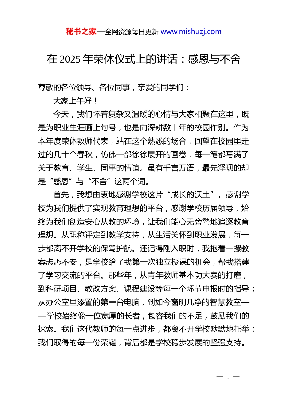 秘书之家—全网资源每日更新 www.mishuzj.com在 2025 年荣休仪式上的讲话:感恩与不舍尊敬的各位领导、各位同事,亲爱的同学们:大家上午好!今天,我们怀着复杂又温暖的心情与大家相聚在这里,既是为职业生涯画上句号,也是向深耕数十年的校园作别。作为本年度荣休教师代表,站在这个熟悉的场合,回望在校园里走过的几十个春秋,仿佛一部徐徐展开的画卷,每一笔都写满了关于教育、学生、同事的情谊。虽有千言万语,最先浮现的却是“感恩”与“不舍”这两个词。首先,我想由衷地感谢学校这片“成长的沃土”。感谢学校为我们提供了实现教育理想的平台,感谢学校历届领导,始终为我们创造安心从教的环境,让我们能心无旁骛地追逐教育理想。从职称评定到教学支持,从生活关怀到职业发展,每一步都离不开学校的保驾护航。还记得刚入职时,我抱着一摞教案忐忑不安,是学校给了我第一次独立授课的机会,帮我搭建了学习交流的平台。那些年,从青年教师基本功大赛的打磨,到科研项目、教改方案、课程建设等每一个环节申报时的指导;从办公室里添置的第一台电脑,到如今窗明几净的智慧教室——学校始终像一位宽厚的长者,包容我们的不足,鼓励我们的探索。我们这代教师的每一点进步,都离不开学校默默地托举;我们取得的每一份荣耀,背后都是学校稳步发展的坚强支持。— 1 —秘书之家—全网资源每日更新 www.mishuzj.com这份知遇之恩,我们会永远记在心里。也要向并肩多年的同事们道一声感谢,是你们在我们疲惫时搭把手,在我们困惑时提建议,让这份忙碌的工作始终充满温度。更要向一届又一届的学生道一声感谢,是你们的信任与成长,让我们感受到了教师职业最朴素的价值。那些藏在时光褶皱里的细碎过往,如今想来依旧鲜活。有学生在考试失利后找我们谈心,我们陪着他们分析问题、重拾信心;有毕业生带着录取通知书、工作 Offer 回来报喜,说“老师,当年您的一句话我记到现在”;也有和同事们一起备战教学竞赛的日子——为了打磨一堂优质课,我们反复试讲、互相提意见,甚至在食堂吃饭时都在讨论教学环节。更难忘的是学校不断的变迁:我们见证了学校的合并、升本,新教学楼、实训楼的拔地而起,见证了图书馆藏书从几万册增加到百余万册,见证了学校在学科专业建设、科研创新上一次次的突破。这份“与校同行”的成长经历,让我们早就把校园溶入进了血脉里,把朝夕相处的同事、学生当成了家人。那些一起攻克教学难题、一起为学科建设、专业发展并肩奋战的日子,都成了我们生命里最最温暖的注脚。今天我们即将告别讲台,但对教育的热爱不会褪色,对学校的牵挂不会减少。未来,我们会常常回“家”看看,看看熟悉的校园,听听年轻教师的课,为学校的发展尽一份力所能及的绵薄之力;也会在崭新的生活里拥抱健康、充实精神、定格— 2 —秘书之家—全网资源每日更新 www.mishuzj.com快乐,读一直没来得及读的好书,陪家人去向往已久的诗和远方,把曾经因工作忙碌而搁置的爱好再捡起来,把后来的日子过得精彩、惬意又闲适。最后,衷心祝愿我们的学校在未来的日子里,能够培养出更多栋梁之材,桃李满天下,在教育的征程上续写新的辉煌,期待早日更名升大;祝愿各位领导、同事们工作顺利、身体安康,家庭幸福;更祝愿年轻的老师们能够坚守初心、不负热爱,在三尺讲台上书写属于你们的精彩篇章!谢谢大家!— 3 —