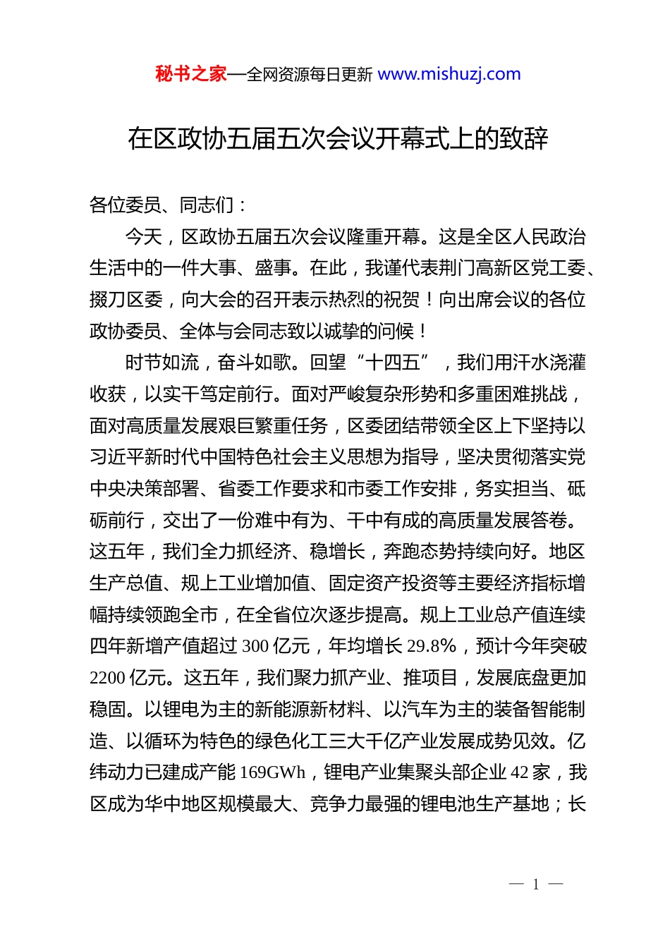 秘书之家—全网资源每日更新 www.mishuzj.com在区政协五届五次会议开幕式上的致辞各位委员、同志们:今天,区政协五届五次会议隆重开幕。这是全区人民政治生活中的一件大事、盛事。在此,我谨代表荆门高新区党工委、掇刀区委,向大会的召开表示热烈的祝贺!向出席会议的各位政协委员、全体与会同志致以诚挚的问候!时节如流,奋斗如歌。回望“十四五”,我们用汗水浇灌收获,以实干笃定前行。面对严峻复杂形势和多重困难挑战,面对高质量发展艰巨繁重任务,区委团结带领全区上下坚持以习近平新时代中国特色社会主义思想为指导,坚决贯彻落实党中央决策部署、省委工作要求和市委工作安排,务实担当、砥砺前行,交出了一份难中有为、干中有成的高质量发展答卷。这五年,我们全力抓经济、稳增长,奔跑态势持续向好。地区生产总值、规上工业增加值、固定资产投资等主要经济指标增幅持续领跑全市,在全省位次逐步提高。规上工业总产值连续四年新增产值超过 300 亿元,年均增长 29.8%,预计今年突破2200 亿元。这五年,我们聚力抓产业、推项目,发展底盘更加稳固。以锂电为主的新能源新材料、以汽车为主的装备智能制造、以循环为特色的绿色化工三大千亿产业发展成势见效。亿纬动力已建成产能 169GWh,锂电产业集聚头部企业 42 家,我区成为华中地区规模最大、竞争力最强的锂电池生产基地;长— 1 —秘书之家—全网资源每日更新 www.mishuzj.com城汽车实现从燃油车到新能源车再到智能网联车三大步升级改造,汽车产业集聚零部件企业 51 家;荆门石化“油转特”项目加快推进,即将成为全球领先、全国最大的特种油生产基地。荆门高新区入选全国首批、全省唯一国家级零碳园区建设名单。这五年,我们着力抓融合、补短板,城乡品质不断提高。建立健全“1+5+N”产城融合规划体系,锂电、汽车等产城融合片区基础设施和公共服务短板问题得到有效解决。累计改造老旧小区 105 个,惠及居民 3.7 万户。这五年,我们倾力抓民生、办实事,人民福祉显著提升。新建、改扩建学校 13 所,新增学位1.3 万个,建成 9 个公共卫生补短板项目。全区脱贫户和监测户无一人返贫致贫,就业帮扶车间模式在全省推广。全区实有人口突破 46 万人,比 2020 年净增 8.1 万人。这些成绩的取得,凝聚着区政协、广大政协委员以及社会各界人士的心血和汗水。一年来,区政协和广大政协委员始终坚持正确的政治方向,与区委同心同德、同向同行,认真履行政治协商、民主监督、参政议政职能,为全区高质量发展作出了重要贡献。一是服务发展大局彰显“政协担当”。区政协班子成员围绕招商引资、项目建设、企业服务等,主动担当、积极作为,全年带头外出招商引资 60 余次,协调解决企业运营及项目建设问题 50 余个,有力推动国际内陆港建设、产城融合和大气污染防治等重点任务落地落实。二是积极建言资政贡献“政协智慧”。广大政协委员察实情、建诤言、献良策,围绕— 2 —秘书之家—全网资源每日更新 www.mishuzj.com人口导入、未来产业发展等事关全局的重大课题,深入调研 50余次,形成了一批高质量的建议案和调研成果。三是创新履职实践打造“政协品牌”。探索打造“有事‘掇’协商”特色品牌,创新建立“一线微协商、基层重点协商、专题深度协商”的分层分类协商体系,全年开展基层协商和委员“双服务”主题活动 60 余次,助力解决基层群众急难愁盼问题 110 余件。四是广泛凝聚共识汇聚“政协力量”。充分发挥“重要阵地、重要平台、重要渠道”作用,全年各班子成员带队集中走访各民主党派和民族宗教界人士 100 余人次,及时反映各界群众诉求,汇聚了共同推进高质量发展的磅礴力量。区委对区政协和政协委员的工作是高度肯定的!在此,我代表荆门高新区党工委、掇刀区委,向大家表示衷心的感谢和崇高的敬意!各位委员、同志们!2026 年是“十五五”规划开局之年,做好各项工作责任重大、意义重大。前不久,区委召开五届十三次全会,确定了“勇当加快建设汉襄宜‘金三角’协同发展重要节点和全省支点建设重要增长极主力军,加快打造全国高质量发展先行区,奋力进入国家高新区第一方阵”...
