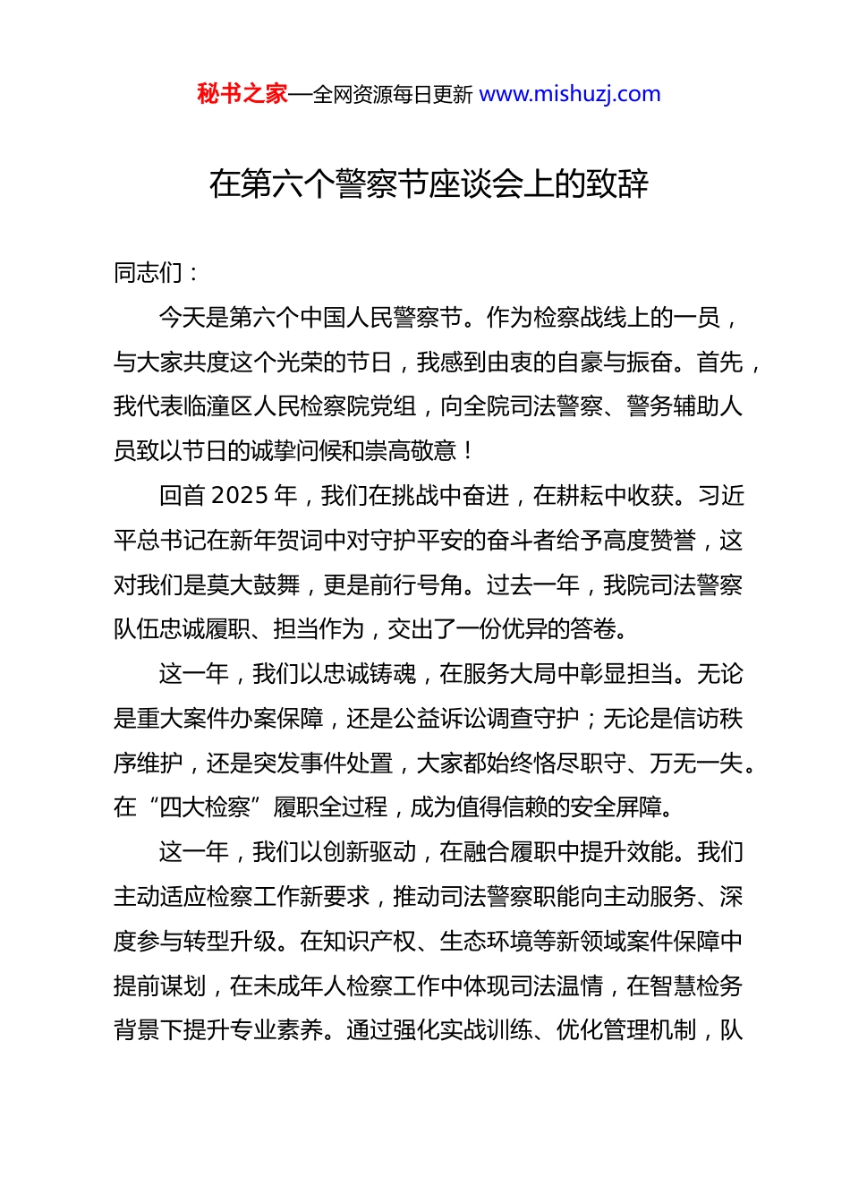 秘书之家—全网资源每日更新 www.mishuzj.com在第六个警察节座谈会上的致辞同志们:今天是第六个中国人民警察节。作为检察战线上的一员,与大家共度这个光荣的节日,我感到由衷的自豪与振奋。首先,我代表临潼区人民检察院党组,向全院司法警察、警务辅助人员致以节日的诚挚问候和崇高敬意!回首 2025 年,我们在挑战中奋进,在耕耘中收获。习近平总书记在新年贺词中对守护平安的奋斗者给予高度赞誉,这对我们是莫大鼓舞,更是前行号角。过去一年,我院司法警察队伍忠诚履职、担当作为,交出了一份优异的答卷。这一年,我们以忠诚铸魂,在服务大局中彰显担当。无论是重大案件办案保障,还是公益诉讼调查守护;无论是信访秩序维护,还是突发事件处置,大家都始终恪尽职守、万无一失。在“四大检察”履职全过程,成为值得信赖的安全屏障。这一年,我们以创新驱动,在融合履职中提升效能。我们主动适应检察工作新要求,推动司法警察职能向主动服务、深度参与转型升级。在知识产权、生态环境等新领域案件保障中提前谋划,在未成年人检察工作中体现司法温情,在智慧检务背景下提升专业素养。通过强化实战训练、优化管理机制,队秘书之家—全网资源每日更新 www.mishuzj.com伍的专业能力和保障水平持续提升。这一年,我们以严管厚爱,在锻造铁军中凝聚合力。我们坚持从严治警不放松,确保队伍纪律严明、作风过硬。同时,用心用情落实从优待警,积极帮助解决实际困难,大力选树宣传先进典型,营造了风清气正、干事创业的良好氛围。特别要向各位警属致敬,你们的理解与付出,是我们尽职尽责最坚实的后盾。同志们,习近平总书记深刻指出:“前方的路,有爬坡之艰,有闯关之难,但我们坚信,路虽远,行则将至。”站在新的起点,我们肩负的使命更加光荣,责任更加重大。特别是在司法责任制改革纵深推进的大背景下,精准把握工作定位、明晰着力方向,切实成为高质效办案的积极参与者、有力推动者、坚实保障者。希望同志们继续保持昂扬向上的精神状态和求真务实的工作作风,以更加坚定的信念、更加有力的举措、更加务实的行动,展现新作为、开创新局面。持续强化政治引领,筑牢忠诚警魂,深学细悟笃行习近平重要训词精神,让绝对忠诚、绝对纯洁、绝对可靠成为鲜明政治底色;持续提升业务能力,聚焦办案需求,加强实战化训练,不断提高履职尽责的专业化水平;持续锤炼过硬作风,严守纪律规矩,成为让党放心、让人民满意的警察铁军。新的一年,让我们满怀信心与期待,秘书之家—全网资源每日更新 www.mishuzj.com以忠诚履职的朝气、攻坚克难的锐气、清正廉洁的正气,锚定新目标,共赴新征程,携手并肩,勇毅前行,为建设更高水平的平安临潼、法治临潼贡献更大力量!最后,再次祝大家及警属们节日快乐、心有所悦、业有所成,万事皆可期!
