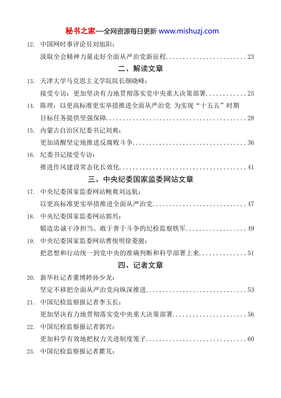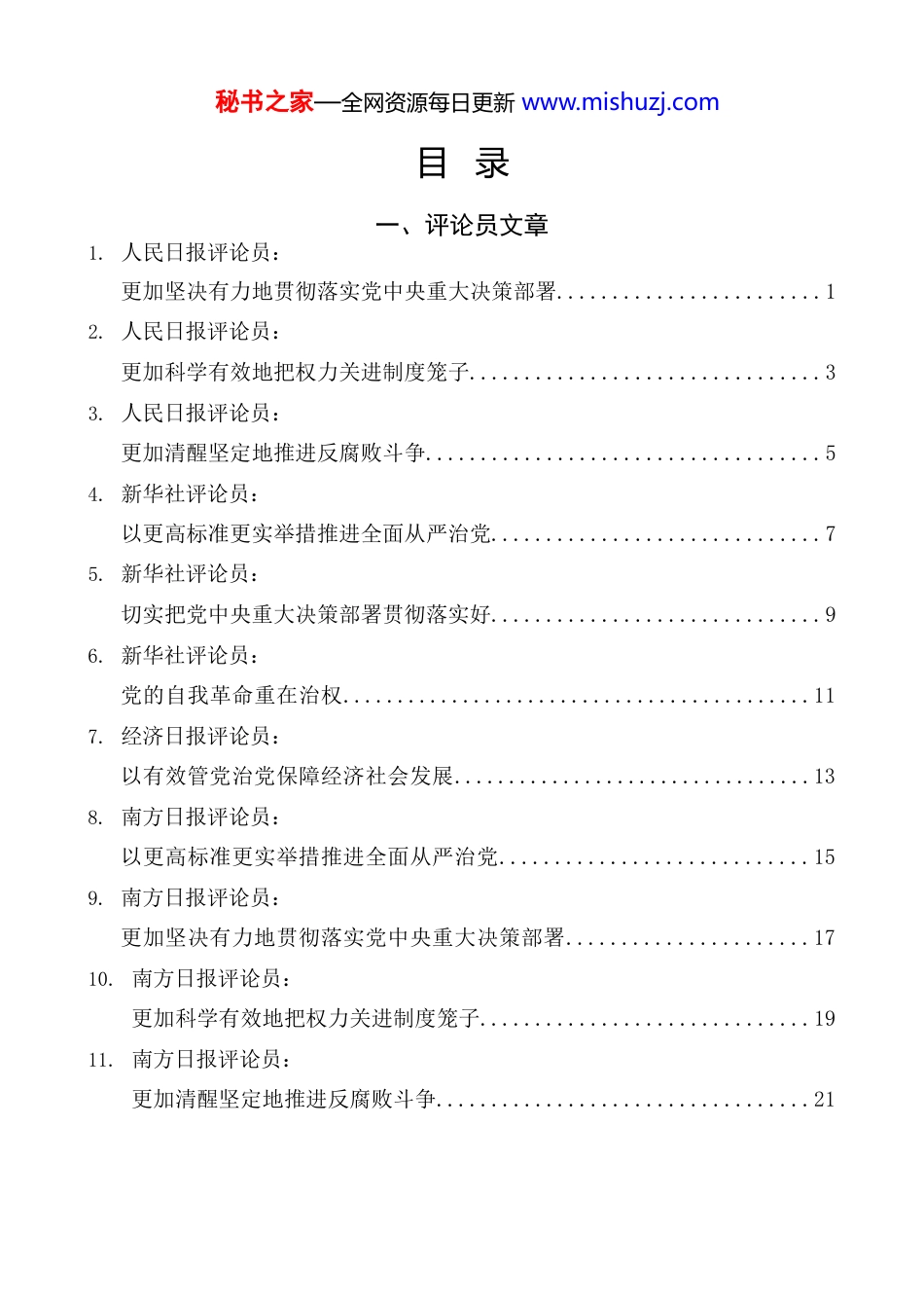 秘书之家—全网资源每日更新 www.mishuzj.com目 录1. 人民日报评论员: 一、评论员文章更加坚决有力地贯彻落实党中央重大决策部署........................1 2. 人民日报评论员: 更加科学有效地把权力关进制度笼子................................3 3. 人民日报评论员: 更加清醒坚定地推进反腐败斗争....................................5 4. 新华社评论员: 以更高标准更实举措推进全面从严治党..............................7 5. 新华社评论员: 切实把党中央重大决策部署贯彻落实好..............................9 6. 新华社评论员: 党的自我革命重在治权...........................................11 7. 经济日报评论员: 以有效管党治党保障经济社会发展.................................13 8. 南方日报评论员: 以更高标准更实举措推进全面从严治党............................15 9. 南方日报评论员: 更加坚决有力地贯彻落实党中央重大决策部署......................17 10. 南方日报评论员: 更加科学有效地把权力关进制度笼子..............................19 11. 南方日报评论员: 更加清醒坚定地推进反腐败斗争..................................21 秘书之家—全网资源每日更新 www.mishuzj.com12. 中国网时事评论员刘旭阳: 汲取全会精神力量走好全面从严治党新征程........................23 二、解读文章13. 天津大学马克思主义学院院长颜晓峰: 接受专访:更加坚决有力地贯彻落实党中央重大决策部署............25 14. 陈理:以更高标准更实举措推进全面从严治党 为实现“十五五”时期 目标任务提供坚强保障..........................................28 15. 内蒙古自治区纪委书记刘爽: 更加清醒坚定地推进反腐败斗争..................................36 16. 纪委书记接受专访: 推进作风建设常态化长效化......................................41 三、中央纪委国家监委网站文章17. 中央纪委国家监委网站鲍爽刘远航: 以更高标准更实举措推进全面从严治党............................47 18. 中央纪委国家监委网站郭兴: 锻造忠诚干净担当、敢于善于斗争的纪检监察铁军..................49 19. 中央纪委国家监委网站曹俊明徐菱骏: 把思想和行动统一到党中央的准确判断和科学部署上来..............51 四、记者文章20. 新华社记者董博婷孙少龙: 坚定不移把全面从严治党向纵深推进..............................53 21. 中国纪检监察报记者李玉长: 更加坚决有力地贯彻落实党中央重大决策部署......................56 22. 中国纪检监察报记者郭兴: 更加科学有效地把权力关进制度笼子..............................60 23. 中国纪检监察报记者瞿芃: 秘书之家—全网资源每日更新 www.mishuzj.com更加清醒坚定地推进反腐败斗争..................................64 24. 中国纪检监察报记者陆丽环: 巩固拓展深入贯彻中央八项规定精神学习教育成果..................68 25. 中国纪检监察报记者侯颗: 在一体推进“三不腐”上下更大功夫..............................83 26. 中国纪检监察报记者刘一霖: 织密扎牢管党治党制度笼子......................................85 27. 中国纪检监察报记者薛鹏李灵娜: 读懂二十届中央纪委五次全会公报中的新论断新部署................90 28. 中国纪检监察报记者瞿芃: 推进政治监督具体化精准化常态化................................96 五、其他文章29. 法治日报: 坚定不移把党的自我革命向纵深推进..............................98 30. 白鹭: “一把手”要带头执行制度.....................................101 31. 邱凌: 以“最彻底的自我革命”答好时代考卷..........................103 32. 郑寰: 在提高反腐败穿透力上下更大功夫..............................105 六、党的自我革命专题文章33. 民进中央主席蔡达峰: 学习自我革命精神坚持从严要求...........................