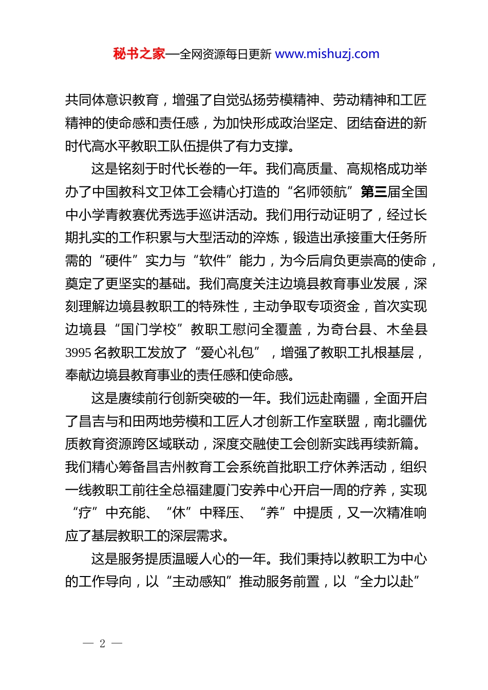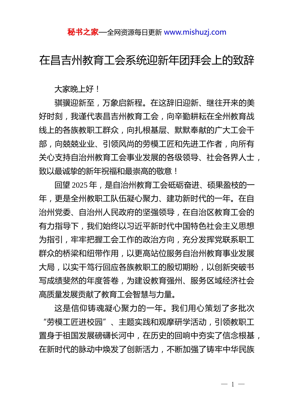 秘书之家—全网资源每日更新 www.mishuzj.com在昌吉州教育工会系统迎新年团拜会上的致辞大家晚上好!骐骥迎新至,万象启新程。在这辞旧迎新、继往开来的美好时刻,我谨代表昌吉州教育工会,向辛勤耕耘在全州教育战线上的各族教职工群众,向扎根基层、默默奉献的广大工会干部,向兢兢业业、引领风尚的劳模工匠和先进工作者,向所有关心支持自治州教育工会事业发展的各级领导、社会各界人士,致以最诚挚的新年祝福和最崇高的敬意!回望 2025 年,是自治州教育工会砥砺奋进、硕果盈枝的一年,更是全州教职工队伍凝心聚力、建功新时代的一年。在自治州党委、自治州人民政府的坚强领导,在自治区教育工会的有力指导下,我们始终以习近平新时代中国特色社会主义思想为指引,牢牢把握工会工作的政治方向,充分发挥党联系职工群众的桥梁和纽带作用,以更高站位服务自治州教育事业发展大局,以实干笃行回应各族教职工的殷切期盼,以创新突破书写成绩斐然的年度答卷,为建设教育强州、服务区域经济社会高质量发展贡献了教育工会智慧与力量。这是信仰铸魂凝心聚力的一年。我们用心策划了多批次“劳模工匠进校园”、主题实践和观摩研学活动,引领教职工置身于祖国发展磅礴长河中,在历史的回响中夯实了信念根基,在新时代的脉动中焕发了创新活力,不断加强了铸牢中华民族— 1 —秘书之家—全网资源每日更新 www.mishuzj.com共同体意识教育,增强了自觉弘扬劳模精神、劳动精神和工匠精神的使命感和责任感,为加快形成政治坚定、团结奋进的新时代高水平教职工队伍提供了有力支撑。这是铭刻于时代长卷的一年。我们高质量、高规格成功举办了中国教科文卫体工会精心打造的“名师领航”第三届全国中小学青教赛优秀选手巡讲活动。我们用行动证明了,经过长期扎实的工作积累与大型活动的淬炼,锻造出承接重大任务所需的“硬件”实力与“软件”能力,为今后肩负更崇高的使命,奠定了更坚实的基础。我们高度关注边境县教育事业发展,深刻理解边境县教职工的特殊性,主动争取专项资金,首次实现边境县“国门学校”教职工慰问全覆盖,为奇台县、木垒县3995 名教职工发放了“爱心礼包”,增强了教职工扎根基层,奉献边境县教育事业的责任感和使命感。这是赓续前行创新突破的一年。我们远赴南疆,全面开启了昌吉与和田两地劳模和工匠人才创新工作室联盟,南北疆优质教育资源跨区域联动,深度交融使工会创新实践再续新篇。我们精心筹备昌吉州教育工会系统首批职工疗休养活动,组织一线教职工前往全总福建厦门安养中心开启一周的疗养,实现“疗”中充能、“休”中释压、“养”中提质,又一次精准响应了基层教职工的深层需求。这是服务提质温暖人心的一年。我们秉持以教职工为中心的工作导向,以“主动感知”推动服务前置,以“全力以赴”— 2 —秘书之家—全网资源每日更新 www.mishuzj.com践行责任担当,从国门学校的坚守者,到中高考一线的奋战者;从万里援疆的奉献者,到内初班的引路者,我们努力将关怀精准送达,真正实现了服务不降温、关爱不断线、温暖可持续,切实做到了“四季恒温”。我们专注于教职工的身心健康,全年周密规划,分时段提供专题讲座、健康沙龙、瑜伽巡回课,“工企联动”分需求打造教职工康养基地、健康管理指导门店,逐步织密教职工职业生涯全过程的关怀网络,为打造充满活力的教职工队伍全力护航。2026 年是“十五五”规划的开局之年,是自治区成立 70 周年后的第一个奋进之年,更是自治州各级教育工会锚定新目标、扛起新使命、实现新作为的关键一年。站在新的历史起点,产业工人使命光荣,工会组织的责任重大。我们要以习近平新时代中国特色社会主义思想为指导,完整准确全面贯彻新时代党的治疆方略,引领全州各族教职工坚定不移听党话、矢志不渝跟党走;我们要在大格局战略中找准定位、扛起使命,聚焦自治州重点工作,搭建广阔的建功舞台,展现教职工饱满的劳动热情彰显主人翁的责任感;我们要以竭诚服务广大教职工为己任,持续深化和拓展服务品牌,用实实在在的行动践行“党有号召、工会有行动”的工作准则。同志们!征程万里风正劲,策马扬鞭再奋蹄。让我们更加紧密...
