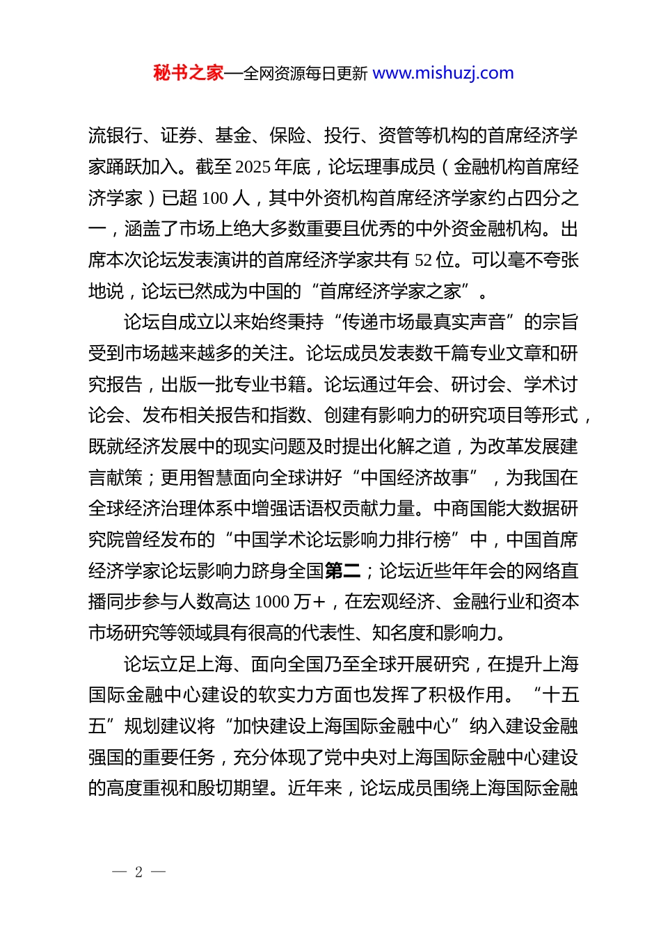 秘书之家—全网资源每日更新 www.mishuzj.com在 2026 中国首席经济学家论坛年会上的致辞新年伊始,万象更新。非常高兴与大家再次相聚在上海虹口区北外滩,共同迎来“2026 年中国首席经济学家论坛年会”的隆重召开。首先,我谨代表论坛向各位领导和嘉宾的到来表示热烈欢迎!并向中央有关部门、上海市政府、市委金融办、虹口区政府的长期关心和支持表示衷心的感谢!作为论坛发起创建的亲历者之一,我至今仍记忆犹新,曾任国务院副总理的刘鹤同志在论坛成立之初对论坛的殷切寄语——“贵在恒,望成为有较大影响力的智库”。中央财办分管日常工作的副主任韩文秀同志在论坛成立十周年之际,肯定论坛“在连接政策与市场、理论与实践中发挥了积极作用”,期盼论坛立足市场研究,为构建新发展格局、推动高质量发展贡献更多智慧。论坛成立以来,曾任上海市常务副市长的吴清同志对论坛工作给予了很大的关心、支持和帮助,多次亲临论坛年会指导,发表热情洋溢的致辞和演讲。正是在市委市政府的关心呵护和虹口区政府的鼎力支持下,中国首席经济学家论坛在 2016 年入驻虹口北外滩、2022 年成立上海首席经济学家金融发展中心,翻开了一页又一页崭新的发展篇章。经过十余年的发展,论坛已成为国内经济金融研究领域的一方重镇。作为非官方、非营利性、常年常设的经济与金融研究平台,论坛的影响力正持续扩大,吸引了越来越多海内外一— 1 —秘书之家—全网资源每日更新 www.mishuzj.com流银行、证券、基金、保险、投行、资管等机构的首席经济学家踊跃加入。截至 2025 年底,论坛理事成员(金融机构首席经济学家)已超 100 人,其中外资机构首席经济学家约占四分之一,涵盖了市场上绝大多数重要且优秀的中外资金融机构。出席本次论坛发表演讲的首席经济学家共有 52 位。可以毫不夸张地说,论坛已然成为中国的“首席经济学家之家”。论坛自成立以来始终秉持“传递市场最真实声音”的宗旨受到市场越来越多的关注。论坛成员发表数千篇专业文章和研究报告,出版一批专业书籍。论坛通过年会、研讨会、学术讨论会、发布相关报告和指数、创建有影响力的研究项目等形式,既就经济发展中的现实问题及时提出化解之道,为改革发展建言献策;更用智慧面向全球讲好“中国经济故事”,为我国在全球经济治理体系中增强话语权贡献力量。中商国能大数据研究院曾经发布的“中国学术论坛影响力排行榜”中,中国首席经济学家论坛影响力跻身全国第二;论坛近些年年会的网络直播同步参与人数高达 1000 万+,在宏观经济、金融行业和资本市场研究等领域具有很高的代表性、知名度和影响力。论坛立足上海、面向全国乃至全球开展研究,在提升上海国际金融中心建设的软实力方面也发挥了积极作用。“十五五”规划建议将“加快建设上海国际金融中心”纳入建设金融强国的重要任务,充分体现了党中央对上海国际金融中心建设的高度重视和殷切期望。近年来,论坛成员围绕上海国际金融— 2 —秘书之家—全网资源每日更新 www.mishuzj.com中心建设、科创金融等领域撰写、发表了多篇高质量的内参和研究报告;上海首席经济学家金融发展中心专门设立了离岸金融研究所,在深入研究的基础上定期发布离岸金融指数,有关成果受到相关领导的好评,引起了市场广泛关注和积极反响。本次年会以“承前启后建设强国”为主题,吸引了海内外一流银行、证券、基金、保险、投行、资管等机构的数十位首席经济学家,以及数百位官、产、学界和媒体的专家学者、行业翘楚齐聚于此。接下来的两天里,专家们将围绕国际政治经济形势、中国宏观经济预测与政策、经济高质量发展、新质生产力培育、现代化产业体系建设、资本市场发展与资产配置等重要议题开展深入交流与务实探讨;发表真知灼见、碰撞思想火花。我相信,通过这些分享与交流,一定能够更好地凝聚发展共识、理清发展思路、找准发展路径,为中国经济实现高质量发展提供前瞻性的决策参考与有力的专业赋能。最后,再次感谢与会领导、专家和同仁对论坛的关心和支持!预祝本次年会取得圆满成功!恭祝大家马年宏图大展、事业兴旺、幸福安康!谢谢!— 3 —