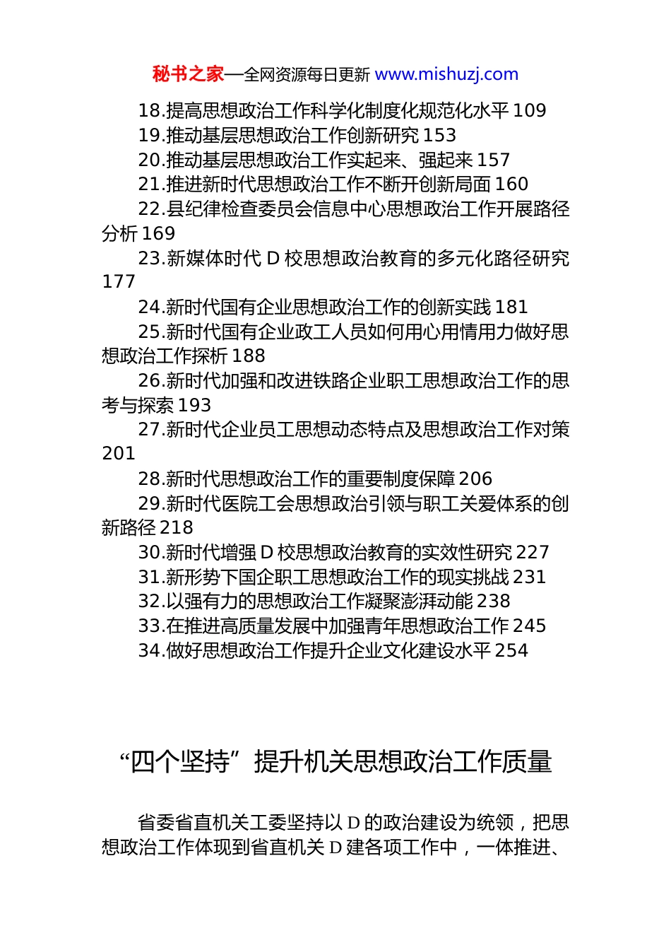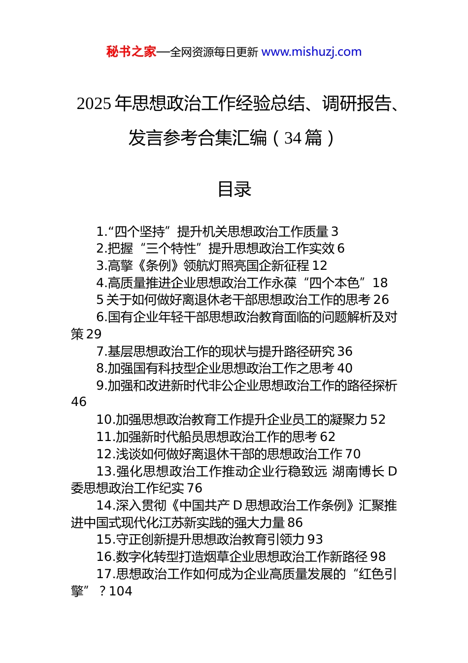 秘书之家—全网资源每日更新 www.mishuzj.com2025 年思想政治工作经验总结、调研报告、发言参考合集汇编(34 篇)目录1.“四个坚持”提升机关思想政治工作质量 32.把握“三个特性”提升思想政治工作实效 63.高擎《条例》领航灯照亮国企新征程 124.高质量推进企业思想政治工作永葆“四个本色”185 关于如何做好离退休老干部思想政治工作的思考 266.国有企业年轻干部思想政治教育面临的问题解析及对策 297.基层思想政治工作的现状与提升路径研究 368.加强国有科技型企业思想政治工作之思考 409.加强和改进新时代非公企业思想政治工作的路径探析4610.加强思想政治教育工作提升企业员工的凝聚力 5211.加强新时代船员思想政治工作的思考 6212.浅谈如何做好离退休干部的思想政治工作 7013.强化思想政治工作推动企业行稳致远 湖南博长 D委思想政治工作纪实 7614.深入贯彻《中国共产 D 思想政治工作条例》汇聚推进中国式现代化江苏新实践的强大力量 8615.守正创新提升思想政治教育引领力 9316.数字化转型打造烟草企业思想政治工作新路径 9817.思想政治工作如何成为企业高质量发展的“红色引擎”?104秘书之家—全网资源每日更新 www.mishuzj.com18.提高思想政治工作科学化制度化规范化水平 10919.推动基层思想政治工作创新研究 15320.推动基层思想政治工作实起来、强起来 15721.推进新时代思想政治工作不断开创新局面 16022.县纪律检查委员会信息中心思想政治工作开展路径分析 16923.新媒体时代 D 校思想政治教育的多元化路径研究17724.新时代国有企业思想政治工作的创新实践 18125.新时代国有企业政工人员如何用心用情用力做好思想政治工作探析 18826.新时代加强和改进铁路企业职工思想政治工作的思考与探索 19327.新时代企业员工思想动态特点及思想政治工作对策20128.新时代思想政治工作的重要制度保障 20629.新时代医院工会思想政治引领与职工关爱体系的创新路径 21830.新时代增强 D 校思想政治教育的实效性研究 22731.新形势下国企职工思想政治工作的现实挑战 23132.以强有力的思想政治工作凝聚澎湃动能 23833.在推进高质量发展中加强青年思想政治工作 24534.做好思想政治工作提升企业文化建设水平 254“四个坚持”提升机关思想政治工作质量省委省直机关工委坚持以 D 的政治建设为统领,把思想政治工作体现到省直机关 D 建各项工作中,一体推进、秘书之家—全网资源每日更新 www.mishuzj.com全面落实,以思想政治工作的高质量推动机关 D 建高质量发展。坚持政治引领,筑牢忠诚根基。把带头做到“两个维护”作为机关思想政治工作的首要任务,紧抓不放,持续用力。强化政治忠诚。采取专题 D 课、主题 D 日等形式,扎实开展政治机关意识教育,把“第一议题”制度执行情况纳入机关 D 建督查、考核重要内容,引导 D 员干部把讲政治体现到一言一行中。创建模范机关。把创建工作与推动发展结合起来,举办京津冀机关 D 建工作研讨活动,实施推动高质量发展当先锋专项行动,努力建设讲政治、守纪律、负责任、有效率的模范机关。提高政治能力。依托省直大讲堂进行辅导授课,举办处级干部政治能力提升培训班,发挥机关纪委日常监督作用,不断增强 D 员干部政治敏锐性和政治鉴别力。坚持凝心铸魂,深化理论武装。把学深悟透习近平新时代中国特色社会主义思想作为机关思想政治工作的重中之重,着力在深化内化转化上下功夫。列席旁听督促学。探索建立 D 组(D 委)理论学习中心组列席旁听机制,综合运用“听、看、谈”等方式,发现亮点,指出不足,督促提升学习质量。突出青年重点学。深入实施青年理论学习提升工程,推动省直机关成立 2000 多个青年理论学习小组,总结推广领导包联青年理论学习小组、青年干部列席中心组学习会等做法,引导青年干部学思践悟。丰富载体灵活学。开展让 D 的创新理论“飞入寻常百姓家”宣讲活动,组织优秀 D 务干部、青年代表到社区和高校进行答疑解惑。组织“感悟思想伟力、凝聚奋进力量”精品 D 课巡讲 23 场,受众 6000 余人。坚持守正创新,增强生机活力。结合省直机关实际,创新思想...