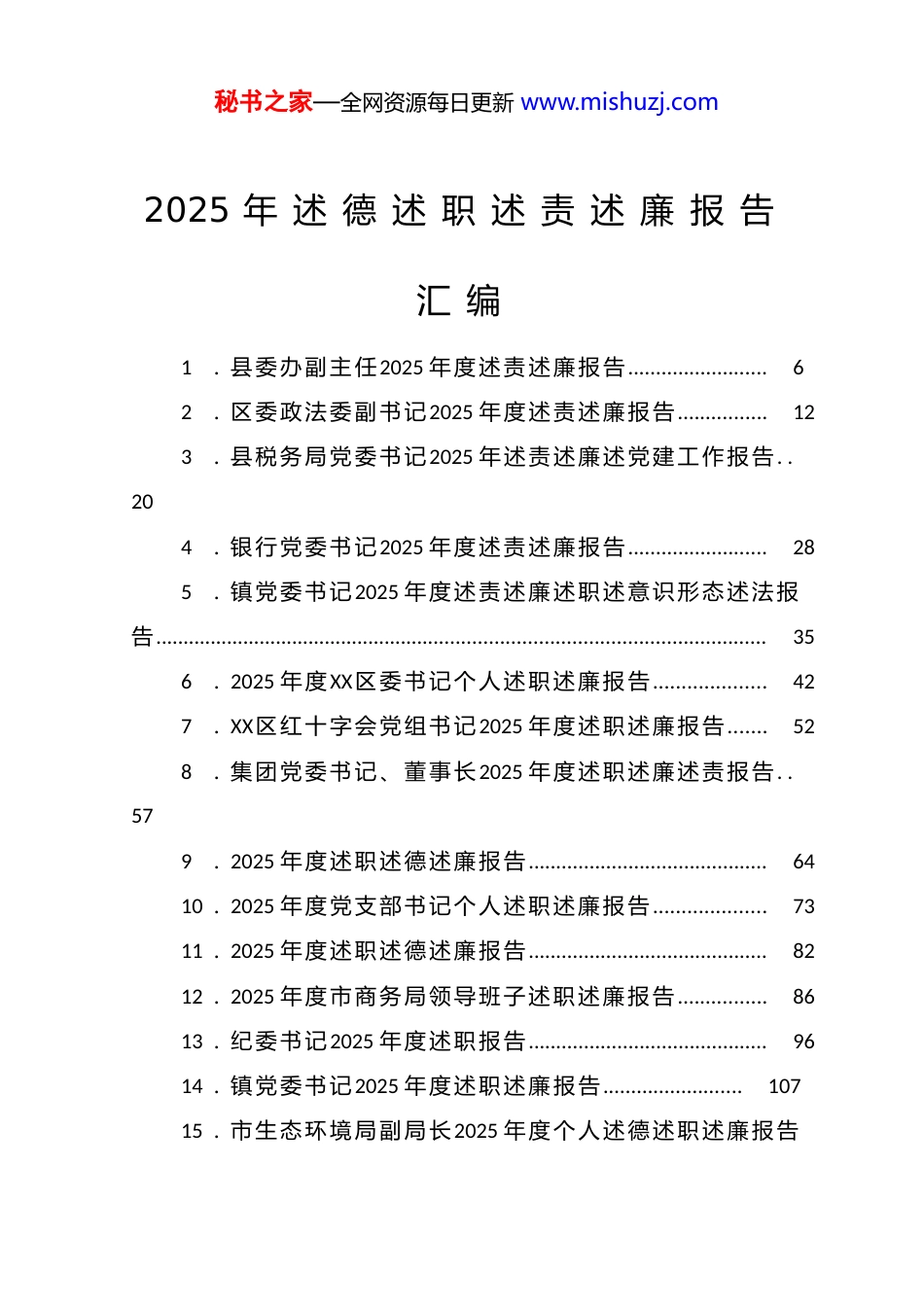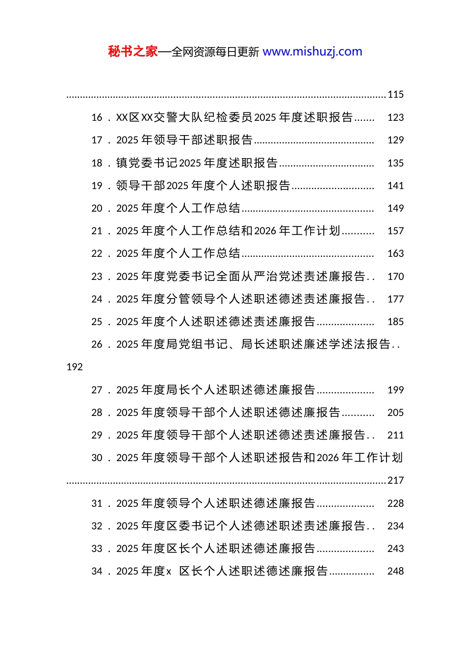 秘书之家—全网资源每日更新 www.mishuzj.com2025 年 述 德 述 职 述 责 述 廉 报 告汇 编1 .县委办副主任2025 年度述责述廉报告.........................62 .区委政法委副书记2025 年度述责述廉报告................123 .县税务局党委书记2025 年述责述廉述党建工作报告. .204 .银行党委书记2025 年度述责述廉报告.........................285 .镇党委书记2025 年度述责述廉述职述意识形态述法报告...............................................................................................................356 .2025 年度XX区委书记个人述职述廉报告....................427 .XX区红十字会党组书记2025 年度述职述廉报告.......528 .集团党委书记、董事长 2025 年度述职述廉述责报告. .579 .2025 年度述职述德述廉报告...........................................6410.2025 年度党支部书记个人述职述廉报告....................7311.2025 年度述职述德述廉报告...........................................8212.2025 年度市商务局领导班子述职述廉报告................8613.纪委书记2025 年度述职报告...........................................9614.镇党委书记2025 年度述职述廉报告.........................10715.市生态环境局副局长2025 年度个人述德述职述廉报告秘书之家—全网资源每日更新 www.mishuzj.com...................................................................................................................11516.XX区XX交警大队纪检委员2025 年度述职报告.......12317.2025 年领导干部述职报告...........................................12918.镇党委书记2025 年度述职报告..................................13519.领导干部2025 年度个人述职报告.............................14120.2025 年度个人工作总结...............................................14921.2025 年度个人工作总结和2026 年工作计划...........15722.2025 年度个人工作总结...............................................16323.2025 年度党委书记全面从严治党述责述廉报告 . .17024.2025 年度分管领导个人述职述德述责述廉报告 . .17725.2025 年度个人述职述德述责述廉报告....................18526.2025 年度局党组书记、局长述职述廉述学述法报告 . .19227.2025 年度局长个人述职述德述廉报告....................19928.2025 年度领导干部个人述职述德述廉报告...........20529.2025 年度领导干部个人述职述德述责述廉报告 . .21130.2025 年度领导干部个人述职述报告和 2026 年工作计划...................................................................................................................21731.2025 年度领导个人述职述德述廉报告....................22832.2025 年度区委书记个人述德述职述责述廉报告 . .23433.2025 年度区长个人述职述德述廉报告....................24334.2025 年度x 区长个人述职述德述廉报告................248秘书之家—全网资源每日更新 www.mishuzj.com35.2025 年度市委组织部部长述职述廉述德报告.......25736.2025 年度述学述职述廉述法报告.............................26537.2025 年度税务局党组织书记述职述廉报告...........27038.2025 年度县级副职个人述学述职述责述廉报告 . .27739.2025 年度县纪委书记、监委主任个人述学述职述责述廉报告.................................................................................................28140.2025 年度县教育局党组书记个人述职述责述廉述学报告..........................................................................................................28641.2025 年度县领导干部个人述职述德述廉报告.......29242.2025 年度县人大常委会主任个人述职述责述廉报告 . .29743.2025 年度县委...