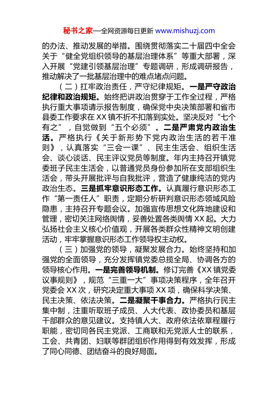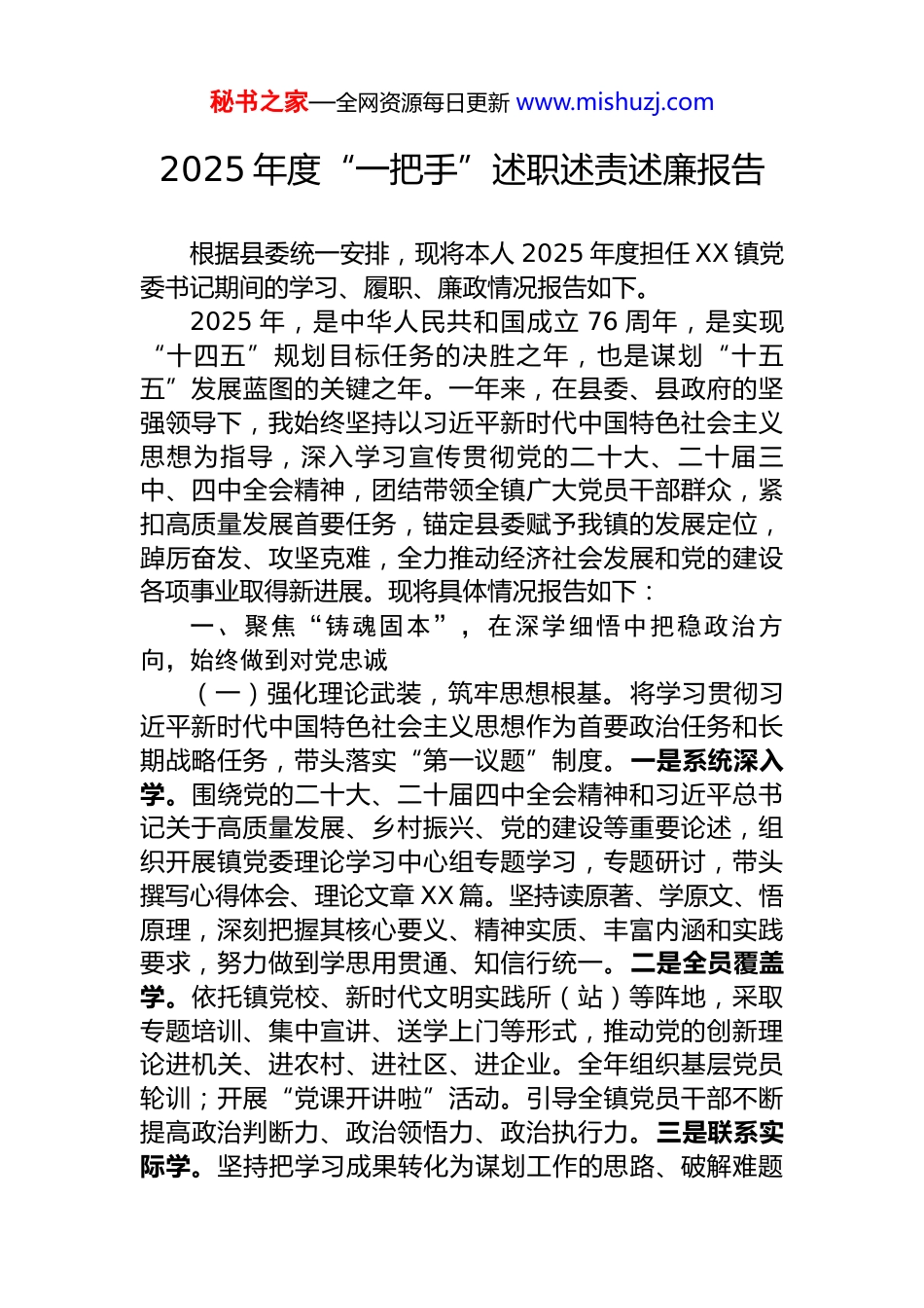 秘书之家—全网资源每日更新 www.mishuzj.com2025 年度“一把手”述职述责述廉报告根据县委统一安排,现将本人 2025 年度担任 XX 镇党委书记期间的学习、履职、廉政情况报告如下。2025 年,是中华人民共和国成立 76 周年,是实现“十四五”规划目标任务的决胜之年,也是谋划“十五五”发展蓝图的关键之年。一年来,在县委、县政府的坚强领导下,我始终坚持以习近平新时代中国特色社会主义思想为指导,深入学习宣传贯彻党的二十大、二十届三中、四中全会精神,团结带领全镇广大党员干部群众,紧扣高质量发展首要任务,锚定县委赋予我镇的发展定位,踔厉奋发、攻坚克难,全力推动经济社会发展和党的建设各项事业取得新进展。现将具体情况报告如下:一、聚焦“铸魂固本”,在深学细悟中把稳政治方向,始终做到对党忠诚(一)强化理论武装,筑牢思想根基。将学习贯彻习近平新时代中国特色社会主义思想作为首要政治任务和长期战略任务,带头落实“第一议题”制度。一是系统深入学。围绕党的二十大、二十届四中全会精神和习近平总书记关于高质量发展、乡村振兴、党的建设等重要论述,组织开展镇党委理论学习中心组专题学习,专题研讨,带头撰写心得体会、理论文章 XX 篇。坚持读原著、学原文、悟原理,深刻把握其核心要义、精神实质、丰富内涵和实践要求,努力做到学思用贯通、知信行统一。二是全员覆盖学。依托镇党校、新时代文明实践所(站)等阵地,采取专题培训、集中宣讲、送学上门等形式,推动党的创新理论进机关、进农村、进社区、进企业。全年组织基层党员轮训;开展“党课开讲啦”活动。引导全镇党员干部不断提高政治判断力、政治领悟力、政治执行力。三是联系实际学。坚持把学习成果转化为谋划工作的思路、破解难题秘书之家—全网资源每日更新 www.mishuzj.com的办法、推动发展的举措。围绕贯彻落实二十届四中全会关于“健全党组织领导的基层治理体系”等重大部署,深入开展“党建引领基层治理”专题调研,形成调研报告,推动解决了一批基层治理中的难点堵点问题。(二)扛牢政治责任,严守纪律规矩。一是严守政治纪律和政治规矩。始终把讲政治贯穿于工作全过程,严格执行重大事项请示报告制度,确保党中央决策部署和省市县委工作要求在 XX 镇不折不扣落到实处。坚决反对“七个有之”,自觉做到“五个必须”。二是严肃党内政治生活。严格执行《关于新形势下党内政治生活的若干准则》,认真落实“三会一课”、民主生活会、组织生活会、谈心谈话、民主评议党员等制度。年内主持召开镇党委班子民主生活会,以普通党员身份参加所在支部组织生活会,带头开展批评与自我批评,营造了健康纯洁的党内政治生态。三是抓牢意识形态工作。认真履行意识形态工作“第一责任人”职责,定期分析研判意识形态领域风险隐患,主持召开专题会议。加强宣传思想文化阵地建设和管理,密切关注网络舆情,妥善处置各类舆情 XX 起。大力弘扬社会主义核心价值观,开展各类群众性精神文明创建活动,牢牢掌握意识形态工作领导权主动权。(三)加强党的领导,凝聚发展合力。始终坚持和加强党的全面领导,充分发挥镇党委总揽全局、协调各方的领导核心作用。一是完善领导机制。修订完善《XX 镇党委议事规则》,规范“三重一大”事项决策程序,全年召开党委会 XX 次,研究决定重大事项 XX 项,确保科学决策、民主决策、依法决策。二是凝聚干事合力。严格执行民主集中制,注重听取班子成员、人大代表、政协委员和基层干部群众的意见建议。支持镇人大、政府依法依章程履行职能,密切同各民主党派、工商联和无党派人士的联系,工会、共青团、妇联等群团组织作用得到有效发挥,形成了同心同德、团结奋斗的良好局面。秘书之家—全网资源每日更新 www.mishuzj.com二、聚焦“主责主业”,在担当实干中推动高质量发展,竭力增进民生福祉(一)全力以赴抓经济、促发展,综合实力稳步提升。一是经济运行稳中有进。面对复杂严峻的宏观经济形势,加强经济运行调度分析,主要经济指标保持在合理区间。二是产业发展提质增效。坚决扛牢粮食安全政治责任,落实最严格的耕地保护制度。三是营商环境持续优化...