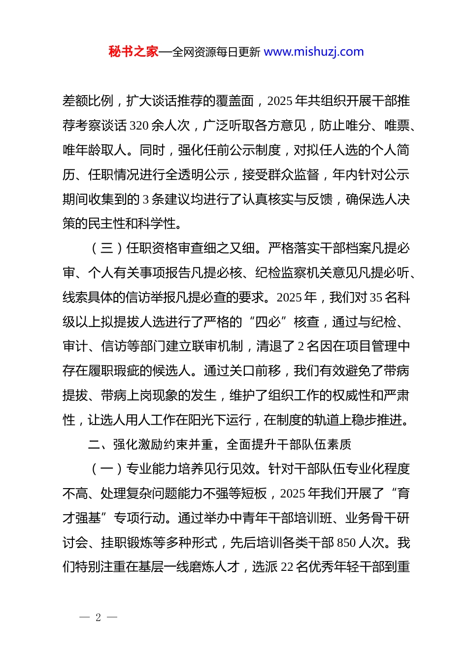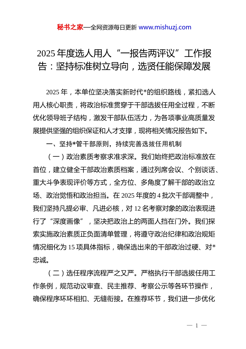 秘书之家—全网资源每日更新 www.mishuzj.com2025 年度选人用人“一报告两评议”工作报告:坚持标准树立导向,选贤任能保障发展2025 年,本单位坚决落实新时代*的组织路线,紧扣选人用人核心职责,将政治标准贯穿于干部选拔任用全过程,不断优化领导班子结构,激发干部队伍活力,为各项事业高质量发展提供坚强的组织保证和人才支撑,现将相关情况报告如下。一、坚持*管干部原则,持续完善选拔任用机制(一)政治素质考察求准求深。我们始终把政治标准放在首位,建立健全干部政治素质档案,通过列席会议、个别谈话、重大斗争表现评价等方式,全方位、多角度了解干部的政治立场、政治觉悟和政治担当。在 2025 年度的 4 批次干部调整中,我们坚持凡提必审、凡进必核,对 12 名考察对象的政治表现进行了“深度画像”,坚决把政治上的两面人挡在门外。我们探索实施政治素质正负面清单管理,将遵守政治纪律和政治规矩情况细化为 15 项具体指标,确保选出来的干部政治过硬、对*忠诚。(二)选任程序流程严之又严。严格执行干部选拔任用工作条例,规范动议审查、民主推荐、考察公示等各环节操作,确保程序环环相扣、无缝衔接。在推荐环节,我们进一步优化— 1 —秘书之家—全网资源每日更新 www.mishuzj.com差额比例,扩大谈话推荐的覆盖面,2025 年共组织开展干部推荐考察谈话 320 余人次,广泛听取各方意见,防止唯分、唯票、唯年龄取人。同时,强化任前公示制度,对拟任人选的个人简历、任职情况进行全透明公示,接受群众监督,年内针对公示期间收集到的 3 条建议均进行了认真核实与反馈,确保选人决策的民主性和科学性。(三)任职资格审查细之又细。严格落实干部档案凡提必审、个人有关事项报告凡提必核、纪检监察机关意见凡提必听、线索具体的信访举报凡提必查的要求。2025 年,我们对 35 名科级以上拟提拔人选进行了严格的“四必”核查,通过与纪检、审计、信访等部门建立联审机制,清退了 2 名因在项目管理中存在履职瑕疵的候选人。通过关口前移,我们有效避免了带病提拔、带病上岗现象的发生,维护了组织工作的权威性和严肃性,让选人用人工作在阳光下运行,在制度的轨道上稳步推进。二、强化激励约束并重,全面提升干部队伍素质(一)专业能力培养见行见效。针对干部队伍专业化程度不高、处理复杂问题能力不强等短板,2025 年我们开展了“育才强基”专项行动。通过举办中青年干部培训班、业务骨干研讨会、挂职锻炼等多种形式,先后培训各类干部 850 人次。我们特别注重在基层一线磨炼人才,选派 22 名优秀年轻干部到重— 2 —秘书之家—全网资源每日更新 www.mishuzj.com点工程、乡村振兴和信访维稳岗位进行实战历练,让他们在摸爬滚打中增长才干。这种“课堂教学+基地实践”的双轨模式,有效解决了干部本领恐慌问题,提升了全员履职尽责的硬实力。(二)考核评价体系做实做优。构建平时考核、专项考核、年度考核“三位一体”的评价格局,改变以往一张考卷定终身的做法。2025 年,我们细化了关键业绩指标(kpi)考核方案,将单位核心任务分解到岗、责任到人,实行季度积分排名制度。对于在急难险重任务中表现突出的 5 个集体和 18 名个人给予通报表扬和职级晋升倾斜;对于考核结果排名末位的 3 名干部进行诫勉谈话,督促其限期整改。通过差异化、具象化的考核,真正实现了干好干坏不一样,有效解决了干多干少一个样的消极倾向。(三)容错纠错机制抓严抓实。为了让干部卸下包袱、轻装上阵,我们进一步细化了容错纠错实施办法,明确了 8 类可以容错的情形,坚决为担当者担当、为负责者负责。在 2025 年的审计调查中,对于 2 名因制度创新探索中出现非主观偏差的干部,经组织认定给予容错免责,不影响其评优评先。同时,我们坚持回访教育制度,对受处分影响期满的干部进行综合评估,对 1 名表现优秀的受处分干部依规重新启用。这种温情与原则并存的管理方式,极大地保护了广大干部敢闯敢试的创新— 3 —秘书之家—全网资源每日更新 www.mishuzj.com积极性。三、严抓选人用人监督,营造风清气正政治生态(一)专项检查整治有力有...