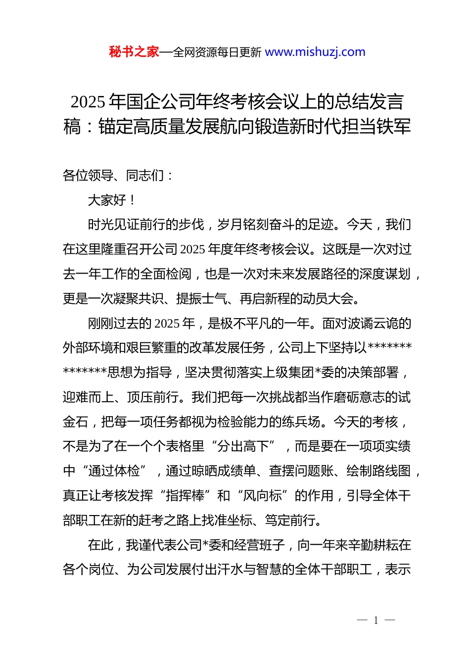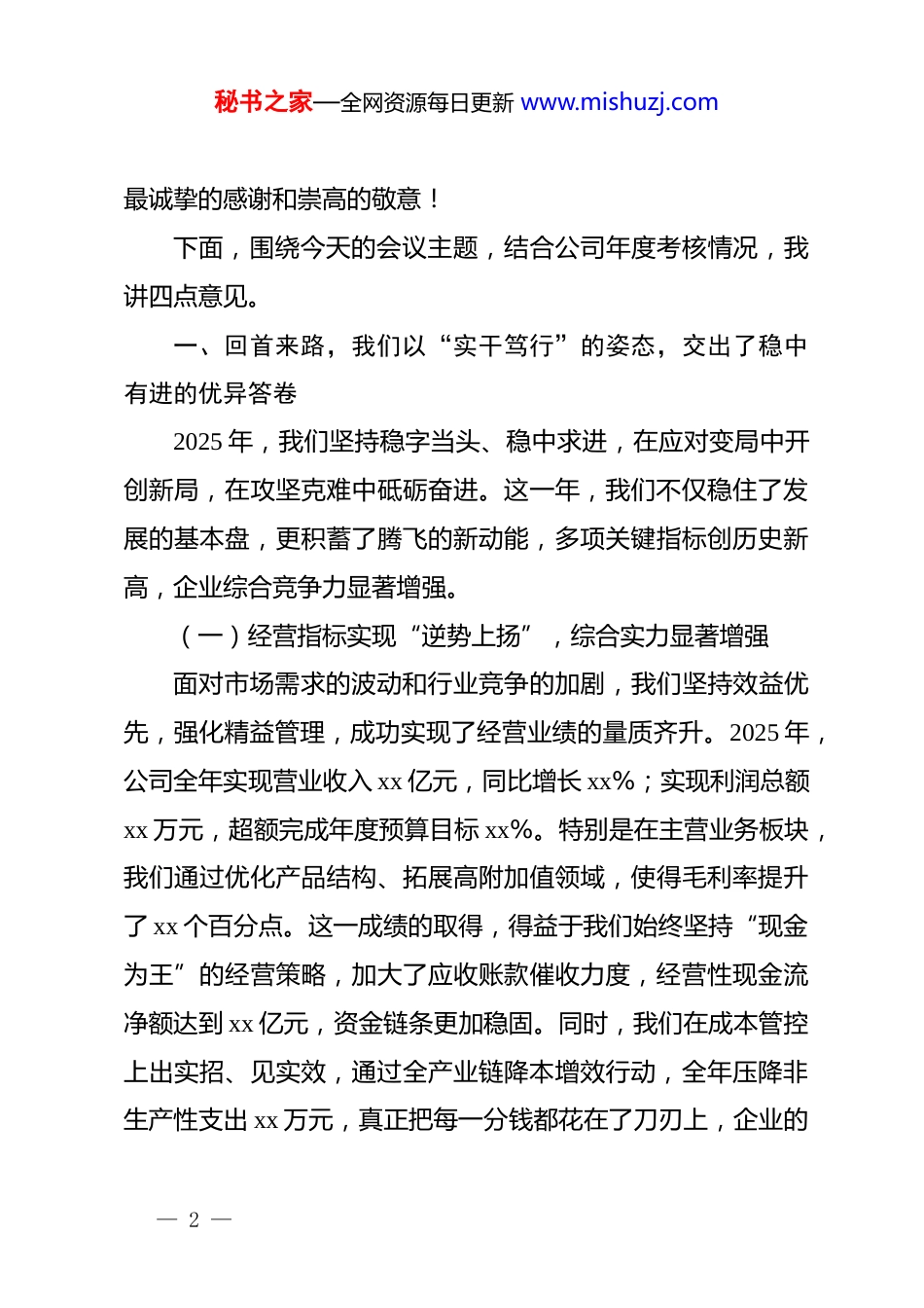 秘书之家—全网资源每日更新 www.mishuzj.com2025 年国企公司年终考核会议上的总结发言稿:锚定高质量发展航向锻造新时代担当铁军各位领导、同志们:大家好!时光见证前行的步伐,岁月铭刻奋斗的足迹。今天,我们在这里隆重召开公司 2025 年度年终考核会议。这既是一次对过去一年工作的全面检阅,也是一次对未来发展路径的深度谋划,更是一次凝聚共识、提振士气、再启新程的动员大会。刚刚过去的 2025 年,是极不平凡的一年。面对波谲云诡的外部环境和艰巨繁重的改革发展任务,公司上下坚持以**************思想为指导,坚决贯彻落实上级集团*委的决策部署,迎难而上、顶压前行。我们把每一次挑战都当作磨砺意志的试金石,把每一项任务都视为检验能力的练兵场。今天的考核,不是为了在一个个表格里“分出高下”,而是要在一项项实绩中“通过体检”,通过晾晒成绩单、查摆问题账、绘制路线图,真正让考核发挥“指挥棒”和“风向标”的作用,引导全体干部职工在新的赶考之路上找准坐标、笃定前行。在此,我谨代表公司*委和经营班子,向一年来辛勤耕耘在各个岗位、为公司发展付出汗水与智慧的全体干部职工,表示— 1 —秘书之家—全网资源每日更新 www.mishuzj.com最诚挚的感谢和崇高的敬意!下面,围绕今天的会议主题,结合公司年度考核情况,我讲四点意见。一、回首来路,我们以“实干笃行”的姿态,交出了稳中有进的优异答卷2025 年,我们坚持稳字当头、稳中求进,在应对变局中开创新局,在攻坚克难中砥砺奋进。这一年,我们不仅稳住了发展的基本盘,更积蓄了腾飞的新动能,多项关键指标创历史新高,企业综合竞争力显著增强。(一)经营指标实现“逆势上扬”,综合实力显著增强面对市场需求的波动和行业竞争的加剧,我们坚持效益优先,强化精益管理,成功实现了经营业绩的量质齐升。2025 年,公司全年实现营业收入 xx 亿元,同比增长 xx%;实现利润总额xx 万元,超额完成年度预算目标 xx%。特别是在主营业务板块,我们通过优化产品结构、拓展高附加值领域,使得毛利率提升了 xx 个百分点。这一成绩的取得,得益于我们始终坚持“现金为王”的经营策略,加大了应收账款催收力度,经营性现金流净额达到 xx 亿元,资金链条更加稳固。同时,我们在成本管控上出实招、见实效,通过全产业链降本增效行动,全年压降非生产性支出 xx 万元,真正把每一分钱都花在了刀刃上,企业的— 2 —秘书之家—全网资源每日更新 www.mishuzj.com抗风险能力和造血功能得到了实质性提升。(二)深化改革激活“一池春水”,内生动力持续迸发改革是国有企业发展的关键一招。过去一年,我们以国企改革深化提升行动为抓手,动真碰硬破除体制机制障碍,让创造活力竞相迸发。我们全面推行经理层成员任期制和契约化管理,刚性兑现薪酬奖惩,真正实现了管理人员“能上能下”、员工“能进能出”、收入“能增能减”。在三项制度改革方面,我们不仅建立了以业绩为导向的宽带薪酬体系,还大胆启用了xx 名年轻干部走上关键管理岗位,干部队伍的平均年龄下降了xx 岁,学历结构大幅优化。通过推行“揭榜挂帅”和“赛马机制”,公司内部形成了比学赶超的浓厚氛围,xx 个重点攻关项目提前完成,改革红利正在加速转化为发展红利,企业治理体系和治理能力现代化水平迈上了新台阶。(三)dj 引领筑牢“红色堡垒”,政治生态风清气正我们始终坚持*的领导不动摇,把*的建设融入公司治理各环节,以高质量 dj 引领保障高质量发展。2025 年,我们深入推进“dj+业务”深度融合模式,在重点项目一线设立了 xx 个*员先锋岗和 xx 个红旗责任区,让*旗在攻坚克难的最前沿高高飘扬。我们扎实开展 dj 学习教育,持之以恒纠治“四风”,特别是针对工程建设、物资采购等关键领域,开展了 xx 轮专项巡察— 3 —秘书之家—全网资源每日更新 www.mishuzj.com整改,建立健全廉洁风险防控机制 xx 项。通过常态化的警示教育和谈心谈话,*员干部的规矩意识和纪律观念明显增强,风清气正的政治生态进一步巩固,为企业的健康可持续发展提供了坚强的政治保障和组织保证。二、审视当下,我们以“刀刃向内”...