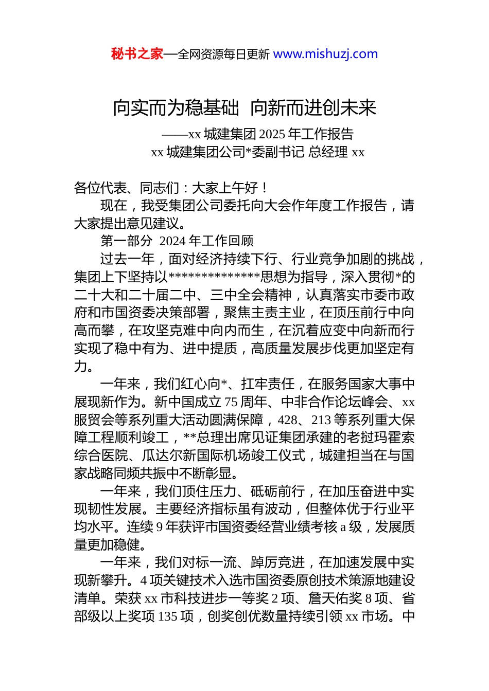 秘书之家—全网资源每日更新 www.mishuzj.com向实而为稳基础 向新而进创未来——xx 城建集团 2025 年工作报告xx 城建集团公司*委副书记 总经理 xx各位代表、同志们:大家上午好!现在,我受集团公司委托向大会作年度工作报告,请大家提出意见建议。第一部分 2024 年工作回顾过去一年,面对经济持续下行、行业竞争加剧的挑战,集团上下坚持以**************思想为指导,深入贯彻*的二十大和二十届二中、三中全会精神,认真落实市委市政府和市国资委决策部署,聚焦主责主业,在顶压前行中向高而攀,在攻坚克难中向内而生,在沉着应变中向新而行实现了稳中有为、进中提质,高质量发展步伐更加坚定有力。一年来,我们红心向*、扛牢责任,在服务国家大事中展现新作为。新中国成立 75 周年、中非合作论坛峰会、xx服贸会等系列重大活动圆满保障,428、213 等系列重大保障工程顺利竣工,**总理出席见证集团承建的老挝玛霍索综合医院、瓜达尔新国际机场竣工仪式,城建担当在与国家战略同频共振中不断彰显。一年来,我们顶住压力、砥砺前行,在加压奋进中实现韧性发展。主要经济指标虽有波动,但整体优于行业平均水平。连续 9 年获评市国资委经营业绩考核 a 级,发展质量更加稳健。一年来,我们对标一流、踔厉竞进,在加速发展中实现新攀升。4 项关键技术入选市国资委原创技术策源地建设清单。荣获 xx 市科技进步一等奖 2 项、詹天佑奖 8 项、省部级以上奖项 135 项,创奖创优数量持续引领 xx 市场。中秘书之家—全网资源每日更新 www.mishuzj.com国企业 500 强、enr 全球最大承包商集团排名分别前进 6 位、1 位,企业影响力持续攀升。一年来,我们强根铸魂、凝心聚力,在 dj 引领中彰显新气象。立足新时代国企 dj 目标要求,牢固树立和践行正确政绩观,*的领导*的建设持续加强,思想政治引领不断强化,巡视巡察整改落地见效,dj 学习教育扎实开展,dj 成效不断转化为引领和推动集团高质量发展的强大内生动力。回顾一年来,重点做了以下几方面工作:一、优布局强产品,产业规模保持稳健增长全力拼市场,“十大举措”落地起效,高端化、专业化、区域化、特色化发展有效推进,市场潜力加速释放,产业集群、产品集群、区域集群不断扩大。市场布局成效渐显。京内区域积厚成势,新签合同额1096 亿元、增长 29%,市场首位度持续提升。全产业链深化政企合作,房山区、海淀区新签合同额突破百亿。深度服务大客户,大客户新签合同额 1049 亿元。京外区域潜能加速释放,河北、山东新签合同额突破百亿,江苏、**、浙江新签合同额超 50 亿元;境外新签合同额 62 亿元、增长22%,战略区域集群规模不断壮大。战略产品扩容增量。持续深耕机场、生态环保、医疗康养、轨道交通等专业领域,公建、市政工程新签合同额1060 亿元,占工程板块比重 57%,产品结构更为优良。新签昆明长水国际机场、济宁高接庄污水处理厂、儿研所通州院区、108 新线高速、地铁 m101 线等优势产品,实现新签合同额 387 亿元、增长 61%。城市更新、水利水电、数据中心等新领域新签合同额 298 亿元,产品优势不断释放。超5 亿元大项目新签合同额 1084 亿元,增长 14%。二、筑精品塑品牌,工程产品服务优质履约坚持精益管理,法人管项目在实践中逐步落地,生产要素统筹保障更加优化,全过程管控更加规范,集团工程产品服务全面优质履约。秘书之家—全网资源每日更新 www.mishuzj.com工程建设提速提质。26 项 xx 市“3 个 100”重点工程按期竣工。香港机场等 8 大在建机场高效推进,安贞医院通州院区等 4 大医院建成投用,安定循环经济园等 6 项生态环保工程按期竣工,城市副中心站综合交通枢纽等 5 大枢纽工程快速推进,xx12 号线等 4 条轨道交通线路开通运营,房山、门头沟 60 项灾后重建任务高质量推进。全产业链融入城市更新领域,南中轴国际文化科技园二期开园,滨河里项目获评城市更新优秀案例,中关村东区改造正式开工。产品服务提标提效。在售地产全力保交付,7000 余户居民喜迁新居。设计业务全力保开通,xx 地铁 3 号线等 8条轨道交通总...