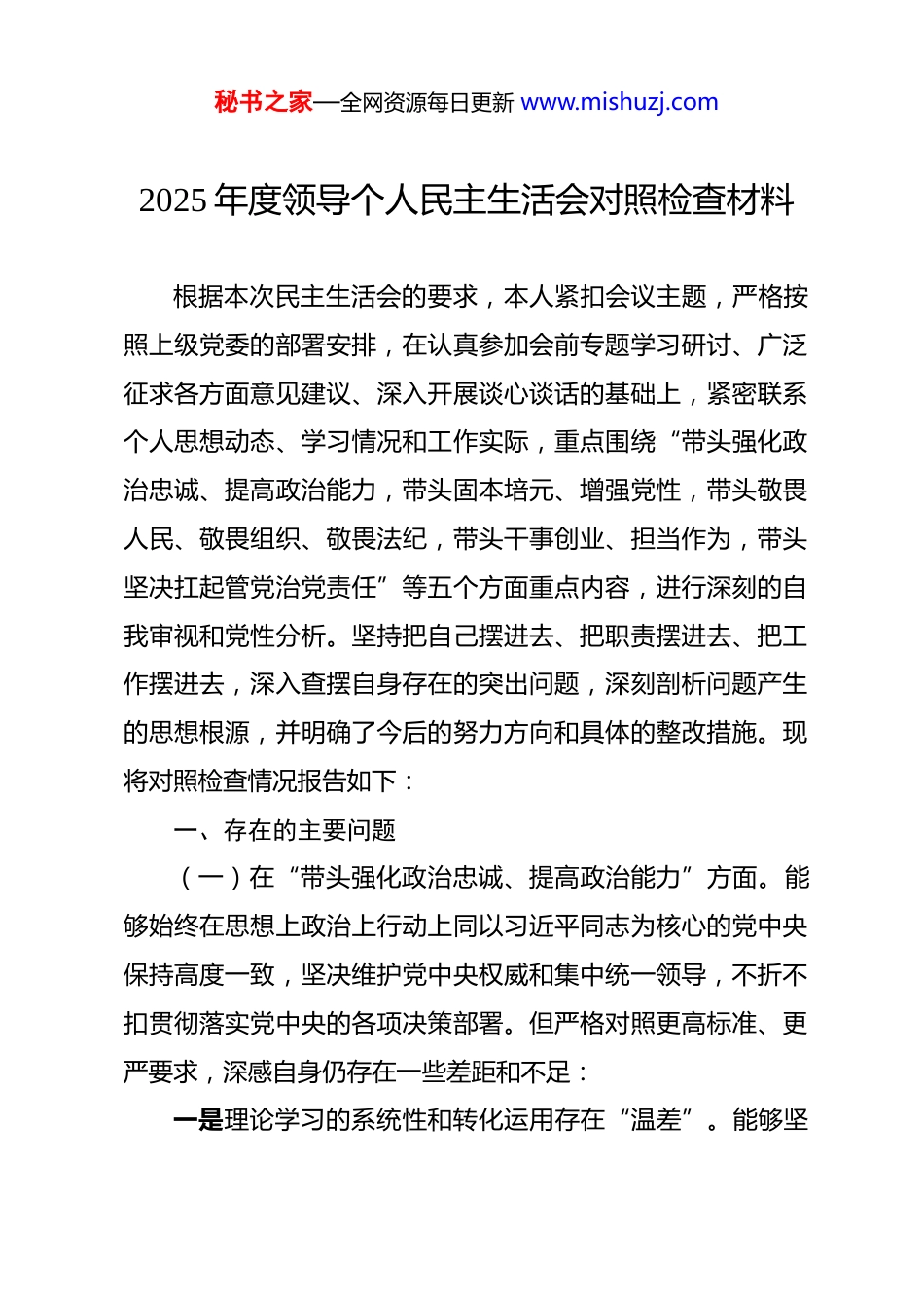 秘书之家—全网资源每日更新 www.mishuzj.com2025 年度领导个人民主生活会对照检查材料 根据本次民主生活会的要求,本人紧扣会议主题,严格按照上级党委的部署安排,在认真参加会前专题学习研讨、广泛征求各方面意见建议、深入开展谈心谈话的基础上,紧密联系个人思想动态、学习情况和工作实际,重点围绕“带头强化政治忠诚、提高政治能力,带头固本培元、增强党性,带头敬畏人民、敬畏组织、敬畏法纪,带头干事创业、担当作为,带头坚决扛起管党治党责任”等五个方面重点内容,进行深刻的自我审视和党性分析。坚持把自己摆进去、把职责摆进去、把工作摆进去,深入查摆自身存在的突出问题,深刻剖析问题产生的思想根源,并明确了今后的努力方向和具体的整改措施。现将对照检查情况报告如下:一、存在的主要问题(一)在“带头强化政治忠诚、提高政治能力”方面。能够始终在思想上政治上行动上同以习近平同志为核心的党中央保持高度一致,坚决维护党中央权威和集中统一领导,不折不扣贯彻落实党中央的各项决策部署。但严格对照更高标准、更严要求,深感自身仍存在一些差距和不足:一是理论学习的系统性和转化运用存在“温差”。能够坚秘书之家—全网资源每日更新 www.mishuzj.com持参加党委理论学习中心组学习、完成规定的学习任务,但对习近平新时代中国特色社会主义思想的整体性、关联性把握还不够系统全面,特别是对其中蕴含的马克思主义立场、观点、方法,以及关于本行业本领域改革发展、党的建设等方面的重要论述,钻研得不够精深透彻。存在“浅层化”学习现象,满足于“读过了”“学过了”,但在“悟透了”“用活了”上还有明显差距。将党的创新理论转化为谋划工作的思路、破解难题的举措、推动发展的能力尚显不足。例如,在运用新发展理念指导本单位(部门)优化产业结构、布局战略性新兴产业、应对当前复杂严峻经济形势等方面,前瞻性思考、战略性谋划和创造性落实的结合不够紧密,有时思路还不够开阔,举措还不够精准有力,理论学习的“溢出效应”未能充分彰显。二是政治判断力、领悟力、执行力的“精度”有待提升。对“国之大者”的深刻内涵和实践要求,有时理解不够到位,未能完全将本单位(部门)的工作置于党和国家事业发展全局中去考量和推进。对社会上出现的一些错误思潮、模糊认识,以及网络空间中的杂音噪音,虽然能够保持基本立场,但有时缺乏第一时间从政治高度洞察其本质、研判其风险的敏锐性,政治鉴别力需要进一步淬炼。在贯彻落实上级决策部署时,有时存在一定的“本位主义”或路径依赖,未能完全做到结合实秘书之家—全网资源每日更新 www.mishuzj.com际情况创造性地开展工作,确保党中央精神在本单位(部门)落地生根、开花结果的政治执行力有待进一步增强。在意识形态工作责任制落实上,对分管领域(或本单位)的阵地管理、风险排查、人员思想动态掌握,有时抓得不够紧、不够实,主动设置议题、有效引导舆论的能力有待加强。(二)在“带头固本培元、增强党性”方面。能够牢记自己的第一身份是共产党员,自觉遵守党章党规,履行党员义务,但在党性修养的持续锤炼和严格自律上,仍有提升空间:一是党性锻炼的主动性和常态化不足。随着工作头绪增多、任务加重,有时不自觉地放松了严格的党性锻炼要求,将更多精力投入到具体业务工作中,对通过严肃认真的党内政治生活来净化思想、提升境界的重视程度有所减弱。参加所在党支部的组织生活,有时存在“事务性”“程序化”倾向,未能每次都全身心投入、高质量参与。在运用批评和自我批评武器方面,尤其是在自我批评上,有时顾虑较多,怕“揭短亮丑”影响形象,怕触及深层次问题,存在“隔靴搔痒”、避重就轻的现象,未能真正达到“红脸出汗、排毒治病”的效果。艰苦奋斗、勤俭节约的优良传统在思想深处扎根不够牢固,对一些非原则性的“小节”问题警惕性不高。二是宗旨意识践行不够彻底深入。虽然能够坚持走群众路秘书之家—全网资源每日更新 www.mishuzj.com线,定期开展调研、听取意见,但“身入”基层多,“心到”群众少。深入一线与普通职工群众、服务对象面对面、心贴心交流的时间、频次和深度不够,...