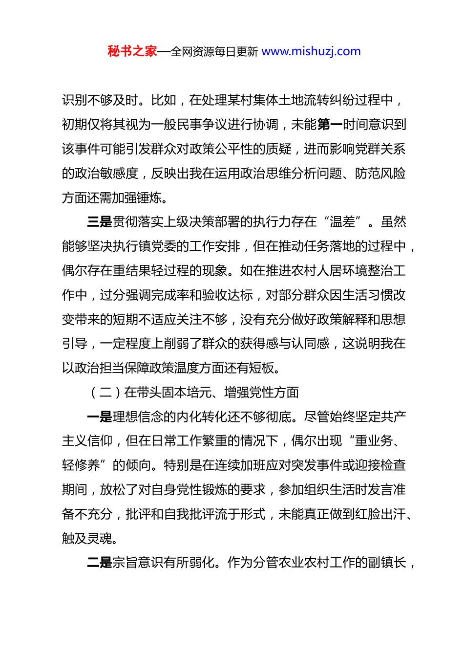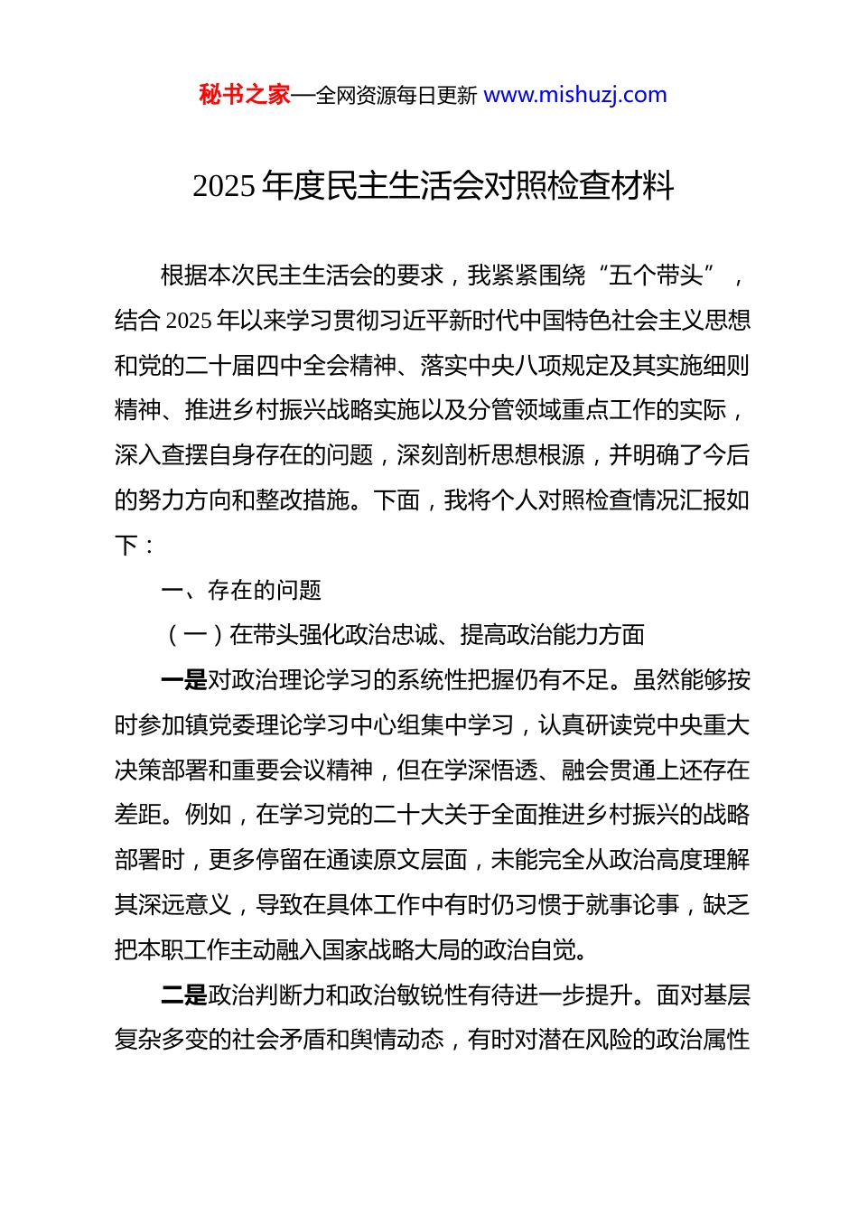秘书之家—全网资源每日更新 www.mishuzj.com2025 年度民主生活会对照检查材料 根据本次民主生活会的要求,我紧紧围绕“五个带头”,结合 2025 年以来学习贯彻习近平新时代中国特色社会主义思想和党的二十届四中全会精神、落实中央八项规定及其实施细则精神、推进乡村振兴战略实施以及分管领域重点工作的实际,深入查摆自身存在的问题,深刻剖析思想根源,并明确了今后的努力方向和整改措施。下面,我将个人对照检查情况汇报如下:一、存在的问题(一)在带头强化政治忠诚、提高政治能力方面一是对政治理论学习的系统性把握仍有不足。虽然能够按时参加镇党委理论学习中心组集中学习,认真研读党中央重大决策部署和重要会议精神,但在学深悟透、融会贯通上还存在差距。例如,在学习党的二十大关于全面推进乡村振兴的战略部署时,更多停留在通读原文层面,未能完全从政治高度理解其深远意义,导致在具体工作中有时仍习惯于就事论事,缺乏把本职工作主动融入国家战略大局的政治自觉。二是政治判断力和政治敏锐性有待进一步提升。面对基层复杂多变的社会矛盾和舆情动态,有时对潜在风险的政治属性秘书之家—全网资源每日更新 www.mishuzj.com识别不够及时。比如,在处理某村集体土地流转纠纷过程中,初期仅将其视为一般民事争议进行协调,未能第一时间意识到该事件可能引发群众对政策公平性的质疑,进而影响党群关系的政治敏感度,反映出我在运用政治思维分析问题、防范风险方面还需加强锤炼。三是贯彻落实上级决策部署的执行力存在“温差”。虽然能够坚决执行镇党委的工作安排,但在推动任务落地的过程中,偶尔存在重结果轻过程的现象。如在推进农村人居环境整治工作中,过分强调完成率和验收达标,对部分群众因生活习惯改变带来的短期不适应关注不够,没有充分做好政策解释和思想引导,一定程度上削弱了群众的获得感与认同感,这说明我在以政治担当保障政策温度方面还有短板。(二)在带头固本培元、增强党性方面一是理想信念的内化转化还不够彻底。尽管始终坚定共产主义信仰,但在日常工作繁重的情况下,偶尔出现“重业务、轻修养”的倾向。特别是在连续加班应对突发事件或迎接检查期间,放松了对自身党性锻炼的要求,参加组织生活时发言准备不充分,批评和自我批评流于形式,未能真正做到红脸出汗、触及灵魂。二是宗旨意识有所弱化。作为分管农业农村工作的副镇长,秘书之家—全网资源每日更新 www.mishuzj.com本应更加贴近农民群众,倾听民声、回应民意。但今年以来,下村调研次数虽不少,但真正坐下来与村民面对面交流的时间偏少,多数时候是听村干部汇报、看台账资料,导致掌握的情况不够全面真实。例如,在推动高标准农田建设项目时,前期征求意见不充分,个别农户反映灌溉渠改线影响自家耕地用水的问题未能及时发现并解决,暴露出为民服务的初心有所淡化。三是艰苦奋斗精神有所松懈。随着工作条件改善和生活保障水平提高,对勤俭节约、反对浪费的要求有所降低的趋势。在公务接待中,偶有超标准安排的情况;在办公用品使用上,存在铺张浪费、设备空转等现象,虽然金额不大,但反映出在小事小节上自我要求不够严格,党性修养的日常养成还需持续用力。(三)在带头敬畏人民、敬畏组织、敬畏法纪方面一是服务群众的主动性还需增强。虽然始终坚持以人民为中心的发展思想,但在具体履职中,仍存在被动响应多、主动作为少的问题。例如,在接到群众关于道路破损、路灯不亮等问题的反映后,基本能做到及时交办处理,但很少主动开展全域排查、提前预防隐患,往往是“哪里出问题才往哪里去”,缺乏未雨绸缪的服务意识。二是在执行组织纪律方面存在“老好人”思想。作为班子秘书之家—全网资源每日更新 www.mishuzj.com成员,对于一些非原则性的小问题,有时出于维护团结考虑,选择睁一只眼闭一只眼。比如,在班子会议上讨论某些项目资金分配方案时,明知个别建议不合理,但考虑到同事关系,未明确提出反对意见,而是采取折中妥协的方式处理,实质上是对组织纪律严肃性的弱化,不利于科学决策和规范运行。三是纪律规矩意识需进一步筑牢。虽然能够严守廉洁自律各项规定,从未插手工...