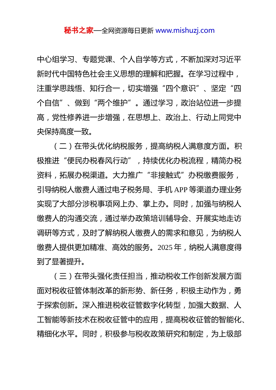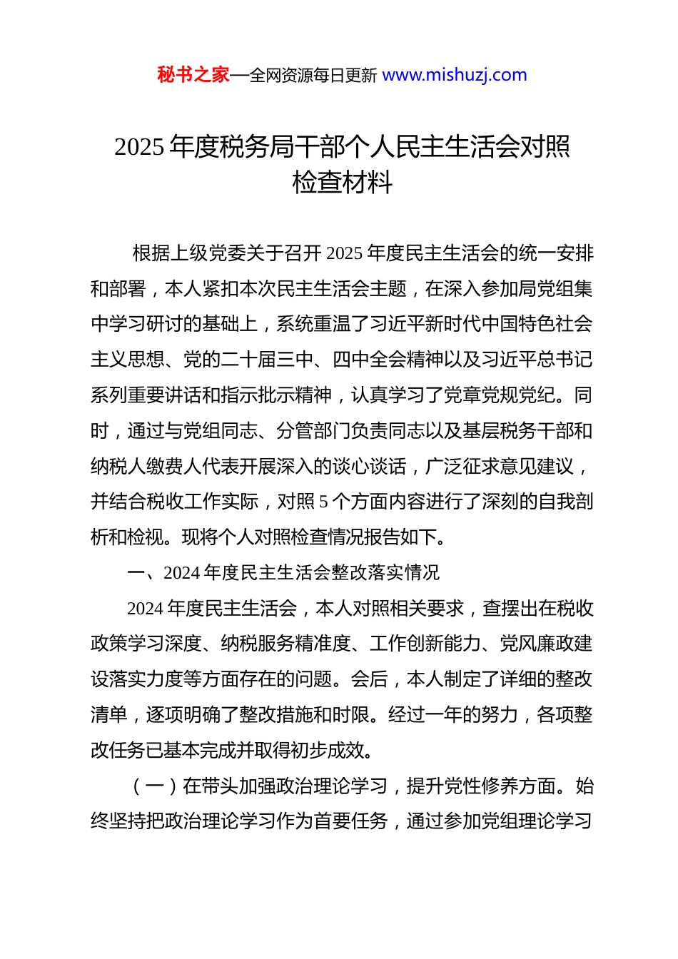 秘书之家—全网资源每日更新 www.mishuzj.com2025 年度税务局干部个人民主生活会对照检查材料 根据上级党委关于召开 2025 年度民主生活会的统一安排和部署,本人紧扣本次民主生活会主题,在深入参加局党组集中学习研讨的基础上,系统重温了习近平新时代中国特色社会主义思想、党的二十届三中、四中全会精神以及习近平总书记系列重要讲话和指示批示精神,认真学习了党章党规党纪。同时,通过与党组同志、分管部门负责同志以及基层税务干部和纳税人缴费人代表开展深入的谈心谈话,广泛征求意见建议,并结合税收工作实际,对照 5 个方面内容进行了深刻的自我剖析和检视。现将个人对照检查情况报告如下。一、2024 年度民主生活会整改落实情况2024 年度民主生活会,本人对照相关要求,查摆出在税收政策学习深度、纳税服务精准度、工作创新能力、党风廉政建设落实力度等方面存在的问题。会后,本人制定了详细的整改清单,逐项明确了整改措施和时限。经过一年的努力,各项整改任务已基本完成并取得初步成效。(一)在带头加强政治理论学习,提升党性修养方面。始终坚持把政治理论学习作为首要任务,通过参加党组理论学习秘书之家—全网资源每日更新 www.mishuzj.com中心组学习、专题党课、个人自学等方式,不断加深对习近平新时代中国特色社会主义思想的理解和把握。在学习过程中,注重学思践悟、知行合一,切实增强“四个意识”、坚定“四个自信”、做到“两个维护”。通过学习,政治站位进一步提高,党性修养进一步增强,在思想上、政治上、行动上同党中央保持高度一致。(二)在带头优化纳税服务,提高纳税人满意度方面。积极推进“便民办税春风行动”,持续优化办税流程,精简办税资料,拓展办税渠道。大力推广“非接触式”办税缴费服务,引导纳税人缴费人通过电子税务局、手机 APP 等渠道办理业务实现了大部分涉税事项网上办、掌上办。同时,加强与纳税人缴费人的沟通交流,通过举办政策培训辅导会、开展实地走访调研等方式,及时了解纳税人缴费人的需求和意见,为纳税人缴费人提供更加精准、高效的服务。2025 年,纳税人满意度得到了显著提升。(三)在带头强化责任担当,推动税收工作创新发展方面面对税收征管体制改革的新形势、新任务,积极主动作为,勇于探索创新。深入推进税收征管数字化转型,加强大数据、人工智能等新技术在税收征管中的应用,提高税收征管的智能化、精细化水平。同时,积极参与税收政策研究和制定,为上级部秘书之家—全网资源每日更新 www.mishuzj.com门提供有价值的参考建议,推动税收政策的优化和完善。在组织税收收入方面,坚持依法征税、应收尽收,加强税收征管和纳税评估,确保税收收入稳定增长。(四)在带头严格廉洁自律,落实党风廉政建设责任方面严格遵守廉洁自律各项规定,自觉抵制各种腐朽思想的侵蚀。认真落实党风廉政建设“一岗双责”,加强对分管部门干部职工的教育、管理和监督,定期开展廉政谈话和廉政警示教育活动,引导干部职工树立正确的权力观、价值观和利益观。同时,加强对税收执法权力的监督制约,规范税收执法行为,坚决防止和纠正税收执法中的不正之风和腐败问题。总的来看,去年的问题整改是严肃认真的,取得了一定成效。但我也清醒地认识到,一些问题的整改还停留在“治标”层面,作风建设永远在路上,必须以此次民主生活会为新起点,持续深化整改,不断自我净化、自我完善。二、存在的问题对照本次民主生活会“五个带头”的要求,坚持把自己摆进去、把职责摆进去、把工作摆进去,查摆出以下主要问题。(一)在带头强化政治忠诚、提高政治能力方面。一是政治判断力仍需进一步提升。在面对复杂多变的税收工作形势和各种利益诱惑时,有时政治敏锐性不够强,对一些潜在的政治秘书之家—全网资源每日更新 www.mishuzj.com风险缺乏足够的警惕性和洞察力。例如,在处理一些涉税舆情事件时,未能及时从政治高度进行分析和研判,采取的应对措施不够果断有力,导致舆情事件的影响扩大。二是政治领悟力仍需进一步深化。对党中央的大政方针和税收政策的理解还不够深入透彻,在将上级精神与本地税收工作实际相结合方面,还存...