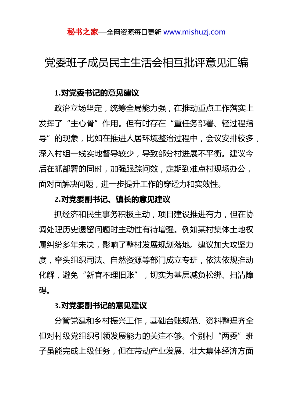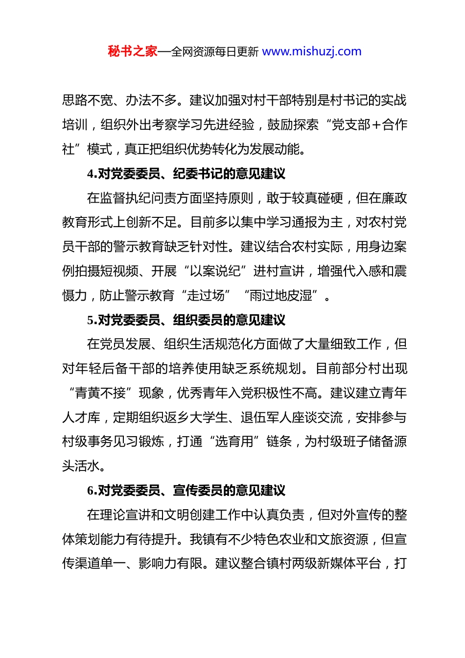 秘书之家—全网资源每日更新 www.mishuzj.com党委班子成员民主生活会相互批评意见汇编 1.对党委书记的意见建议政治立场坚定,统筹全局能力强,在推动重点工作落实上发挥了“主心骨”作用。但有时存在“重任务部署、轻过程指导”的现象,比如在推进人居环境整治过程中,会议安排较多,深入村组一线实地督导较少,导致部分村进展不平衡。建议今后在抓部署的同时,加强跟踪问效,定期到难点村现场办公,面对面解决问题,进一步提升工作的穿透力和实效性。2.对党委副书记、镇长的意见建议抓经济和民生事务积极主动,项目建设推进有力,但在协调处理历史遗留问题时主动性有待增强。例如某村集体土地权属纠纷多年未决,影响了整村发展规划落地。建议加大攻坚力度,牵头组织司法、自然资源等部门成立专班,依法依规推动化解,避免“新官不理旧账”,切实为基层减负松绑、扫清障碍。3.对党委副书记的意见建议分管党建和乡村振兴工作,基础台账规范、资料整理齐全但对村级党组织引领发展能力的关注不够。个别村“两委”班子虽能完成上级任务,但在带动产业发展、壮大集体经济方面秘书之家—全网资源每日更新 www.mishuzj.com思路不宽、办法不多。建议加强对村干部特别是村书记的实战培训,组织外出考察学习先进经验,鼓励探索“党支部+合作社”模式,真正把组织优势转化为发展动能。4.对党委委员、纪委书记的意见建议在监督执纪问责方面坚持原则,敢于较真碰硬,但在廉政教育形式上创新不足。目前多以集中学习通报为主,对农村党员干部的警示教育缺乏针对性。建议结合农村实际,用身边案例拍摄短视频、开展“以案说纪”进村宣讲,增强代入感和震慑力,防止警示教育“走过场”“雨过地皮湿”。5.对党委委员、组织委员的意见建议在党员发展、组织生活规范化方面做了大量细致工作,但对年轻后备干部的培养使用缺乏系统规划。目前部分村出现“青黄不接”现象,优秀青年入党积极性不高。建议建立青年人才库,定期组织返乡大学生、退伍军人座谈交流,安排参与村级事务见习锻炼,打通“选育用”链条,为村级班子储备源头活水。6.对党委委员、宣传委员的意见建议在理论宣讲和文明创建工作中认真负责,但对外宣传的整体策划能力有待提升。我镇有不少特色农业和文旅资源,但宣传渠道单一、影响力有限。建议整合镇村两级新媒体平台,打秘书之家—全网资源每日更新 www.mishuzj.com造统一品牌栏目,如“美丽**行”“乡土故事汇”,通过图文、短视频等方式讲好本土故事,扩大知名度和吸引力。7.对党委委员、政法委员兼派出所所长的意见建议在维护社会稳定方面履职尽责,但在矛盾纠纷源头预防上还需加力。目前仍存在“事后调处多、前端排查少”的情况,一些家庭邻里纠纷未能及时发现化解。建议推动“网格+警格”融合联动,发挥村辅警、调解员作用,做到早发现、早介入、早处置,努力实现“小事不出村、矛盾不上交”。8.对副镇长的意见建议分管农业农村工作,政策熟悉、业务扎实,但在推动农业产业结构调整上步伐偏慢。全镇仍以传统种植为主,高效农业项目不多,农民增收渠道有限。建议立足本地资源禀赋,引进龙头企业或专业合作社,发展设施农业、林下经济、订单农业等新型业态,培育一批示范户,带动群众增产增收。9.对副镇长的意见建议负责安全生产和应急管理,制度健全、责任明确,但在应急演练实战化水平上有待提高。去年组织的防汛演练存在“演成分多、练得少”现象,部分干部应对突发情况的能力不足。建议今后演练突出“真刀真枪”,模拟断电、断路、通讯中断等复杂场景,检验预案可行性,切实提升应急处突能力和协同秘书之家—全网资源每日更新 www.mishuzj.com作战水平。10.对副镇长的意见建议分管民政和社保工作,服务意识强,群众评价较好,但在政策宣传的覆盖面和精准度上还有提升空间。一些符合条件的困难群众因不了解政策而未能及时享受补助。建议利用微信群、村广播、入户走访等多种方式加强政策解读,特别是针对老年人、残疾人等群体开展“一对一”讲解,确保惠民政策应知尽知、应享尽享。11.对党委委员、人武部部长的意见建议在征兵和民兵建设方面工作到位,但对退役军人服务管理的主...