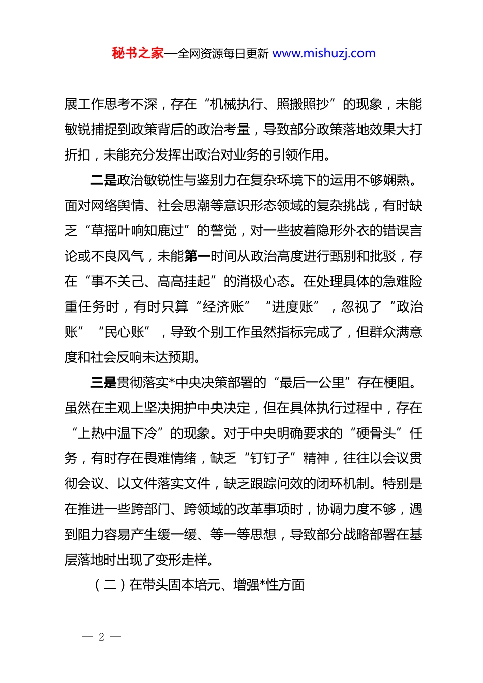 秘书之家—全网资源每日更新 www.mishuzj.com2025 年度民主生活会领导表态发言材料:坚守初心使命铸忠诚,勇于担当作为开新局按照中央及省市委关于开好 2025 年度民主生活会的统一部署,我紧扣会议主题,深入学习贯彻**************思想,全面贯彻落实*的二十届四中全会精神。会前,我通过集体研讨、个人自学等方式深化理论武装,广泛征求意见建议,深入开展谈心谈话,紧密结合“十四五”收官与“十五五”谋划的工作实际,对照规定方面进行了深刻的自我剖析,查摆存在问题,明确整改方向。现将对照检查情况报告如下。一、存在的主要问题(一)在带头强化政治忠诚、提高政治能力方面始终坚持把政治建设摆在首位,但在将“两个确立”的决定性意义转化为“两个维护”的高度自觉上,仍存在“温差”和“落差”。一是政治站位与全局视野的融合度不够紧密。在日常决策中,有时单纯从业务视角考量问题,未能完全跳出分管领域的一亩三分地,缺乏从*和国家事业发展全局的高度去审视和谋划工作的自觉性。例如,在贯彻落实中央关于宏观经济调控或行业改革的决策部署时,对于如何结合本地本部门实际创造性开— 1 —秘书之家—全网资源每日更新 www.mishuzj.com展工作思考不深,存在“机械执行、照搬照抄”的现象,未能敏锐捕捉到政策背后的政治考量,导致部分政策落地效果大打折扣,未能充分发挥出政治对业务的引领作用。二是政治敏锐性与鉴别力在复杂环境下的运用不够娴熟。面对网络舆情、社会思潮等意识形态领域的复杂挑战,有时缺乏“草摇叶响知鹿过”的警觉,对一些披着隐形外衣的错误言论或不良风气,未能第一时间从政治高度进行甄别和批驳,存在“事不关己、高高挂起”的消极心态。在处理具体的急难险重任务时,有时只算“经济账”“进度账”,忽视了“政治账”“民心账”,导致个别工作虽然指标完成了,但群众满意度和社会反响未达预期。三是贯彻落实*中央决策部署的“最后一公里”存在梗阻。虽然在主观上坚决拥护中央决定,但在具体执行过程中,存在“上热中温下冷”的现象。对于中央明确要求的“硬骨头”任务,有时存在畏难情绪,缺乏“钉钉子”精神,往往以会议贯彻会议、以文件落实文件,缺乏跟踪问效的闭环机制。特别是在推进一些跨部门、跨领域的改革事项时,协调力度不够,遇到阻力容易产生缓一缓、等一等思想,导致部分战略部署在基层落地时出现了变形走样。(二)在带头固本培元、增强*性方面— 2 —秘书之家—全网资源每日更新 www.mishuzj.com能够自觉用**************思想武装头脑,但在真正从灵魂深处解决“总开关”问题上,还需持续用力。一是理论学习的深度与广度存在“碎片化”倾向。在学习**************思想时,往往满足于读原文、抄笔记,缺乏系统性、整体性的深度研机析理。实用主义倾向较重,急需用的就突击学,暂时用不上的就搁置一边,未能真正做到“知其然更知其所以然”。例如,对二十届四中全会精神中关于制度建设的深层逻辑理解不透,导致在指导分管领域制度改革时,缺乏理论支撑,工作思路打不开,存在经验主义路径依赖。二是*性修养的锤炼在日常琐碎中有所松懈。随着*龄增长和职务提升,有时潜意识里认为自己受*教育多年,政治免疫力强,不需要像年轻干部那样时时“勤拂拭”。在参加*内政治生活时,有时存在应付心理,以普通*员身份参加支部组织生活会次数不够多,批评与自我批评有时避重就轻,辣味不足,未能真正通过严肃的政治生活来洗涤心灵、升华境界。在对照*章*规找差距时,有时标准定得不够高,满足于“不违规、不逾矩”,缺乏向高标准看齐的内在动力。三是为民情怀的转化不够具体实在。虽然口头上常讲“以人民为中心”,但在实际行动中,有时把“对上负责”与“对下负责”割裂开来。在制定政策或推动项目时,更多考虑的是— 3 —秘书之家—全网资源每日更新 www.mishuzj.com上级考核指标和亮点展示,对基层群众的实际承受能力和真实需求调研不够充分。例如,在推进数字化转型工作中,过分追求平台的先进性和覆盖率,忽视了老年群体和边远地区群众的操作便利性,导致部分便民举措变成了群众的“烦心事”,未能真正把好事办到群众心坎上...