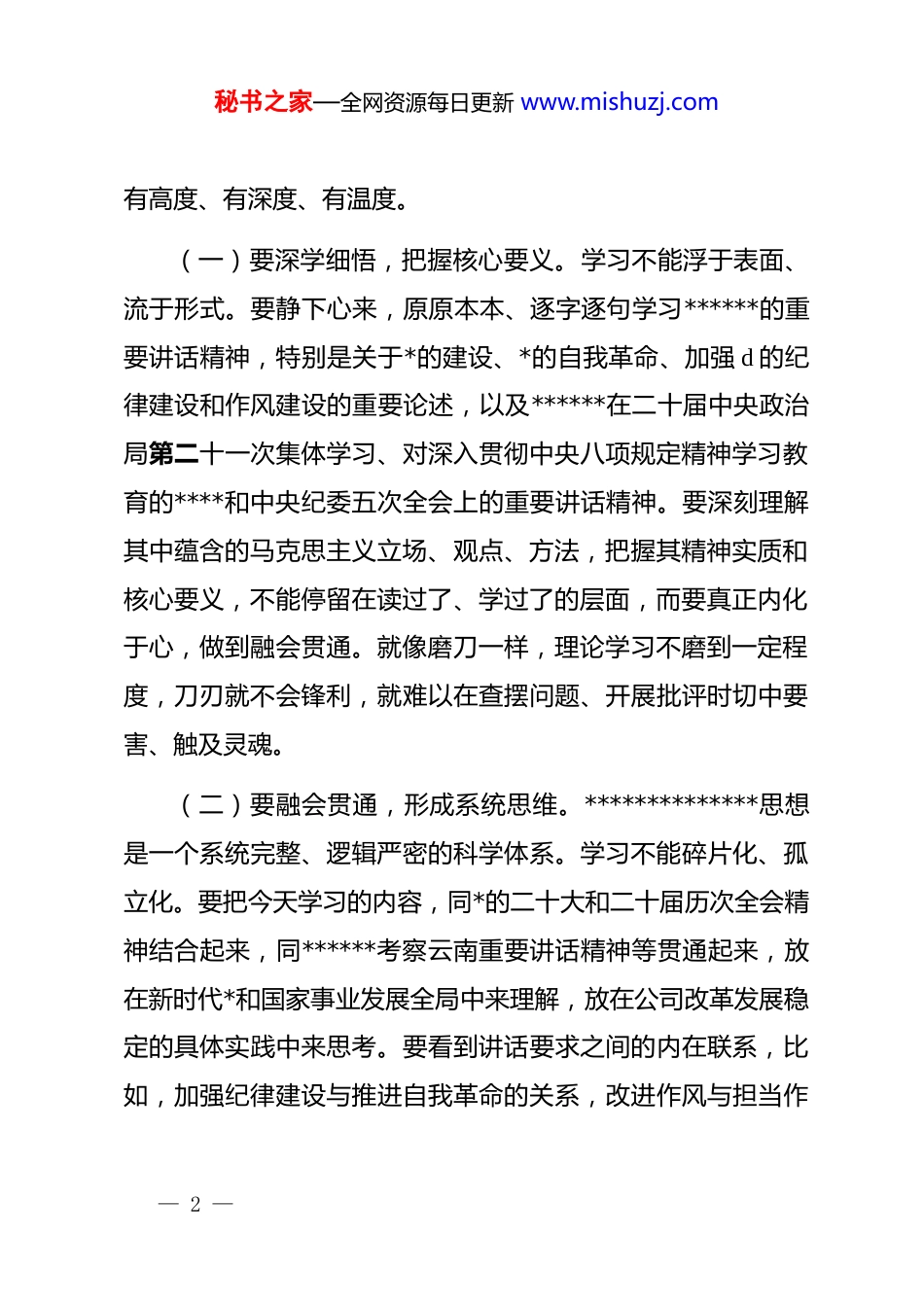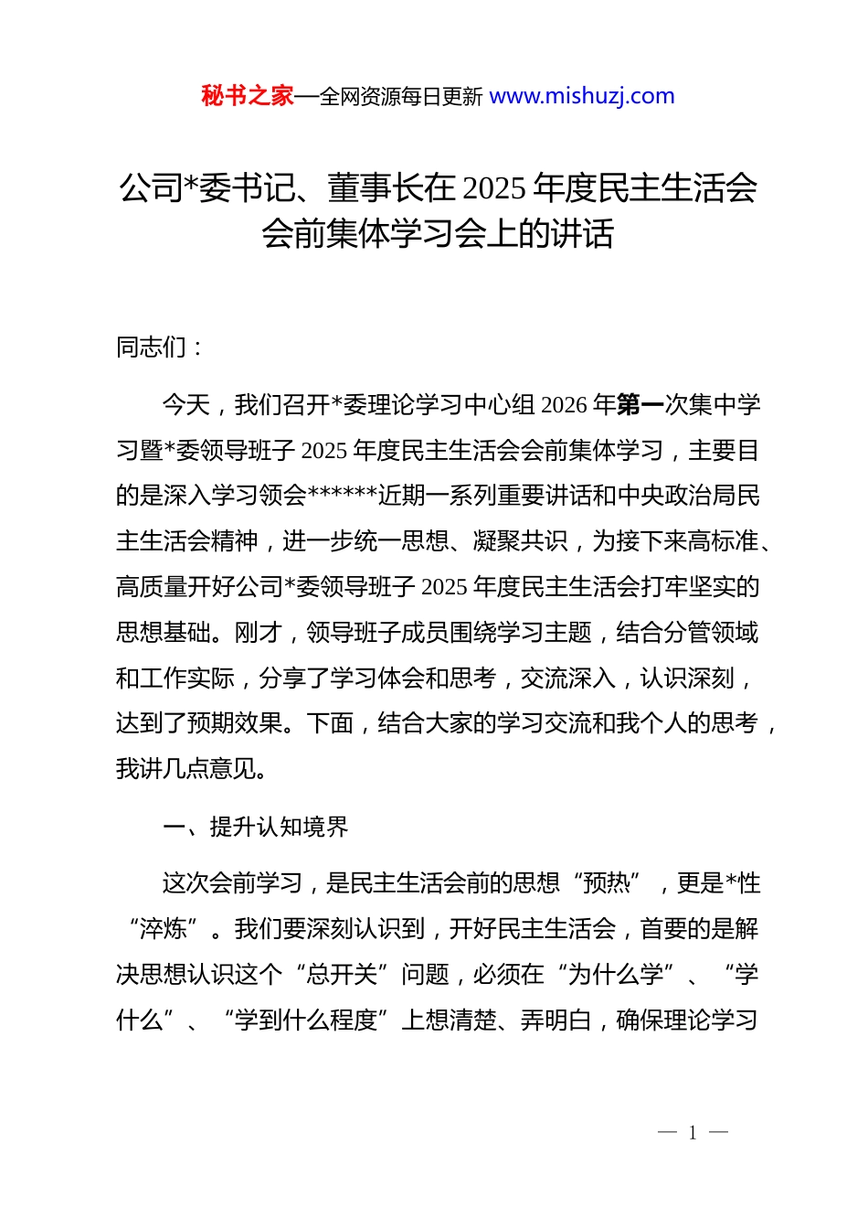 秘书之家—全网资源每日更新 www.mishuzj.com公司*委书记、董事长在 2025 年度民主生活会会前集体学习会上的讲话同志们:今天,我们召开*委理论学习中心组 2026 年第一次集中学习暨*委领导班子 2025 年度民主生活会会前集体学习,主要目的是深入学习领会******近期一系列重要讲话和中央政治局民主生活会精神,进一步统一思想、凝聚共识,为接下来高标准、高质量开好公司*委领导班子 2025 年度民主生活会打牢坚实的思想基础。刚才,领导班子成员围绕学习主题,结合分管领域和工作实际,分享了学习体会和思考,交流深入,认识深刻,达到了预期效果。下面,结合大家的学习交流和我个人的思考,我讲几点意见。一、提升认知境界这次会前学习,是民主生活会前的思想“预热”,更是*性“淬炼”。我们要深刻认识到,开好民主生活会,首要的是解决思想认识这个“总开关”问题,必须在“为什么学”、“学什么”、“学到什么程度”上想清楚、弄明白,确保理论学习— 1 —秘书之家—全网资源每日更新 www.mishuzj.com有高度、有深度、有温度。(一)要深学细悟,把握核心要义。学习不能浮于表面、流于形式。要静下心来,原原本本、逐字逐句学习******的重要讲话精神,特别是关于*的建设、*的自我革命、加强 d 的纪律建设和作风建设的重要论述,以及******在二十届中央政治局第二十一次集体学习、对深入贯彻中央八项规定精神学习教育的****和中央纪委五次全会上的重要讲话精神。要深刻理解其中蕴含的马克思主义立场、观点、方法,把握其精神实质和核心要义,不能停留在读过了、学过了的层面,而要真正内化于心,做到融会贯通。就像磨刀一样,理论学习不磨到一定程度,刀刃就不会锋利,就难以在查摆问题、开展批评时切中要害、触及灵魂。(二)要融会贯通,形成系统思维。**************思想是一个系统完整、逻辑严密的科学体系。学习不能碎片化、孤立化。要把今天学习的内容,同*的二十大和二十届历次全会精神结合起来,同******考察云南重要讲话精神等贯通起来,放在新时代*和国家事业发展全局中来理解,放在公司改革发展稳定的具体实践中来思考。要看到讲话要求之间的内在联系,比如,加强纪律建设与推进自我革命的关系,改进作风与担当作— 2 —秘书之家—全网资源每日更新 www.mishuzj.com为的关系,从而形成一个全面的、系统的认识框架,避免“只见树木,不见森林”。这种系统性的把握,能帮助我们更精准地定位自身存在的问题,看清问题背后的深层次原因。(三)要对标对表,校正思想偏差。学习的最终目的是为了应用,为了改造主观世界和客观世界。我们要以中央政治局民主生活会为标杆,自觉向*中央看齐,向*的理论和路线方针政策看齐,向*中央决策部署看齐。要经常用******的重要讲话精神这面“镜子”照一照自己,用 dj*规这把“尺子”量一量自己,看看在“笃信、务实、担当、自律”方面存在哪些差距,在严格执行中央八项规定及其实施细则精神方面还有哪些不足。这种对标对表,不是简单的机械对照,而是一个动态的、持续不断的自我检视、自我完善的过程,目的是不断校正思想偏差、净化政治灵魂,确保我们的思想和行动始终沿着正确方向前进。(四)要知行合一,推动认识转化。理论学习的价值在于实践。不能学归学、做归做,搞“两张皮”。要把学习成果转化为谋划工作的思路、推动工作的举措、解决问题的能力。要深刻把握作风建设常态化长效化的要求,把学习领会到的新精神、新要求,融入到即将召开的民主生活会对照检查、批评与自我批评、整改落实的全过程,更要将学习成效体现到谋划好— 3 —秘书之家—全网资源每日更新 www.mishuzj.com2026 年工作、推动重点项目攻坚、破解发展难题上来。学习的效果,最终要看是否推动了工作、促进了发展,是否增强了职工群众的获得感,这才是检验学习深度的“试金石”。二、强化实践操守民主生活会开得好不好,关键看是否真正拿起了批评与自我批评的武器,是否体现了“辣味”,是否达到了“红脸出汗、排毒治病”的效果。这要求我们必须有刀刃向内的勇气和实事求是的态度,在“真”字上下功夫,在“实”字上做文章。(一)要敞开...