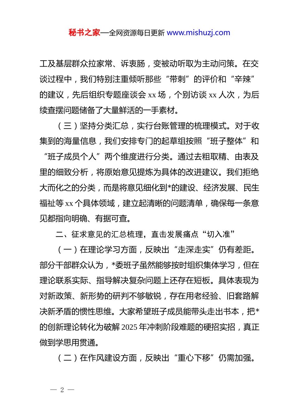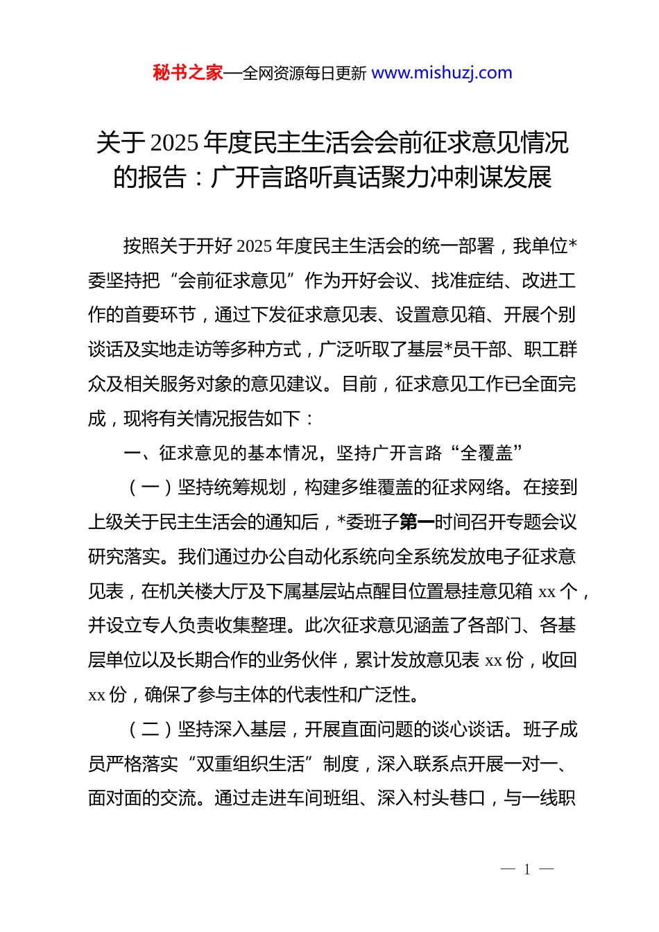 秘书之家—全网资源每日更新 www.mishuzj.com关于 2025 年度民主生活会会前征求意见情况的报告:广开言路听真话聚力冲刺谋发展按照关于开好 2025 年度民主生活会的统一部署,我单位*委坚持把“会前征求意见”作为开好会议、找准症结、改进工作的首要环节,通过下发征求意见表、设置意见箱、开展个别谈话及实地走访等多种方式,广泛听取了基层*员干部、职工群众及相关服务对象的意见建议。目前,征求意见工作已全面完成,现将有关情况报告如下:一、征求意见的基本情况,坚持广开言路“全覆盖”(一)坚持统筹规划,构建多维覆盖的征求网络。在接到上级关于民主生活会的通知后,*委班子第一时间召开专题会议研究落实。我们通过办公自动化系统向全系统发放电子征求意见表,在机关楼大厅及下属基层站点醒目位置悬挂意见箱 xx 个,并设立专人负责收集整理。此次征求意见涵盖了各部门、各基层单位以及长期合作的业务伙伴,累计发放意见表 xx 份,收回xx 份,确保了参与主体的代表性和广泛性。(二)坚持深入基层,开展直面问题的谈心谈话。班子成员严格落实“双重组织生活”制度,深入联系点开展一对一、面对面的交流。通过走进车间班组、深入村头巷口,与一线职— 1 —秘书之家—全网资源每日更新 www.mishuzj.com工及基层群众拉家常、诉衷肠,变被动听取为主动问策。在交谈过程中,我们特别注重倾听那些“带刺”的评价和“辛辣”的建议,先后组织专题座谈会 xx 场,个别访谈 xx 人次,为后续查摆问题储备了大量鲜活的一手素材。(三)坚持分类汇总,实行台账管理的梳理模式。对于收集到的海量信息,我们安排专门的起草组按照“班子整体”和“班子成员个人”两个维度进行分类。通过去粗取精、由表及里的细致分析,将原始意见提炼为具体的改进建议。我们拒绝大而化之的分类,而是将意见细化到*的建设、经济发展、民生福祉等 xx 个具体领域,建立起清晰的问题清单,确保每一条意见都指向明确、有据可查。二、征求意见的汇总梳理,直击发展痛点“切入准”(一)在理论学习方面,反映出“走深走实”仍有差距。部分干部群众认为,*委班子虽然能够按时组织集体学习,但在理论联系实际、指导解决复杂问题上还存在短板。具体表现为对新政策、新形势的研判不够敏锐,存在用老经验、旧套路解决新矛盾的惯性思维。大家希望班子成员能带头走出书本,把*的创新理论转化为破解 2025 年冲刺阶段难题的硬招实招,真正做到学思用贯通。(二)在作风建设方面,反映出“重心下移”仍需加强。— 2 —秘书之家—全网资源每日更新 www.mishuzj.com基层职工普遍反映,机关层面的调研有时存在走马观花、蜻蜓点水的现象,调研成果转化为政策措施的效率有待提高。在服务群众的过程中,偶尔还会出现手续繁琐、回应滞后的情况。大家期待班子成员能更频繁地深入基层蹲点,少看材料多看实绩,切实减少不必要的会议和台账,让基层干部能腾出更多精力投入到决胜收官的具体行动中。(三)在履职担当方面,反映出“敢为人先”仍显不足。面对当前复杂多变的经济形势和繁重的发展任务,部分群众指出班子在处理历史遗留问题和突破技术瓶颈时,闯劲、干劲略显疲软。存在求稳怕乱的思想苗头,对于一些高风险、高难度的创新项目,决策速度较慢。职工们希望领导班子能进一步强化担当意识,在 2025 年度的冲刺关键期,带头发扬“啃硬骨头”的精神,为单位转型发展扫除体制性障碍。三、改进工作的下步打算,落实整改要求“见实效”(一)筑牢思想之基,在学深悟透中“把稳舵”。针对理论学习不够深入的问题,我们将进一步完善*委理论学习中心组学习制度,增加专题研讨和案例分析的比重。2025 年是完成既定目标任务的收官之年,我们将紧扣高质量发展这一主题,邀请行业专家进行深度辅导,提升班子成员对前沿技术和宏观政策的驾驭能力。通过建立“理论微课”进基层的机制,让思想— 3 —秘书之家—全网资源每日更新 www.mishuzj.com的火花在生产一线闪耀,实现政治站位与业务能力的同频共振。(二)厚植民生之本,在深入群众中“接底气”。针对作风建设不够扎实的问题,我们将开展“转作风、促发展、惠...