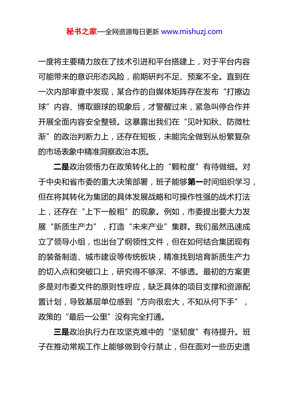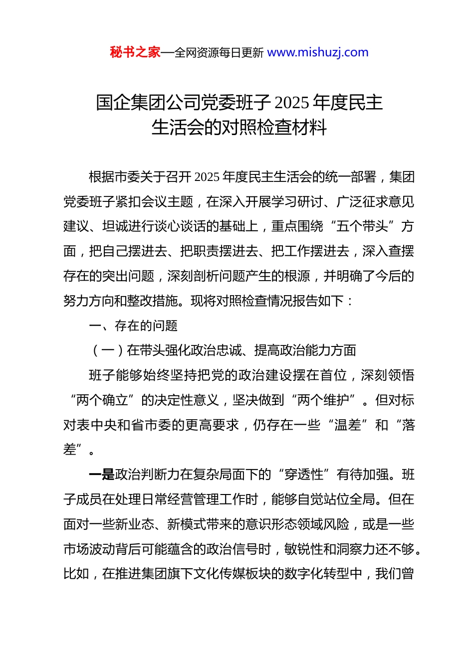 秘书之家—全网资源每日更新 www.mishuzj.com国企集团公司党委班子 2025 年度民主生活会的对照检查材料 根据市委关于召开 2025 年度民主生活会的统一部署,集团党委班子紧扣会议主题,在深入开展学习研讨、广泛征求意见建议、坦诚进行谈心谈话的基础上,重点围绕“五个带头”方面,把自己摆进去、把职责摆进去、把工作摆进去,深入查摆存在的突出问题,深刻剖析问题产生的根源,并明确了今后的努力方向和整改措施。现将对照检查情况报告如下:一、存在的问题(一)在带头强化政治忠诚、提高政治能力方面班子能够始终坚持把党的政治建设摆在首位,深刻领悟“两个确立”的决定性意义,坚决做到“两个维护”。但对标对表中央和省市委的更高要求,仍存在一些“温差”和“落差”。一是政治判断力在复杂局面下的“穿透性”有待加强。班子成员在处理日常经营管理工作时,能够自觉站位全局。但在面对一些新业态、新模式带来的意识形态领域风险,或是一些市场波动背后可能蕴含的政治信号时,敏锐性和洞察力还不够。比如,在推进集团旗下文化传媒板块的数字化转型中,我们曾秘书之家—全网资源每日更新 www.mishuzj.com一度将主要精力放在了技术引进和平台搭建上,对于平台内容可能带来的意识形态风险,前期研判不足、预案不全。直到在一次内部审查中发现,某合作的自媒体矩阵存在发布“打擦边球”内容、博取眼球的现象后,才警醒过来,紧急叫停合作并开展全面内容安全整顿。这暴露出我们在“见叶知秋、防微杜渐”的政治判断力上,还存在短板,未能完全做到从纷繁复杂的市场表象中精准洞察政治本质。二是政治领悟力在政策转化上的“颗粒度”有待做细。对于中央和省市委的重大决策部署,班子能够第一时间组织学习,但在将其转化为集团的具体发展战略和可操作性强的战术打法上,还存在“上下一般粗”的现象。例如,市委提出要大力发展“新质生产力”,打造“未来产业”集群。我们虽然迅速成立了领导小组,也出台了纲领性文件,但在如何结合集团现有的装备制造、城市建设等传统板块,精准找到培育新质生产力的切入点和突破口上,研究得不够深、不够透。最初的方案更多是对市委文件的原则性呼应,缺乏具体的项目支撑和资源配置计划,导致基层单位感到“方向很宏大,不知从何下手”,政策的“最后一公里”没有完全打通。三是政治执行力在攻坚克难中的“坚韧度”有待提升。班子在推动常规工作上能够做到令行禁止,但在面对一些历史遗秘书之家—全网资源每日更新 www.mishuzj.com留问题或改革深水区问题时,有时会存在畏难情绪和“绕道走”思想。比如,集团下属一家老牌制造企业,多年来存在体制机制僵化、市场竞争力弱的问题。我们虽然多次将其列为改革重点,但考虑到涉及人员安置、资产处置等复杂因素,在具体推进过程中顾虑较多、决心不够,导致改革进程几度放缓。2025 年下半年,该企业因市场环境突变,经营出现困难,我们才“倒逼”着下定决心,以壮士断腕的勇气推动了重组。这说明我们的政治执行力在“啃硬骨头”时还不够刚健,缺乏“明知山有虎、偏向虎山行”的斗争精神。(二)在带头固本培元、增强党性方面班子始终坚持用党的创新理论武装头脑,但对照“学懂、弄通、做实”的标准,理论学习的“内化、深化、转化”还不够到位。一是理论学习存在“浅尝辄止”的现象。虽然坚持了党委理论学习中心组学习制度,但有时学习的深度和广度不足。比如,在学习领会习近平经济思想时,班子成员更多的是通读文件、交流心得,满足于“知道了”“了解了”,但在如何运用其立场、观点、方法来分析集团当前面临的产业链升级难、核心技术“卡脖子”等现实问题上,系统性思考和专题性研讨不够。学习成果更多地停留在思想层面,转化为指导实践、推动秘书之家—全网资源每日更新 www.mishuzj.com工作的“金钥匙”的作用没有充分发挥出来,存在一定的“学用两张皮”现象。二是党性锤炼存在“自我感觉良好”的倾向。班子成员大多是受党教育多年的老党员,在党性修养上对自己有要求。但有时会不自觉地产生一种“经验主义”和“路径依赖”,认为自己的党性是过硬的,从而在主动接受党内政治生活淬炼方面有...