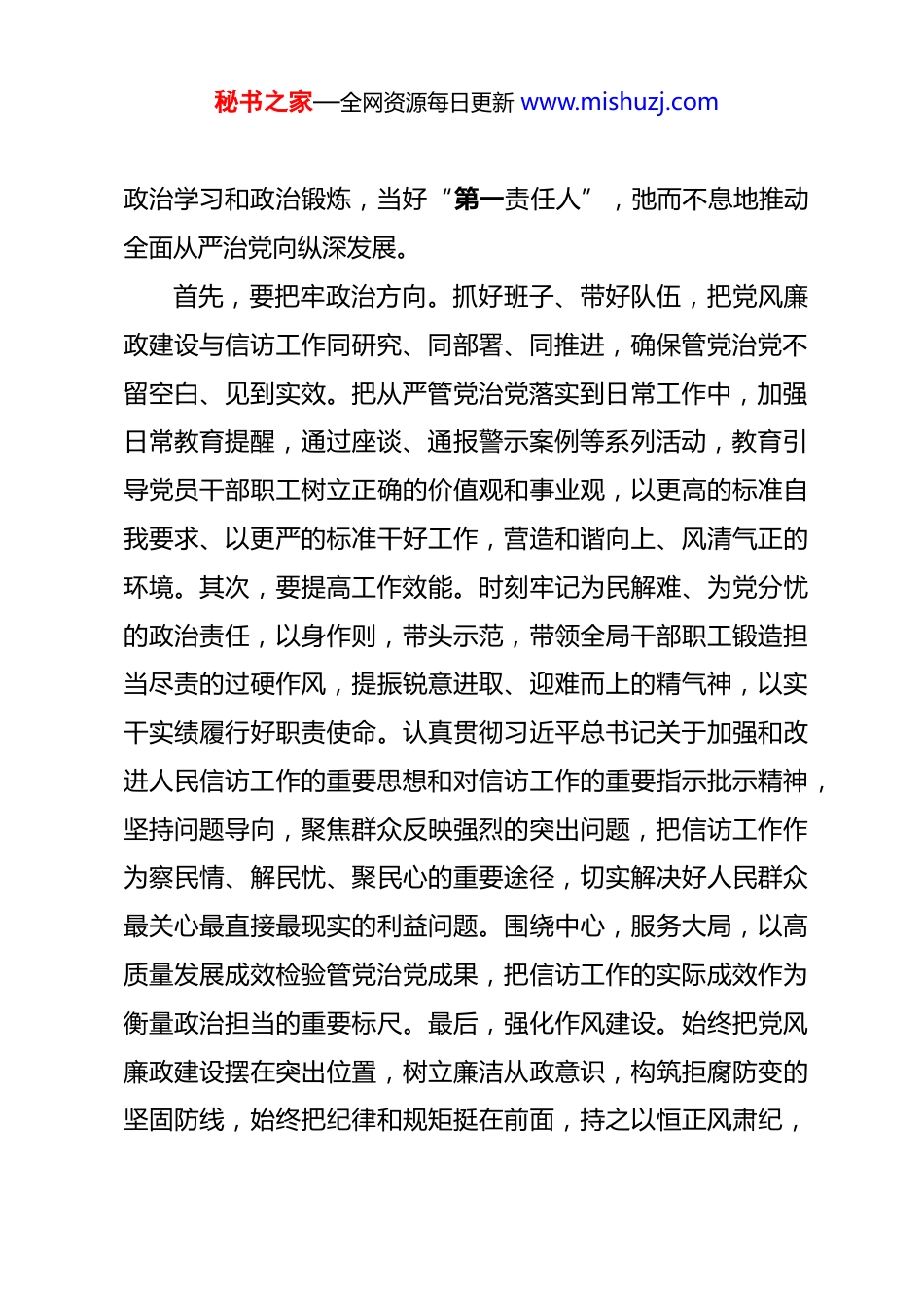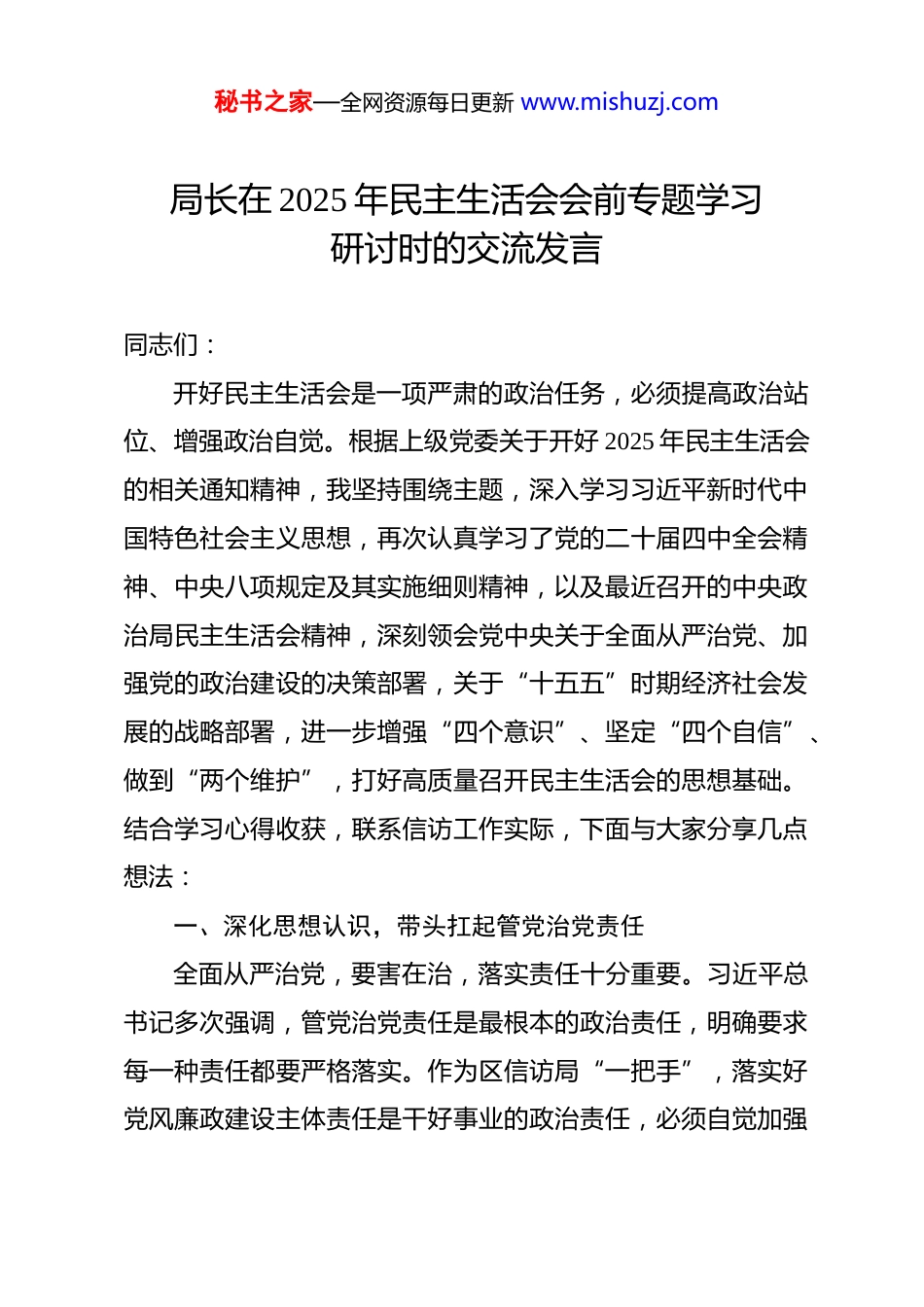 秘书之家—全网资源每日更新 www.mishuzj.com局长在 2025 年民主生活会会前专题学习研讨时的交流发言 同志们:开好民主生活会是一项严肃的政治任务,必须提高政治站位、增强政治自觉。根据上级党委关于开好 2025 年民主生活会的相关通知精神,我坚持围绕主题,深入学习习近平新时代中国特色社会主义思想,再次认真学习了党的二十届四中全会精神、中央八项规定及其实施细则精神,以及最近召开的中央政治局民主生活会精神,深刻领会党中央关于全面从严治党、加强党的政治建设的决策部署,关于“十五五”时期经济社会发展的战略部署,进一步增强“四个意识”、坚定“四个自信”、做到“两个维护”,打好高质量召开民主生活会的思想基础。结合学习心得收获,联系信访工作实际,下面与大家分享几点想法:一、深化思想认识,带头扛起管党治党责任全面从严治党,要害在治,落实责任十分重要。习近平总书记多次强调,管党治党责任是最根本的政治责任,明确要求每一种责任都要严格落实。作为区信访局“一把手”,落实好党风廉政建设主体责任是干好事业的政治责任,必须自觉加强秘书之家—全网资源每日更新 www.mishuzj.com政治学习和政治锻炼,当好“第一责任人”,弛而不息地推动全面从严治党向纵深发展。首先,要把牢政治方向。抓好班子、带好队伍,把党风廉政建设与信访工作同研究、同部署、同推进,确保管党治党不留空白、见到实效。把从严管党治党落实到日常工作中,加强日常教育提醒,通过座谈、通报警示案例等系列活动,教育引导党员干部职工树立正确的价值观和事业观,以更高的标准自我要求、以更严的标准干好工作,营造和谐向上、风清气正的环境。其次,要提高工作效能。时刻牢记为民解难、为党分忧的政治责任,以身作则,带头示范,带领全局干部职工锻造担当尽责的过硬作风,提振锐意进取、迎难而上的精气神,以实干实绩履行好职责使命。认真贯彻习近平总书记关于加强和改进人民信访工作的重要思想和对信访工作的重要指示批示精神,坚持问题导向,聚焦群众反映强烈的突出问题,把信访工作作为察民情、解民忧、聚民心的重要途径,切实解决好人民群众最关心最直接最现实的利益问题。围绕中心,服务大局,以高质量发展成效检验管党治党成果,把信访工作的实际成效作为衡量政治担当的重要标尺。最后,强化作风建设。始终把党风廉政建设摆在突出位置,树立廉洁从政意识,构筑拒腐防变的坚固防线,始终把纪律和规矩挺在前面,持之以恒正风肃纪,秘书之家—全网资源每日更新 www.mishuzj.com严于律己做好示范,带头落实党风廉政建设责任制和中央八项规定精神,坚决反对和纠正“四风”。持之以恒整治形式主义、官僚主义,切实减轻基层负担,推动作风建设常态化长效化。严格执行“三重一大”制度,对意识形态工作直接抓、亲自抓,切实筑牢意识形态安全“防火墙”,坚决防范和杜绝重大风险隐患,确保意识形态领域安全可控。二、聚焦核心主题,严格对标对表深入自查深入查摆问题是民主生活会的关键环节。作为主要领导,要以此次民主生活会为契机,深入对照查摆问题,深刻检视反思不足,进一步完善发展思路,立足区位优势深挖潜力、系统谋划,推动各项工作提质增效。要严格对照明确的五个重点方面,对标对表,把自己摆进去、把职责摆进去、把工作摆进去,进行深刻的自我剖析。首先,要广泛征询意见。征求各方面意见是开好民主生活会的前提和基础,只有听得进真话、察得到实情,才能为后续查摆问题、整改提升找准方向。对于信访工作来说,直接面对群众的利益诉求,必须坚持换位思考、将心比心,主动倾听群众呼声,体察群众疾苦,回应群众关切,把群众满意不满意作为检验工作的根本标准。要畅通和规范群众诉求表达、利益协调、权益保障通道,及时解决初信初访问题,推动矛盾纠纷源秘书之家—全网资源每日更新 www.mishuzj.com头化解,切实维护群众合法权益。单位内部,也要积极营造畅所欲言的良好氛围,引导大家打消顾虑、放下包袱,敢于讲真话、讲实话、讲心里话,既要谈工作层面的短板不足,也要说思想作风上的苗头性问题。其次,要坦诚谈心谈话。谈话过程中,要坚持开诚布公、坦诚相...