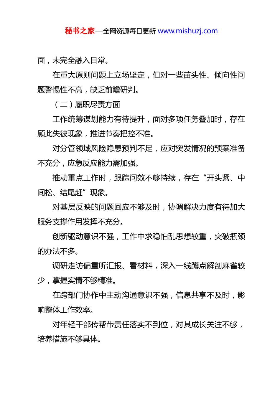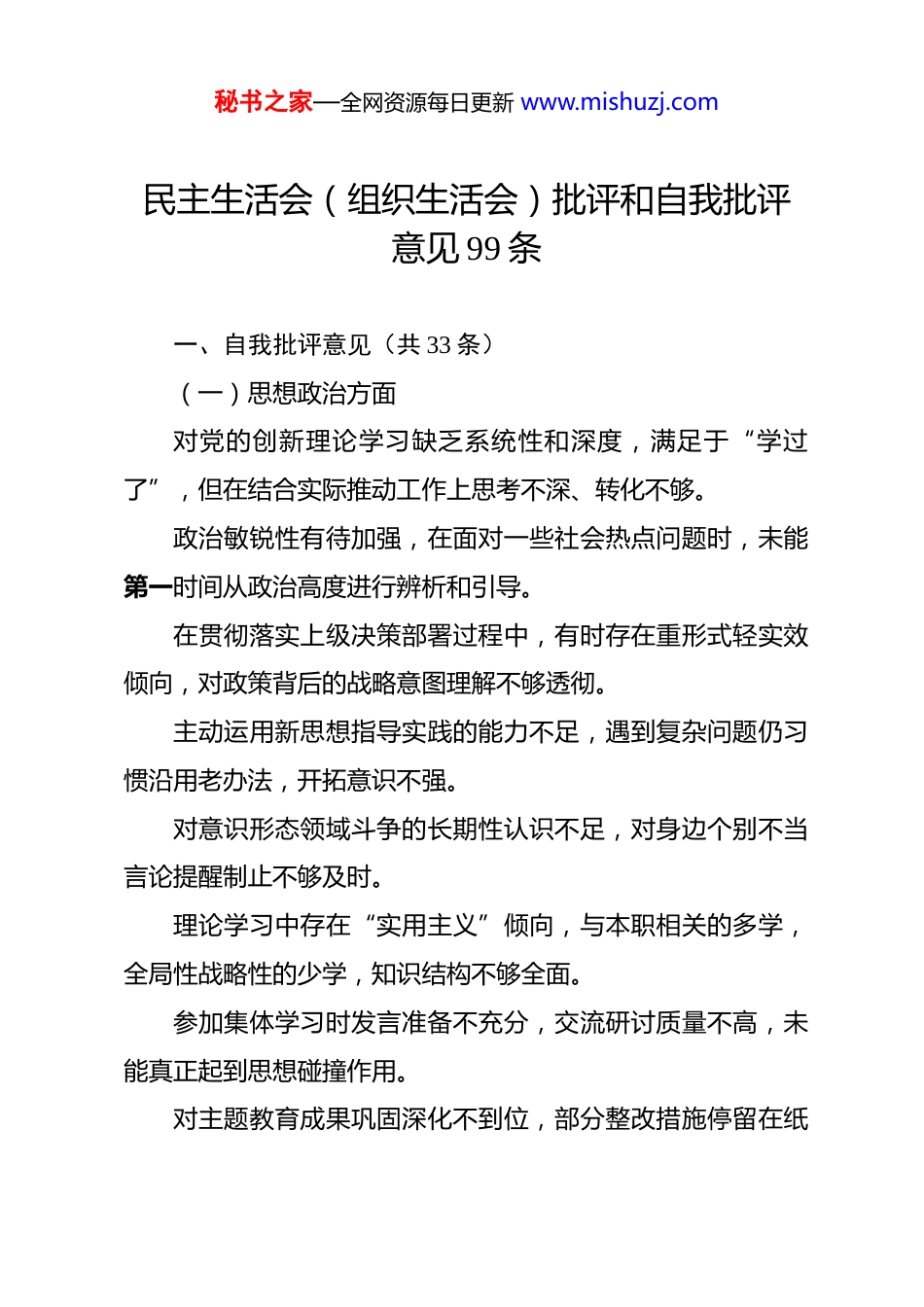 秘书之家—全网资源每日更新 www.mishuzj.com民主生活会(组织生活会)批评和自我批评意见 99 条 一、自我批评意见(共 33 条)(一)思想政治方面对党的创新理论学习缺乏系统性和深度,满足于“学过了”,但在结合实际推动工作上思考不深、转化不够。政治敏锐性有待加强,在面对一些社会热点问题时,未能第一时间从政治高度进行辨析和引导。在贯彻落实上级决策部署过程中,有时存在重形式轻实效倾向,对政策背后的战略意图理解不够透彻。主动运用新思想指导实践的能力不足,遇到复杂问题仍习惯沿用老办法,开拓意识不强。对意识形态领域斗争的长期性认识不足,对身边个别不当言论提醒制止不够及时。理论学习中存在“实用主义”倾向,与本职相关的多学,全局性战略性的少学,知识结构不够全面。参加集体学习时发言准备不充分,交流研讨质量不高,未能真正起到思想碰撞作用。对主题教育成果巩固深化不到位,部分整改措施停留在纸秘书之家—全网资源每日更新 www.mishuzj.com面,未完全融入日常。在重大原则问题上立场坚定,但对一些苗头性、倾向性问题警惕性不高,缺乏前瞻研判。(二)履职尽责方面工作统筹谋划能力有待提升,面对多项任务叠加时,存在顾此失彼现象,推进节奏把控不准。对分管领域风险隐患预判不足,应对突发情况的预案准备不充分,应急反应能力需加强。推动重点工作时,跟踪问效不够持续,存在“开头紧、中间松、结尾赶”现象。对基层反映的问题回应不够及时,协调解决力度有待加大服务支撑作用发挥不充分。创新驱动意识不强,工作中求稳怕乱思想较重,突破瓶颈的办法不多。调研走访偏重听汇报、看材料,深入一线蹲点解剖麻雀较少,掌握实情不够精准。在跨部门协作中主动沟通意识不强,信息共享不及时,影响整体工作效率。对年轻干部传帮带责任落实不到位,对其成长关注不够,培养措施不够具体。秘书之家—全网资源每日更新 www.mishuzj.com面对历史遗留问题有畏难情绪,攻坚克难的决心和韧劲还需进一步锤炼。工作标准有时不高,满足于“过得去”,距离“出精品”还有差距。数字化转型背景下,对新技术应用学习滞后,影响了工作质效提升。对政策执行中的堵点难点分析不够深入,提出优化建议的针对性和可操作性有待增强。年度目标分解后,过程监控机制不健全,阶段性评估调整不够及时。(三)工作作风方面服务群众宗旨意识有所弱化,接待来访时耐心不足,解释政策不够细致入微。存在一定的文山会海反弹苗头,个别会议可合并召开而未整合,挤占了抓落实时间。下基层调研存在“走马观花”现象,真正沉下去发现问题解决问题的时间偏少。对待群众诉求有时存在“等上报、再处理”心态,主动靠前服务意识不强。工作中偶有急躁情绪,对同事批评方式较为直接,不利于秘书之家—全网资源每日更新 www.mishuzj.com团队氛围建设。对非职责范围内的事项参与积极性不高,大局观需进一步强化。文件流转过程中存在拖延现象,导致承办单位办理时限被压缩。对窗口服务人员培训指导不够,群众满意度监测机制运行不畅。应对媒体和舆情的经验不足,信息发布口径把握不够精准。勤俭节约意识有所淡化,办公资源使用中存在一定程度浪费。八小时之外自我约束有所放松,参加健康有益活动较少,生活方式需更科学。二、相互批评意见(共 66 条)(一)同级之间相互批评(共 30 条)**同志在推进跨科室协作项目时,信息通报不够及时,建议建立定期沟通机制,提升协同效率。**同志对新出台政策研究不够深入,向基层解读时存在偏差,建议加强前置学习和集体备课。**同志工作责任心强,但有时过于追求完美,导致决策节奏偏慢,建议把握好效率与质量的平衡。秘书之家—全网资源每日更新 www.mishuzj.com**同志在会议上发表意见较谨慎,建言献策的积极性可以进一步提高。**同志承担任务较多,压力传导给团队成员时方式略显生硬,建议注重情绪疏导和正向激励。**同志对数据敏感度高,但在成果呈现上文字表达略显枯燥,建议提升材料综合提炼能力。**同志专业能力强,但与其他科室互动交流偏少,建议主动分享经验做法,促进共同提升。**同志对待群众咨询态度认真,但解释政策时语速较快,...