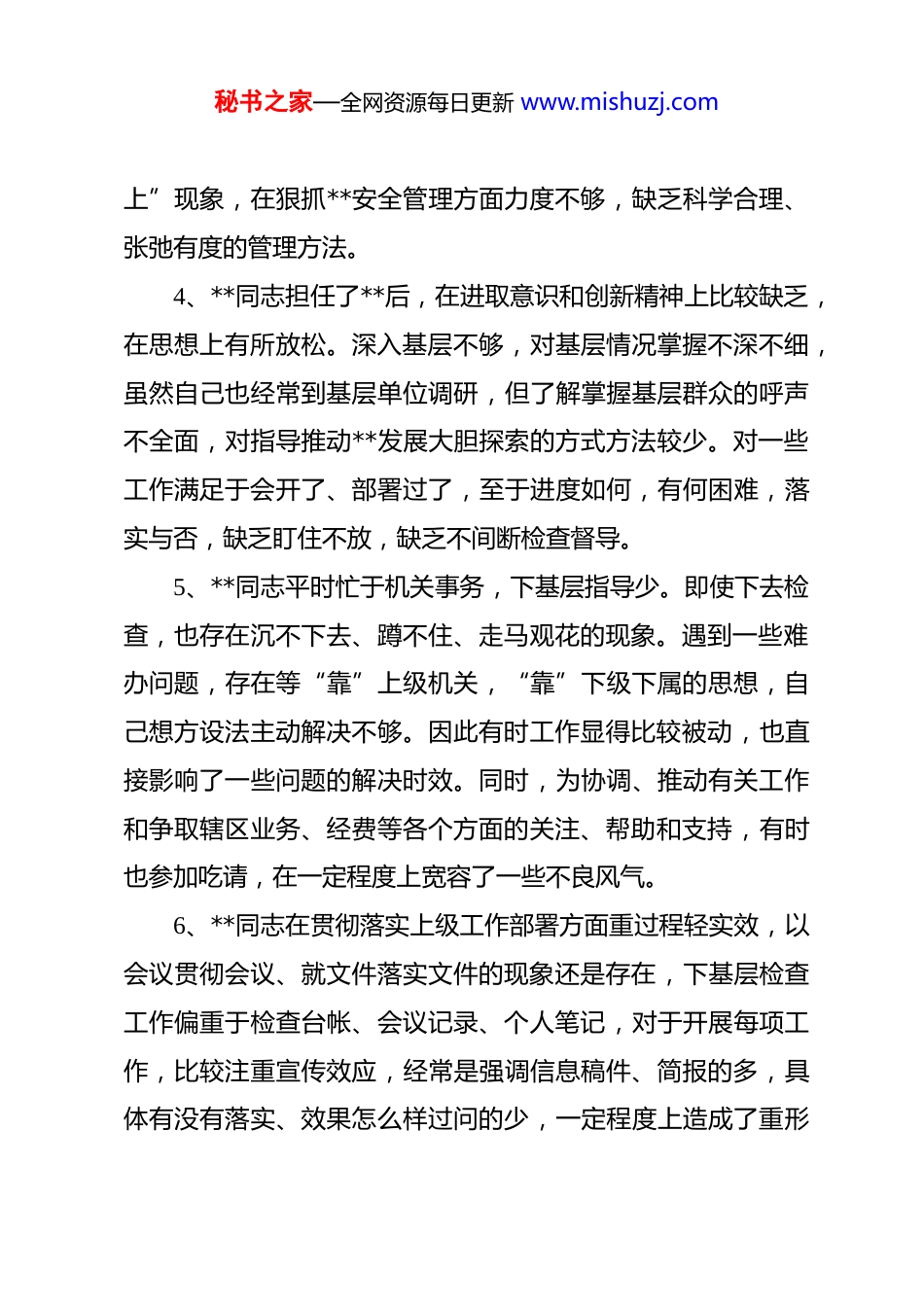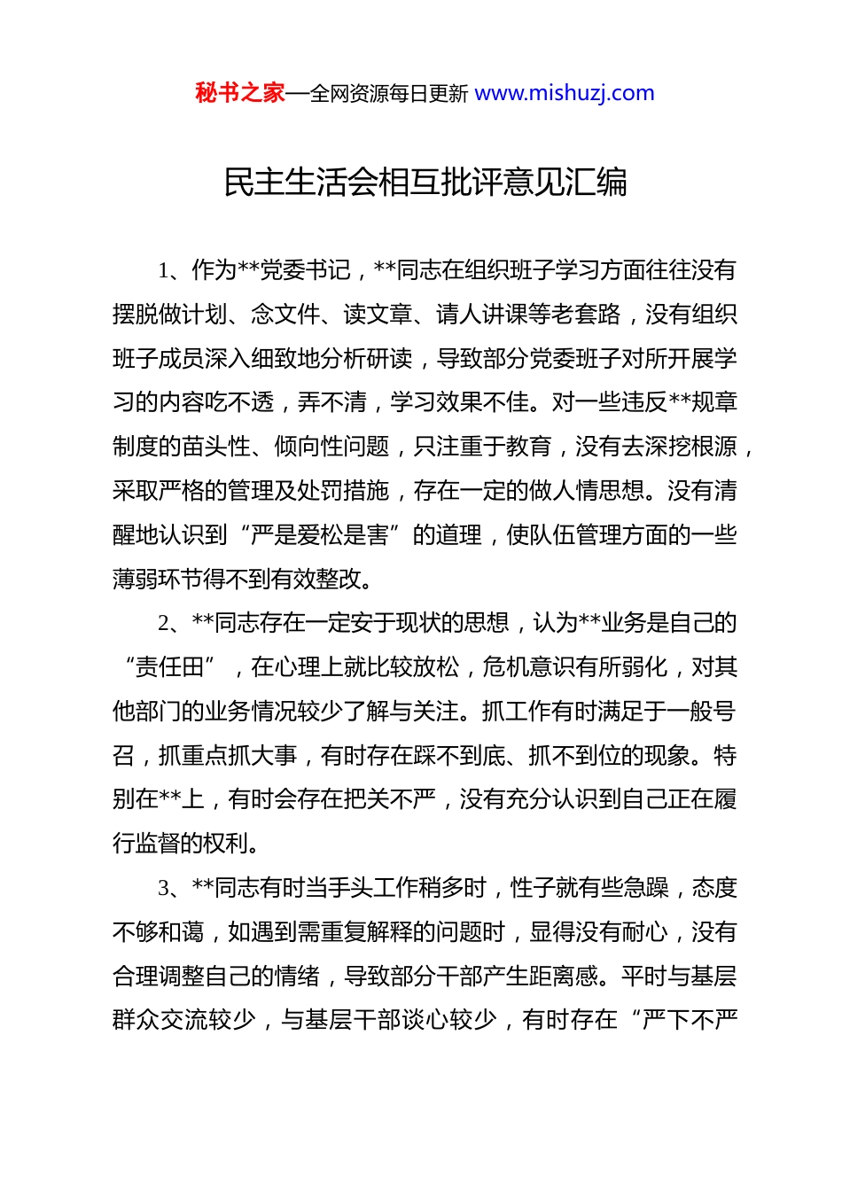 秘书之家—全网资源每日更新 www.mishuzj.com民主生活会相互批评意见汇编 1、作为**党委书记,**同志在组织班子学习方面往往没有摆脱做计划、念文件、读文章、请人讲课等老套路,没有组织班子成员深入细致地分析研读,导致部分党委班子对所开展学习的内容吃不透,弄不清,学习效果不佳。对一些违反**规章制度的苗头性、倾向性问题,只注重于教育,没有去深挖根源,采取严格的管理及处罚措施,存在一定的做人情思想。没有清醒地认识到“严是爱松是害”的道理,使队伍管理方面的一些薄弱环节得不到有效整改。2、**同志存在一定安于现状的思想,认为**业务是自己的“责任田”,在心理上就比较放松,危机意识有所弱化,对其他部门的业务情况较少了解与关注。抓工作有时满足于一般号召,抓重点抓大事,有时存在踩不到底、抓不到位的现象。特别在**上,有时会存在把关不严,没有充分认识到自己正在履行监督的权利。3、**同志有时当手头工作稍多时,性子就有些急躁,态度不够和蔼,如遇到需重复解释的问题时,显得没有耐心,没有合理调整自己的情绪,导致部分干部产生距离感。平时与基层群众交流较少,与基层干部谈心较少,有时存在“严下不严秘书之家—全网资源每日更新 www.mishuzj.com上”现象,在狠抓**安全管理方面力度不够,缺乏科学合理、张弛有度的管理方法。4、**同志担任了**后,在进取意识和创新精神上比较缺乏,在思想上有所放松。深入基层不够,对基层情况掌握不深不细,虽然自己也经常到基层单位调研,但了解掌握基层群众的呼声不全面,对指导推动**发展大胆探索的方式方法较少。对一些工作满足于会开了、部署过了,至于进度如何,有何困难,落实与否,缺乏盯住不放,缺乏不间断检查督导。5、**同志平时忙于机关事务,下基层指导少。即使下去检查,也存在沉不下去、蹲不住、走马观花的现象。遇到一些难办问题,存在等“靠”上级机关,“靠”下级下属的思想,自己想方设法主动解决不够。因此有时工作显得比较被动,也直接影响了一些问题的解决时效。同时,为协调、推动有关工作和争取辖区业务、经费等各个方面的关注、帮助和支持,有时也参加吃请,在一定程度上宽容了一些不良风气。6、**同志在贯彻落实上级工作部署方面重过程轻实效,以会议贯彻会议、就文件落实文件的现象还是存在,下基层检查工作偏重于检查台帐、会议记录、个人笔记,对于开展每项工作,比较注重宣传效应,经常是强调信息稿件、简报的多,具体有没有落实、效果怎么样过问的少,一定程度上造成了重形秘书之家—全网资源每日更新 www.mishuzj.com式、轻内容的导向,增加了基层的负担,影响了工作实效。7、**同志下基层调研时存在“走马观花、蜻蜓点水”的现象,对群众的所需所求不能全面掌握,对他们反映的问题有时解决得不够周全及时。同时,个人学习方面存在应付现象,系统学习理论不多,学习上级文件讲话精神有时理解不透彻,满足“会上讲”、“稿上念”。潜心思考,理论联系实际、指导实践,创新落实不多。8、**同志分管**业务,有时为业务需要,处理好与各党政机关的关系,在接待方面为了表诚意、显面子、不“失礼”,存在一定的超标准安排。日常工作中,与基层领导接触的多,与群众谈心的少,直接听取群众意见不及时不全面,帮助群众解决实际困难不多,对群众不同的生活情况了解的还不够细致,没有真正和群众打成一片。9、**同志在抓具体工作中,对下级、对下属提工作要求多、直接跟踪指导少,有时满足于会开了、文件发了,而没有一抓到底,缺乏踏石留印、抓铁有痕的作风,导致下面执行党委的意图和部署不到位、不准确,终端效果偏向走样,致使一些常见性问题屡查屡有、屡纠屡犯。在执勤过程中表率作用还是不明显,执法执勤时,大部分充当的是监督指导的角色,自身参与、冲锋陷阵少。秘书之家—全网资源每日更新 www.mishuzj.com10、**同志作为党委书记,在带领党委一班人攻坚克难、突破制约**建设发展瓶颈问题方面的举措还不够有力,作为“一班之长”,坐办公室听汇报多,深入基层单位调研思考少。有急功近利的思想,对一些工作总想尽快出亮点、出经验,尽管有的工作谋划不周密,落实不到位,...