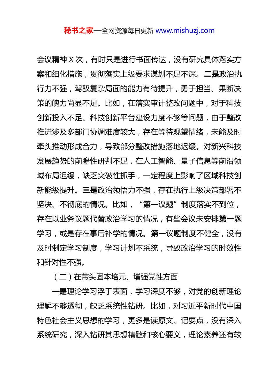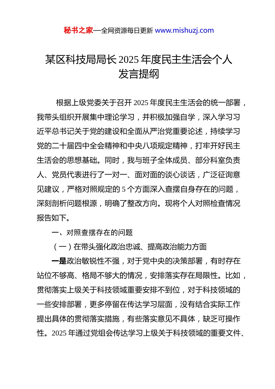 秘书之家—全网资源每日更新 www.mishuzj.com某区科技局局长 2025 年度民主生活会个人发言提纲 根据上级党委关于召开 2025 年度民主生活会的统一部署,我带头组织开展集中理论学习,并积极加强自学,深入学习习近平总书记关于党的建设和全面从严治党重要论述,持续学习党的二十届四中全会精神和中央八项规定精神,打牢开好民主生活会的思想基础。同时,我与班子全体成员、部分科室负责人、党员代表进行了一对一、面对面的谈心谈话,广泛征询意见建议,严格对照规定的 5 个方面深入查摆自身存在的问题,深刻剖析问题根源,明确了整改方向。现将个人对照检查情况报告如下。一、对照查摆存在的问题(一)在带头强化政治忠诚、提高政治能力方面一是政治敏锐性不强,对于党中央的决策部署,有时存在站位不够高、格局不够大的情况,安排落实存在局限性。比如,贯彻落实上级关于科技领域重要安排不到位,对于科技领域的一些安排部署,更多停留在传达学习层面,没有结合实际工作提出具体的贯彻落实措施,有些落实意见不具体,缺乏可操作性。2025 年通过党组会传达学习上级关于科技领域的重要文件、秘书之家—全网资源每日更新 www.mishuzj.com会议精神 X 次,有时只是进行书面传达,没有研究具体落实方案和细化措施,贯彻落实上级要求谋划不足不深。二是政治执行力不强,驾驭复杂局面的能力有待提升,勇于担当、果断决策的魄力尚显不足。比如,在落实审计整改问题中,对于科技创新投入不足、科技创新平台建设力度不够等问题,由于整改推进涉及多部门协调难度较大,存在等待观望情绪,未能及时牵头推动形成合力,导致部分整改措施落地迟缓。对新兴科技发展趋势的前瞻性研判不足,在人工智能、量子信息等前沿领域布局迟缓,缺乏突破性抓手,一定程度上影响了区域科技创新能级提升。三是政治领悟力不强,存在执行上级决策部署不坚决、不彻底的情况。比如,“第一议题”制度落实不到位,存在以业务议题代替政治学习的情况,有些会议未安排第一题学习,或是存在事后补学的情况。第一议题制度不健全,没有及时制定学习制度,学习计划不系统,导致政治学习的时效性和针对性不强。(二)在带头固本培元、增强党性方面一是理论学习浮于表面,学习深度不够,对党的创新理论理解不够透彻,缺乏系统性钻研。比如,对习近平新时代中国特色社会主义思想的学习,更多是读原文、记要点,没有深入系统研究,深入钻研其思想精髓和核心要义,理论素养还有较秘书之家—全网资源每日更新 www.mishuzj.com大提升空间。特别是在学习党的二十届四中全会的新论断和新论述时,我对其中“锚定科技强国目标,以科技现代化有力支撑中国式现代化”的理解仅停留在字面,对其如何指导区域通过以科技引领新质生产力深层逻辑思考不深,导致在指导工作时,提出的思路和办法创新性不强。二是学用结合不足,存在“学做脱节”现象,未能将党的创新理论有效转化为谋划工作的思路和破解难题的办法。比如,对辖区企业关于研发投入统计规范、科技创新政策要点、研发费用加计扣除等惠企政策宣传力度不够,政策解读不及时,导致企业对对政策理解不深、把握不准,晓率低、申报积极性不高。三是党性锤炼不自觉,精神追求坚守不牢固,艰苦奋斗、勤俭节约的意识有所弱化,俭节约的意识有所淡化。比如,对重点领域、关键岗位风险防控存在松懈麻痹思想,廉政风险防控机制落实不够到位,对科研项目资金使用、技术成果转化等关键环节监督力度不足。个别干部在推进科技创新政策落地时,存在重部署轻监管倾向,未能将纪律要求贯穿工作全过程。(三)在带头敬畏人民、敬畏组织、敬畏法纪方面一是法治意识有待提升,习惯于凭经验办事,运用法治思维推动工作的自觉性不足。比如,法治政府建设与科技业务融合不深,存在“重业务、轻法治”倾向,部分干部对法治建设秘书之家—全网资源每日更新 www.mishuzj.com的保障作用认识不足,在企业监管中运用法治思维预判风险、解决问题的能力欠缺,个别工作效率和规范性有待提升。法律法规学习培训以通用知识为主,与业务学用结合不紧密。在普法宣传集中节点时段,未能针对科技型中小企业进行普及...