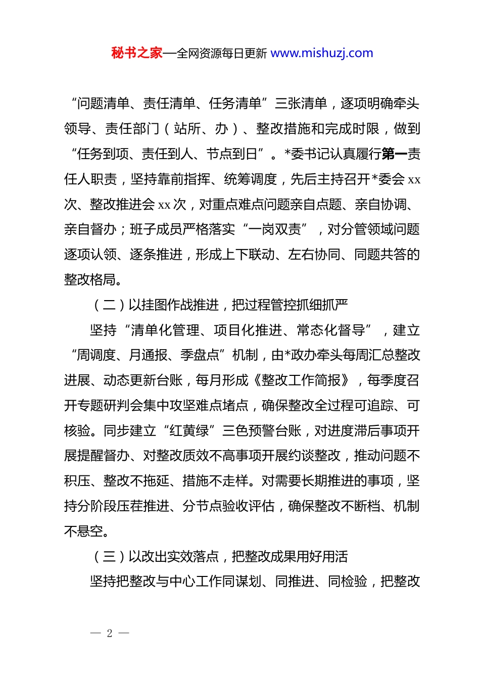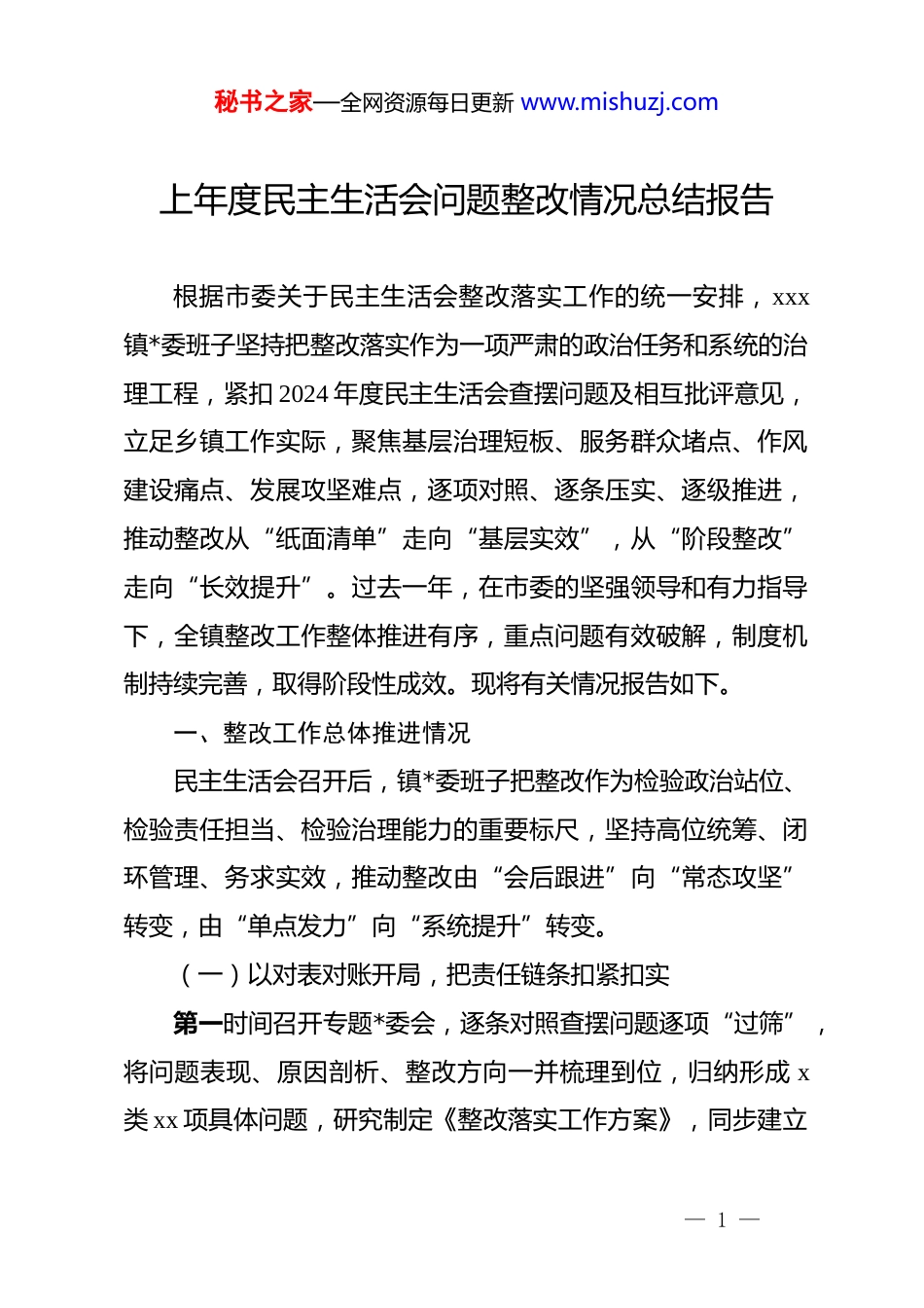 秘书之家—全网资源每日更新 www.mishuzj.com上年度民主生活会问题整改情况总结报告根据市委关于民主生活会整改落实工作的统一安排,xxx镇*委班子坚持把整改落实作为一项严肃的政治任务和系统的治理工程,紧扣 2024 年度民主生活会查摆问题及相互批评意见,立足乡镇工作实际,聚焦基层治理短板、服务群众堵点、作风建设痛点、发展攻坚难点,逐项对照、逐条压实、逐级推进,推动整改从“纸面清单”走向“基层实效”,从“阶段整改”走向“长效提升”。过去一年,在市委的坚强领导和有力指导下,全镇整改工作整体推进有序,重点问题有效破解,制度机制持续完善,取得阶段性成效。现将有关情况报告如下。一、整改工作总体推进情况民主生活会召开后,镇*委班子把整改作为检验政治站位、检验责任担当、检验治理能力的重要标尺,坚持高位统筹、闭环管理、务求实效,推动整改由“会后跟进”向“常态攻坚”转变,由“单点发力”向“系统提升”转变。(一)以对表对账开局,把责任链条扣紧扣实第一时间召开专题*委会,逐条对照查摆问题逐项“过筛”,将问题表现、原因剖析、整改方向一并梳理到位,归纳形成 x类 xx 项具体问题,研究制定《整改落实工作方案》,同步建立— 1 —秘书之家—全网资源每日更新 www.mishuzj.com“问题清单、责任清单、任务清单”三张清单,逐项明确牵头领导、责任部门(站所、办)、整改措施和完成时限,做到“任务到项、责任到人、节点到日”。*委书记认真履行第一责任人职责,坚持靠前指挥、统筹调度,先后主持召开*委会 xx次、整改推进会 xx 次,对重点难点问题亲自点题、亲自协调、亲自督办;班子成员严格落实“一岗双责”,对分管领域问题逐项认领、逐条推进,形成上下联动、左右协同、同题共答的整改格局。(二)以挂图作战推进,把过程管控抓细抓严坚持“清单化管理、项目化推进、常态化督导”,建立“周调度、月通报、季盘点”机制,由*政办牵头每周汇总整改进展、动态更新台账,每月形成《整改工作简报》,每季度召开专题研判会集中攻坚难点堵点,确保整改全过程可追踪、可核验。同步建立“红黄绿”三色预警台账,对进度滞后事项开展提醒督办、对整改质效不高事项开展约谈整改,推动问题不积压、整改不拖延、措施不走样。对需要长期推进的事项,坚持分阶段压茬推进、分节点验收评估,确保整改不断档、机制不悬空。(三)以改出实效落点,把整改成果用好用活坚持把整改与中心工作同谋划、同推进、同检验,把整改— 2 —秘书之家—全网资源每日更新 www.mishuzj.com成效体现在抓发展、强治理、惠民生、守底线的全过程。围绕“学用脱节”问题,健全*委会“第一议题”与重点工作研讨贯通机制,推动学习成果转化为务实举措;围绕“基层治理不精细”问题,推动网格治理、矛盾化解、民生服务流程再造;围绕“服务群众不够顺畅”问题,聚焦便民服务中心运行、村级代办、一次告知、限时办结等关键环节,推动服务提速提质;围绕“纪律作风仍需加力”问题,把深入贯彻中央⑧项规定精神学习教育贯穿整改全过程,与干部作风整治、基层减负、规范用权、风险防控一体落实,持续以严实作风保障整改见效。二、重点问题整改落实情况围绕民主生活会查摆问题,镇*委班子坚持靶向施策、分类推进,突出“抓重点、破难点、补短板、建机制”,确保整改一项、巩固一项、提升一项。(一)抓好“带头严守政治纪律和政治规矩,维护*的团结统一”方面的问题整改,筑牢政治忠诚根基。针对政治理论学习转化不够、贯彻上级决策部署有时存在重形式轻实效倾向、意识形态阵地管理仍需加强等问题,重点推进以下整改措施:一是把理论武装抓紧抓实。坚持把学习贯彻**************思想作为首要政治任务,把*中央重大决策部署、省委市委工— 3 —秘书之家—全网资源每日更新 www.mishuzj.com作要求作为*委会和理论学习中心组学习的首学内容,健全“学理论、抓研讨、明举措、促落实”闭环机制,推动学习由“碎片化”向“体系化”转变、由“泛泛学”向“带着问题学”转变。围绕乡村振兴、基层治理、项目攻坚、民生保障等重点任务,组织专题研学 xx 次,班子成员深入村(社区)、...