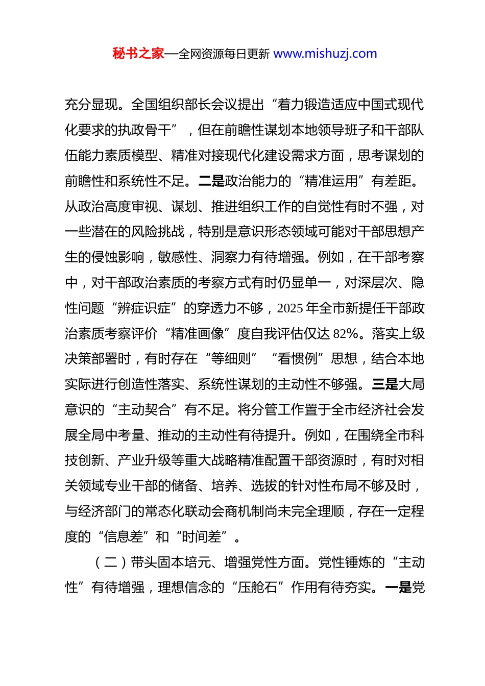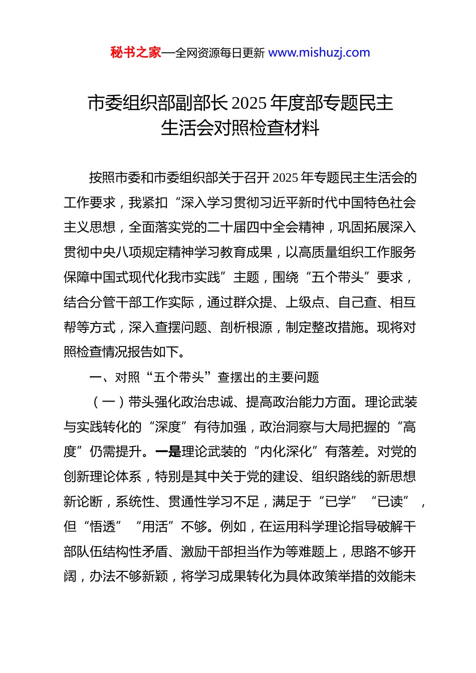 秘书之家—全网资源每日更新 www.mishuzj.com市委组织部副部长 2025 年度部专题民主生活会对照检查材料 按照市委和市委组织部关于召开 2025 年专题民主生活会的工作要求,我紧扣“深入学习贯彻习近平新时代中国特色社会主义思想,全面落实党的二十届四中全会精神,巩固拓展深入贯彻中央八项规定精神学习教育成果,以高质量组织工作服务保障中国式现代化我市实践”主题,围绕“五个带头”要求,结合分管干部工作实际,通过群众提、上级点、自己查、相互帮等方式,深入查摆问题、剖析根源,制定整改措施。现将对照检查情况报告如下。一、对照“五个带头”查摆出的主要问题(一)带头强化政治忠诚、提高政治能力方面。理论武装与实践转化的“深度”有待加强,政治洞察与大局把握的“高度”仍需提升。一是理论武装的“内化深化”有落差。对党的创新理论体系,特别是其中关于党的建设、组织路线的新思想新论断,系统性、贯通性学习不足,满足于“已学”“已读”,但“悟透”“用活”不够。例如,在运用科学理论指导破解干部队伍结构性矛盾、激励干部担当作为等难题上,思路不够开阔,办法不够新颖,将学习成果转化为具体政策举措的效能未秘书之家—全网资源每日更新 www.mishuzj.com充分显现。全国组织部长会议提出“着力锻造适应中国式现代化要求的执政骨干”,但在前瞻性谋划本地领导班子和干部队伍能力素质模型、精准对接现代化建设需求方面,思考谋划的前瞻性和系统性不足。二是政治能力的“精准运用”有差距。从政治高度审视、谋划、推进组织工作的自觉性有时不强,对一些潜在的风险挑战,特别是意识形态领域可能对干部思想产生的侵蚀影响,敏感性、洞察力有待增强。例如,在干部考察中,对干部政治素质的考察方式有时仍显单一,对深层次、隐性问题“辨症识症”的穿透力不够,2025 年全市新提任干部政治素质考察评价“精准画像”度自我评估仅达 82%。落实上级决策部署时,有时存在“等细则”“看惯例”思想,结合本地实际进行创造性落实、系统性谋划的主动性不够强。三是大局意识的“主动契合”有不足。将分管工作置于全市经济社会发展全局中考量、推动的主动性有待提升。例如,在围绕全市科技创新、产业升级等重大战略精准配置干部资源时,有时对相关领域专业干部的储备、培养、选拔的针对性布局不够及时,与经济部门的常态化联动会商机制尚未完全理顺,存在一定程度的“信息差”和“时间差”。(二)带头固本培元、增强党性方面。党性锤炼的“主动性”有待增强,理想信念的“压舱石”作用有待夯实。一是党秘书之家—全网资源每日更新 www.mishuzj.com性锻炼的“常态长效”有欠缺。存在一定的“事务主义”倾向,有时将更多精力投入到具体业务工作中,对持续加强主观世界改造、拧紧“总开关”的自觉性有所放松。参加党内政治生活,有时将组织生活会、谈心谈话视为一般性任务,“政治体检”功能发挥不充分。二是理想信念教育的“入脑入心”有短板。在组织开展分管领域和部内干部的理想信念教育时,对教育内容、形式的时代感和吸引力研究不够,有时方法相对传统,运用典型案例、红色资源进行沉浸式、互动式教育探索不足,导致教育效果一定程度上打了折扣,未能完全触及灵魂、筑牢根基。三是批评与自我批评的“战斗锋芒”有弱化。在民主生活会、组织生活会上,有时对同志的批评存在“和风细雨”多、“真刀真枪”少的情况,怕伤和气、怕影响团结;自我批评有时也停留在工作层面,对思想根源、党性层面的深度剖析不够,未能完全达到“红脸出汗、排毒治病”的效果。(三)带头敬畏人民、敬畏组织、敬畏法纪方面。宗旨意识的“践行度”有待提高,规矩意识的“敬畏感”有待强化。一是联系服务群众的“深度广度”不足。主动深入基层一线、走进普通干部群众听取意见建议不够经常,2025 年深入乡镇(街道)、村(社区)调研天数累计约 35 天,但“走马观花”式调研仍有存在,与基层干部群众“掏心窝”交流、掌握“第秘书之家—全网资源每日更新 www.mishuzj.com一手”鲜活情况不够充分。在制定干部政策时,有时听取专家学者、服务对象意见不够广泛。二是组织原则执行的“刚性硬...