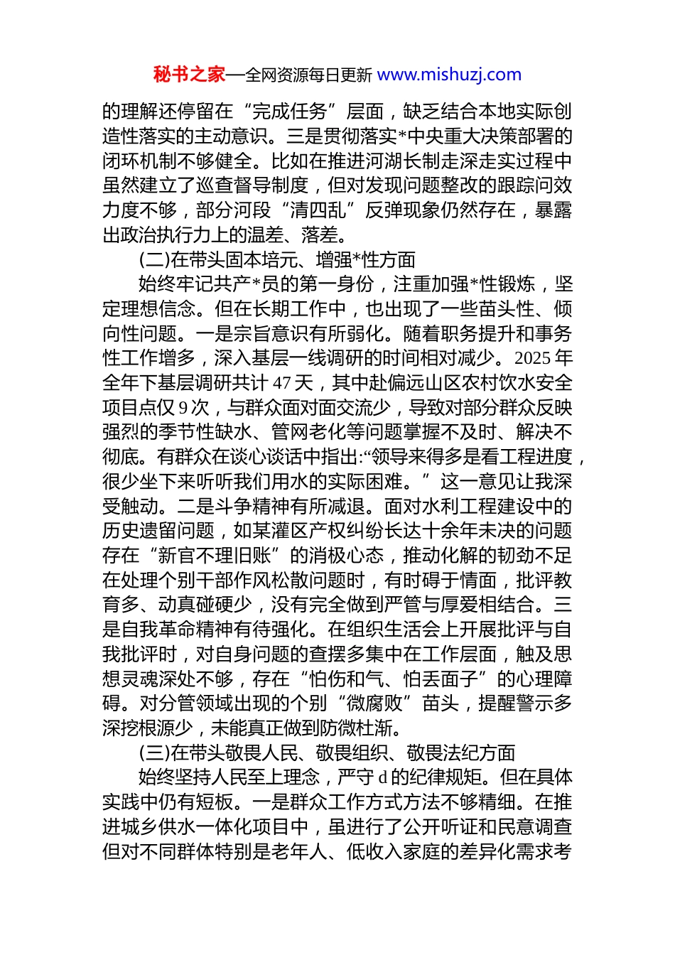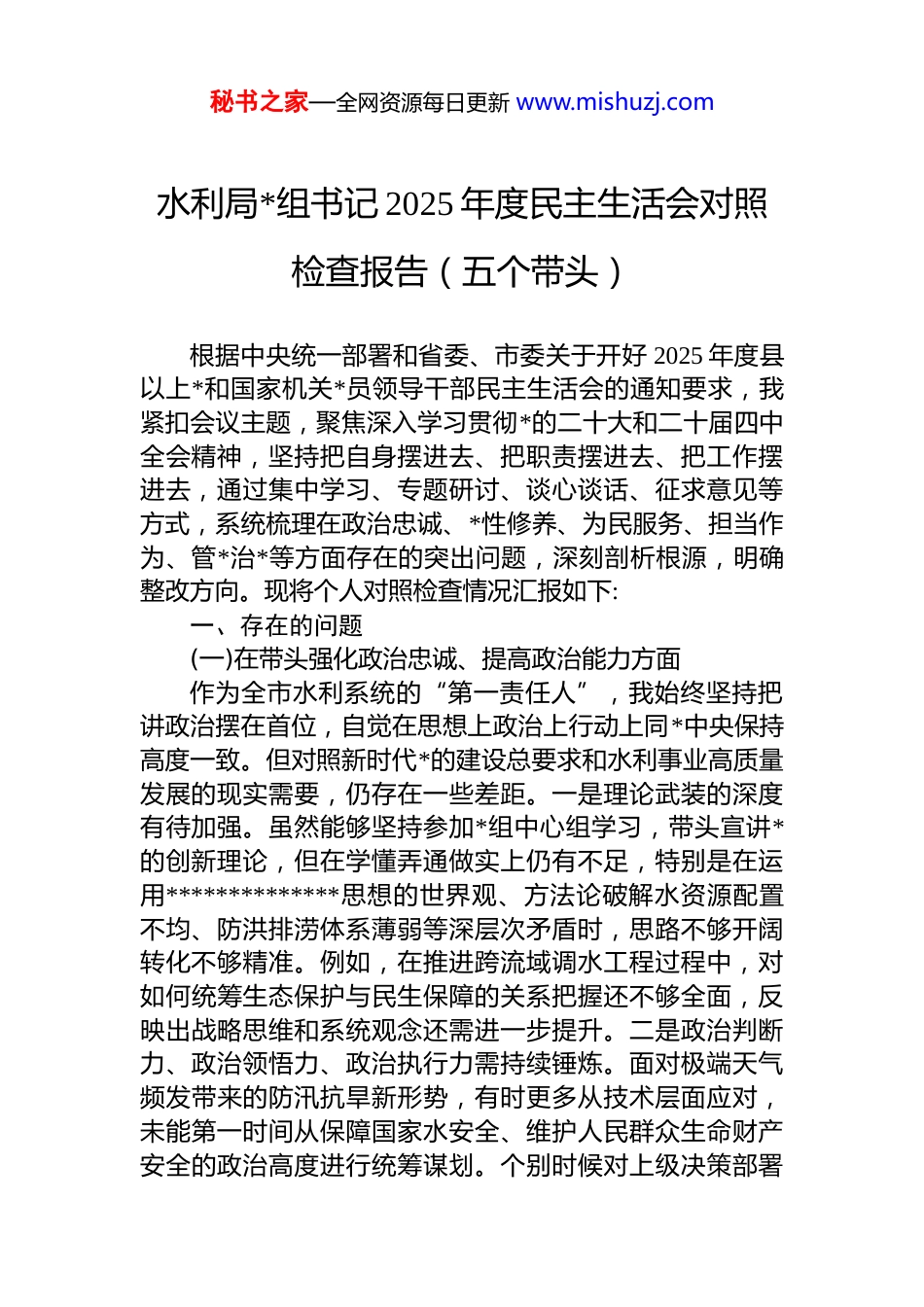 秘书之家—全网资源每日更新 www.mishuzj.com水利局*组书记 2025 年度民主生活会对照检查报告(五个带头)根据中央统一部署和省委、市委关于开好 2025 年度县以上*和国家机关*员领导干部民主生活会的通知要求,我紧扣会议主题,聚焦深入学习贯彻*的二十大和二十届四中全会精神,坚持把自身摆进去、把职责摆进去、把工作摆进去,通过集中学习、专题研讨、谈心谈话、征求意见等方式,系统梳理在政治忠诚、*性修养、为民服务、担当作为、管*治*等方面存在的突出问题,深刻剖析根源,明确整改方向。现将个人对照检查情况汇报如下:一、存在的问题(一)在带头强化政治忠诚、提高政治能力方面作为全市水利系统的“第一责任人”,我始终坚持把讲政治摆在首位,自觉在思想上政治上行动上同*中央保持高度一致。但对照新时代*的建设总要求和水利事业高质量发展的现实需要,仍存在一些差距。一是理论武装的深度有待加强。虽然能够坚持参加*组中心组学习,带头宣讲*的创新理论,但在学懂弄通做实上仍有不足,特别是在运用**************思想的世界观、方法论破解水资源配置不均、防洪排涝体系薄弱等深层次矛盾时,思路不够开阔转化不够精准。例如,在推进跨流域调水工程过程中,对如何统筹生态保护与民生保障的关系把握还不够全面,反映出战略思维和系统观念还需进一步提升。二是政治判断力、政治领悟力、政治执行力需持续锤炼。面对极端天气频发带来的防汛抗旱新形势,有时更多从技术层面应对,未能第一时间从保障国家水安全、维护人民群众生命财产安全的政治高度进行统筹谋划。个别时候对上级决策部署秘书之家—全网资源每日更新 www.mishuzj.com的理解还停留在“完成任务”层面,缺乏结合本地实际创造性落实的主动意识。三是贯彻落实*中央重大决策部署的闭环机制不够健全。比如在推进河湖长制走深走实过程中虽然建立了巡查督导制度,但对发现问题整改的跟踪问效力度不够,部分河段“清四乱”反弹现象仍然存在,暴露出政治执行力上的温差、落差。(二)在带头固本培元、增强*性方面始终牢记共产*员的第一身份,注重加强*性锻炼,坚定理想信念。但在长期工作中,也出现了一些苗头性、倾向性问题。一是宗旨意识有所弱化。随着职务提升和事务性工作增多,深入基层一线调研的时间相对减少。2025 年全年下基层调研共计 47 天,其中赴偏远山区农村饮水安全项目点仅 9 次,与群众面对面交流少,导致对部分群众反映强烈的季节性缺水、管网老化等问题掌握不及时、解决不彻底。有群众在谈心谈话中指出:“领导来得多是看工程进度,很少坐下来听听我们用水的实际困难。”这一意见让我深受触动。二是斗争精神有所减退。面对水利工程建设中的历史遗留问题,如某灌区产权纠纷长达十余年未决的问题存在“新官不理旧账”的消极心态,推动化解的韧劲不足在处理个别干部作风松散问题时,有时碍于情面,批评教育多、动真碰硬少,没有完全做到严管与厚爱相结合。三是自我革命精神有待强化。在组织生活会上开展批评与自我批评时,对自身问题的查摆多集中在工作层面,触及思想灵魂深处不够,存在“怕伤和气、怕丢面子”的心理障碍。对分管领域出现的个别“微腐败”苗头,提醒警示多深挖根源少,未能真正做到防微杜渐。(三)在带头敬畏人民、敬畏组织、敬畏法纪方面始终坚持人民至上理念,严守 d 的纪律规矩。但在具体实践中仍有短板。一是群众工作方式方法不够精细。在推进城乡供水一体化项目中,虽进行了公开听证和民意调查但对不同群体特别是老年人、低收入家庭的差异化需求考秘书之家—全网资源每日更新 www.mishuzj.com虑不周,导致部分地区水价调整后引发一定争议。事后复盘发现,前期政策解读不到位,宣传材料专业术语过多,群众“看不懂、算不清”,影响了政策落地温度。二是组织观念需进一步强化。在重大事项决策中,尽管严格执行民主集中制,但在个别议题讨论时,听取班子成员特别是年轻干部意见建议不够充分,存在“先入为主”“定调子”现象。如在研究智慧水利平台建设方案时,过于依赖专家团队意见,对基层技术人员提出的兼容性、运维成本等问题重视不足,造成后期系统对接困难。三是依法行政能...
