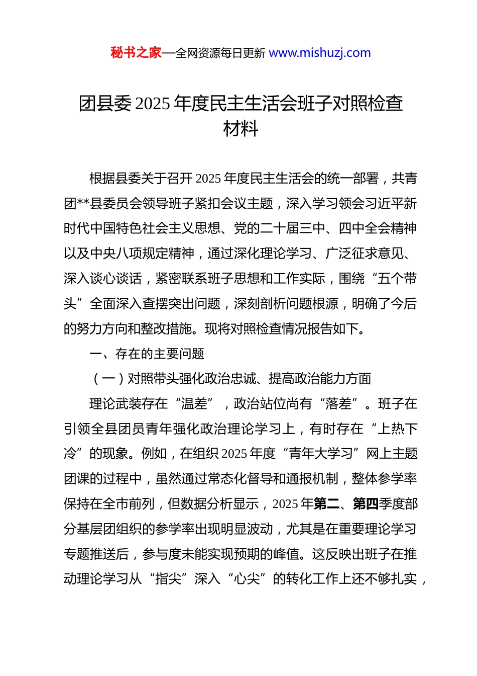 秘书之家—全网资源每日更新 www.mishuzj.com团县委 2025 年度民主生活会班子对照检查材料 根据县委关于召开 2025 年度民主生活会的统一部署,共青团**县委员会领导班子紧扣会议主题,深入学习领会习近平新时代中国特色社会主义思想、党的二十届三中、四中全会精神以及中央八项规定精神,通过深化理论学习、广泛征求意见、深入谈心谈话,紧密联系班子思想和工作实际,围绕“五个带头”全面深入查摆突出问题,深刻剖析问题根源,明确了今后的努力方向和整改措施。现将对照检查情况报告如下。一、存在的主要问题(一)对照带头强化政治忠诚、提高政治能力方面理论武装存在“温差”,政治站位尚有“落差”。班子在引领全县团员青年强化政治理论学习上,有时存在“上热下冷”的现象。例如,在组织 2025 年度“青年大学习”网上主题团课的过程中,虽然通过常态化督导和通报机制,整体参学率保持在全市前列,但数据分析显示,2025 年第二、第四季度部分基层团组织的参学率出现明显波动,尤其是在重要理论学习专题推送后,参与度未能实现预期的峰值。这反映出班子在推动理论学习从“指尖”深入“心尖”的转化工作上还不够扎实,秘书之家—全网资源每日更新 www.mishuzj.com部分青年将学习视为一项需要打卡完成的“任务”,未能完全实现从“要我学”到“我要学”的内化转变。贯彻执行不够“坚决”,决策部署偶有“偏差”。班子在承接和落实上级重大决策部署时,行动迅速,但有时在结合**县青年工作实际、进行创造性转化方面思考得不够深、不够透。在 2025 年夏季部署“返家乡”社会实践活动时,初期方案设计更多地延续了以往的通用模式,侧重于疫情防控、社区服务等常规志愿岗位,而对如何引导返乡大学生精准对接我县数字经济、文旅产业等高质量发展“首要任务”的特色项目谋划不足。直到活动中期,根据乡镇团委的反馈才进行了岗位调整和项目增补,这在一定程度上反映出班子在将宏观政策转化为微观项目时的前瞻性和精准性有待加强。风险防范存有“盲区”,斗争精神尚需“磨砺”。面对意识形态领域的复杂形势,班子在维护青年思想阵地安全方面,有时存在被动应对的情况。2025 年下半年,针对网络上出现的涉及青年就业、生活成本的消极言论和不实信息,班子的应对措施主要集中在事后的舆情监测和引导澄清上,对于如何建立常态化的青年思想动态预警机制、如何通过更具吸引力的正面叙事主动塑造青年舆论场、如何组织青年网络文明志愿者有效开展舆论斗争等方面,缺乏系统性的战术布局和“下先手棋”秘书之家—全网资源每日更新 www.mishuzj.com的战略主动。(二)对照带头固本培元、增强党性方面理想信念教育方式“传统”,党性修养锤炼途径“单一”班子在组织机关党员干部和团干部进行党性教育时,对传统的“三会两制一课”、集中学习等方式较为依赖,形式创新不足。2025 年 5 月,在组织学习新修订的《中国共产党纪律处分条例》时,主要采用了领学宣讲和个人自学的模式。虽然完成了规定动作,但未能有效结合团干部年轻、思想活跃的特点,设计情景模拟、案例辨析等更具代入感的学习环节,导致部分年轻干部对党纪党规的理解停留在“不触碰红线”的浅层认知,未能深刻领会其背后蕴含的党性原则和精神实质。精神谱系传承有所“弱化”,红色基因融入尚欠“深化”**县拥有丰富的红色文化资源,班子也注重利用这些资源开展青年教育活动。但在具体实践中,有时存在“重形式、轻实效”的倾向。2025 年清明节期间,组织了一批新入团的优秀中学生前往**革命烈士陵园开展纪念活动,活动流程完整、场面庄重,但活动结束后,对于如何引导学生将现场的感动和震撼转化为持久的学习动力和报国之志,缺乏系统的后续设计,如主题征文、分享交流会、红色故事微视频创作等延伸活动未能及时跟进,使得红色教育的效果打了折扣。秘书之家—全网资源每日更新 www.mishuzj.com价值观念引导浮于“说教”,道德品质涵养流于“表面”在推动社会主义核心价值观融入青年日常生活方面,工作抓手不够具体,存在一定的“空对空”现象。例如,2025 年在全县中学生中发起了“诚信友善”主题宣传月活动,主要通...