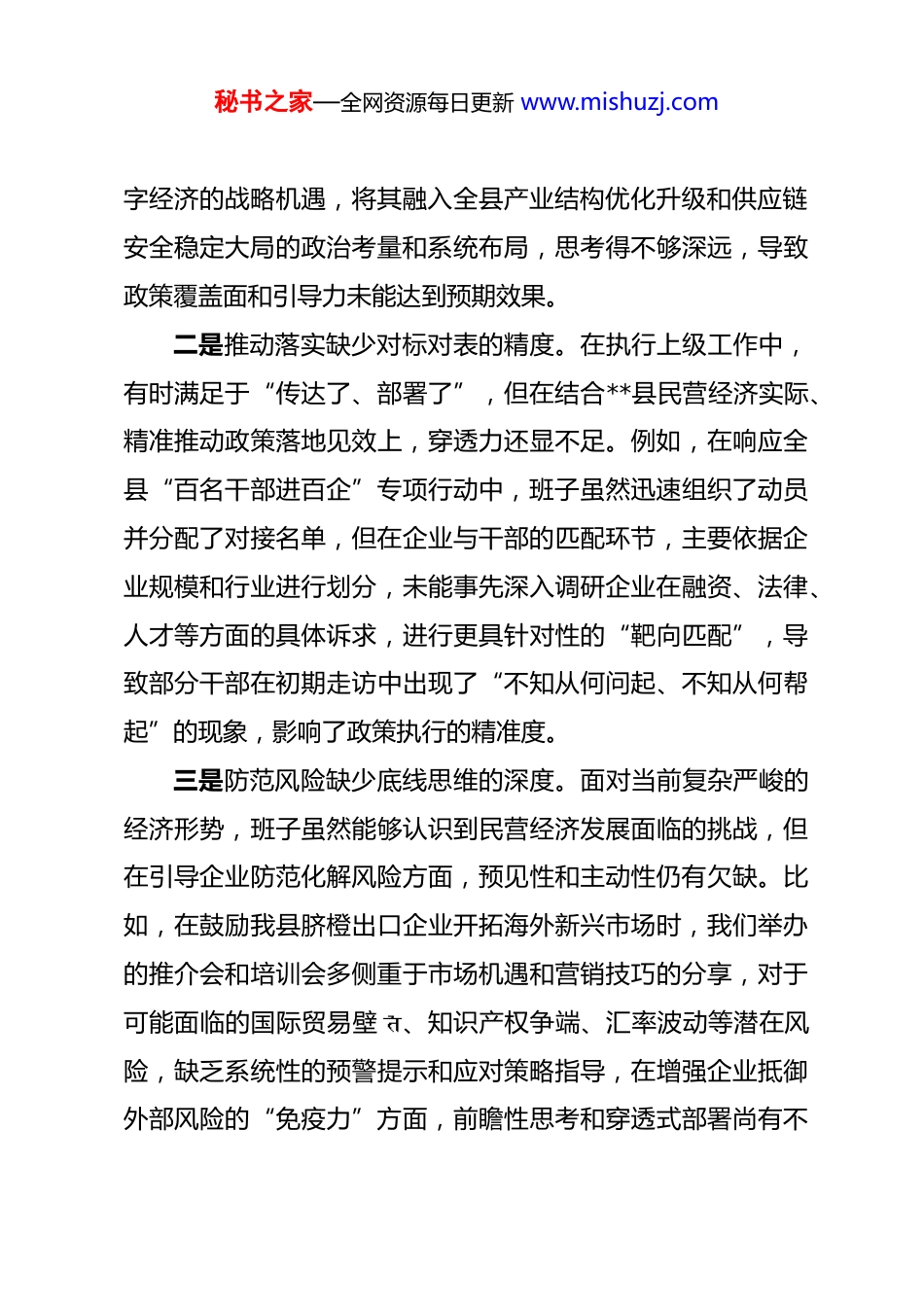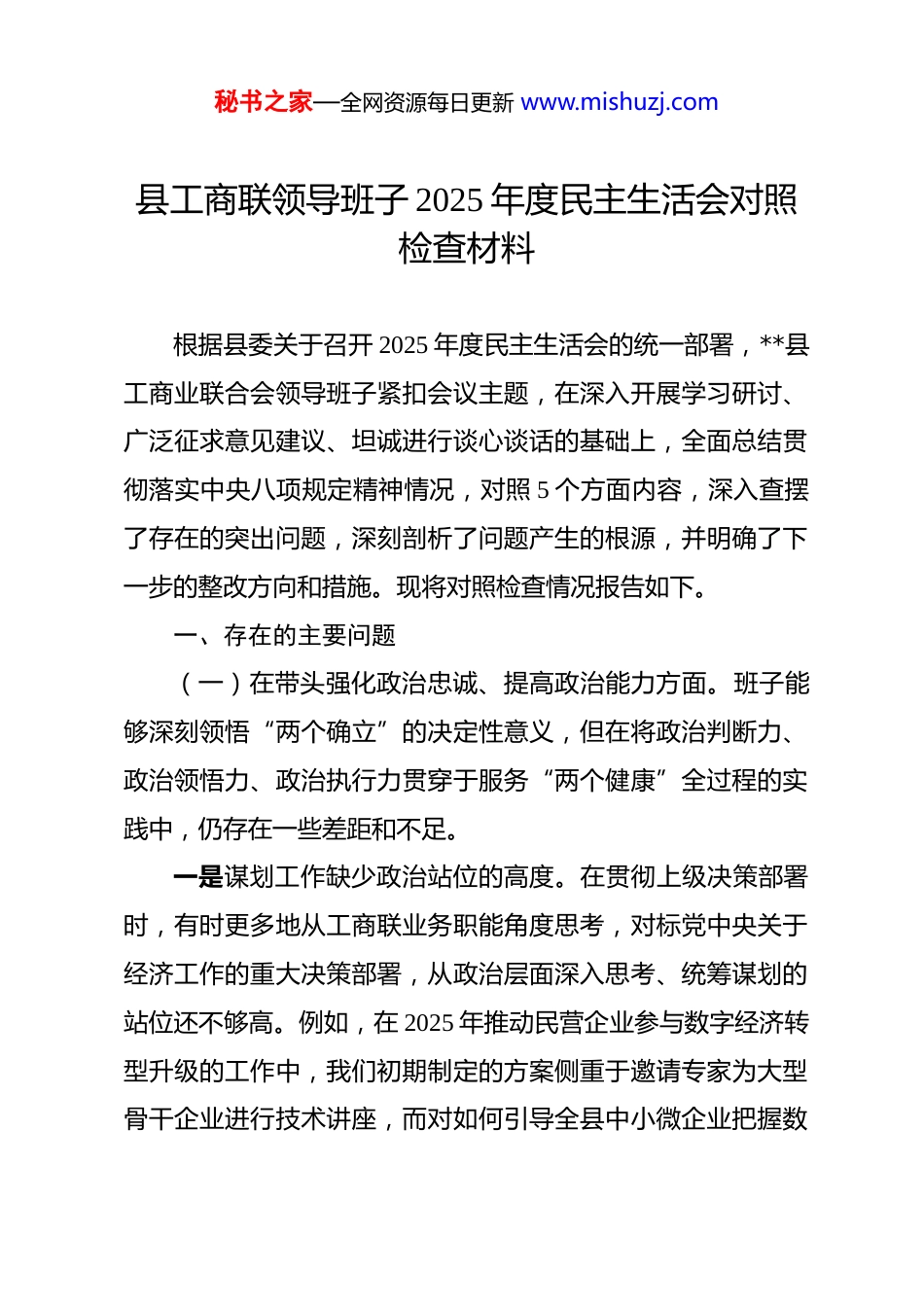 秘书之家—全网资源每日更新 www.mishuzj.com县工商联领导班子 2025 年度民主生活会对照检查材料 根据县委关于召开 2025 年度民主生活会的统一部署,**县工商业联合会领导班子紧扣会议主题,在深入开展学习研讨、广泛征求意见建议、坦诚进行谈心谈话的基础上,全面总结贯彻落实中央八项规定精神情况,对照 5 个方面内容,深入查摆了存在的突出问题,深刻剖析了问题产生的根源,并明确了下一步的整改方向和措施。现将对照检查情况报告如下。一、存在的主要问题(一)在带头强化政治忠诚、提高政治能力方面。班子能够深刻领悟“两个确立”的决定性意义,但在将政治判断力、政治领悟力、政治执行力贯穿于服务“两个健康”全过程的实践中,仍存在一些差距和不足。一是谋划工作缺少政治站位的高度。在贯彻上级决策部署时,有时更多地从工商联业务职能角度思考,对标党中央关于经济工作的重大决策部署,从政治层面深入思考、统筹谋划的站位还不够高。例如,在 2025 年推动民营企业参与数字经济转型升级的工作中,我们初期制定的方案侧重于邀请专家为大型骨干企业进行技术讲座,而对如何引导全县中小微企业把握数秘书之家—全网资源每日更新 www.mishuzj.com字经济的战略机遇,将其融入全县产业结构优化升级和供应链安全稳定大局的政治考量和系统布局,思考得不够深远,导致政策覆盖面和引导力未能达到预期效果。二是推动落实缺少对标对表的精度。在执行上级工作中,有时满足于“传达了、部署了”,但在结合**县民营经济实际、精准推动政策落地见效上,穿透力还显不足。例如,在响应全县“百名干部进百企”专项行动中,班子虽然迅速组织了动员并分配了对接名单,但在企业与干部的匹配环节,主要依据企业规模和行业进行划分,未能事先深入调研企业在融资、法律、人才等方面的具体诉求,进行更具针对性的“靶向匹配”,导致部分干部在初期走访中出现了“不知从何问起、不知从何帮起”的现象,影响了政策执行的精准度。三是防范风险缺少底线思维的深度。面对当前复杂严峻的经济形势,班子虽然能够认识到民营经济发展面临的挑战,但在引导企业防范化解风险方面,预见性和主动性仍有欠缺。比如,在鼓励我县脐橙出口企业开拓海外新兴市场时,我们举办的推介会和培训会多侧重于市场机遇和营销技巧的分享,对于可能面临的国际贸易壁 तें�、知识产权争端、汇率波动等潜在风险,缺乏系统性的预警提示和应对策略指导,在增强企业抵御外部风险的“免疫力”方面,前瞻性思考和穿透式部署尚有不秘书之家—全网资源每日更新 www.mishuzj.com足。(二)在带头固本培元、增强党性方面。班子始终坚持以习近平新时代中国特色社会主义思想凝心铸魂,但对照更高标准的党性修养要求,在理论学习与实践转化的深度融合上,仍存在一定的温差。一是理论武装“学用结合”不够紧密。班子成员能够坚持参加党组理论学习中心组学习,但有时存在“为学习而学习”的倾向,将理论学习成果创造性地转化为推动工商联工作创新发展思路和举措的能力有待加强。2025 年,我们多次组织学习了关于“新质生产力”的重要论述,讨论发言比较踊跃,但学习成果主要停留在概念理解和宏观解读层面,对于如何结合**县以农业、旅游业为特色的民营经济结构,引导企业嫁接新技术、培育新业态,形成具有地方特色的新质生产力,未能提出体系化、可操作的路径图,导致理论学习与中心工作的“两张皮”现象依然存在。二是党性锤炼“实践味道”不够浓厚。在组织开展党性教育活动时,形式和载体还不够丰富,与服务民营企业的中心工作结合不够紧密,未能充分彰显共产党人的精神追求和为民情怀。例如,在组织“七一”主题党日活动时,我们前往了革命旧址重温入党誓词,活动本身很有意义,但未能进一步延伸活秘书之家—全网资源每日更新 www.mishuzj.com动内涵,比如将会场搬到某个遇到发展瓶颈的民营企业,现场开展“党建引领、助企纾困”的专题组织生活会,将革命先辈的奋斗精神直接转化为解决企业急难愁盼问题的实际行动,使得党性锤炼的实践指向性不够鲜明。三是思想改造“自我革命”不够持久。班子成员能够认真参加警示教育和专题...