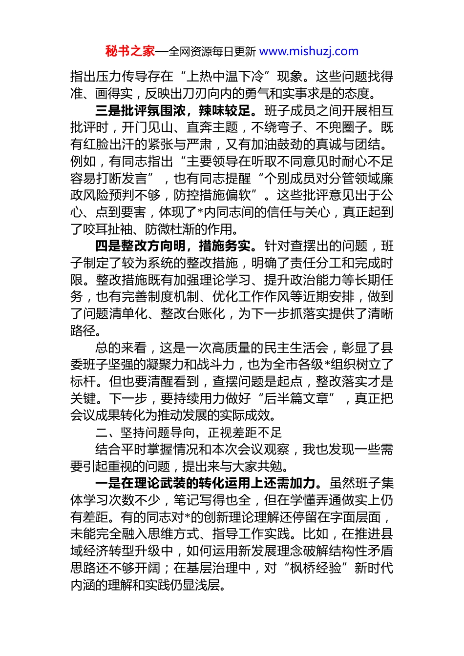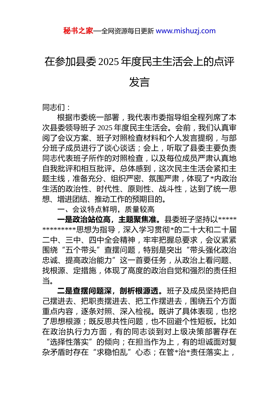 秘书之家—全网资源每日更新 www.mishuzj.com在参加县委 2025 年度民主生活会上的点评发言同志们:根据市委统一部署,我代表市委指导组全程列席了本次县委领导班子 2025 年度民主生活会。会前,我们认真审阅了会议方案、班子对照检查材料和个人发言提纲,与部分班子成员进行了谈心谈话;会上,听取了县委主要负责同志代表班子所作的对照检查,以及每位成员严肃认真地自我批评和相互批评。总体感到,这次民主生活会紧扣主题主线,准备充分、组织严密、氛围严肃,体现了*内政治生活的政治性、时代性、原则性、战斗性,达到了统一思想、增进团结、推动工作的预期目的。一、会议特点鲜明,质量较高一是政治站位高,主题聚焦准。县委班子坚持以**************思想为指导,深入学习贯彻*的二十大和二十届二中、三中、四中全会精神,牢牢把握总要求,会议紧紧围绕“五个带头”查摆问题,特别是突出“带头强化政治忠诚、提高政治能力”这一首要任务,从政治上看问题、找根源、定措施,体现了高度的政治自觉和强烈的责任担当。二是查摆问题深,剖析根源透。班子及成员坚持把自己摆进去、把职责摆进去、把工作摆进去,围绕五个方面重点内容,逐条对照、深入检视。既讲了具体表现,也挖了思想根源;既反思共性问题,也不回避个性短板。比如在政治执行力方面,有的同志谈到对上级决策部署存在“选择性落实”的倾向;在担当作为上,有的坦诚面对复杂矛盾时存在“求稳怕乱”心态;在管*治*责任落实上,秘书之家—全网资源每日更新 www.mishuzj.com指出压力传导存在“上热中温下冷”现象。这些问题找得准、画得实,反映出刀刃向内的勇气和实事求是的态度。三是批评氛围浓,辣味较足。班子成员之间开展相互批评时,开门见山、直奔主题,不绕弯子、不兜圈子。既有红脸出汗的紧张与严肃,又有加油鼓劲的真诚与团结。例如,有同志指出“主要领导在听取不同意见时耐心不足容易打断发言”,也有同志提醒“个别成员对分管领域廉政风险预判不够,防控措施偏软”。这些批评意见出于公心、点到要害,体现了*内同志间的信任与关心,真正起到了咬耳扯袖、防微杜渐的作用。四是整改方向明,措施务实。针对查摆出的问题,班子制定了较为系统的整改措施,明确了责任分工和完成时限。整改措施既有加强理论学习、提升政治能力等长期任务,也有完善制度机制、优化工作作风等近期安排,做到了问题清单化、整改台账化,为下一步抓落实提供了清晰路径。总的来看,这是一次高质量的民主生活会,彰显了县委班子坚强的凝聚力和战斗力,也为全市各级*组织树立了标杆。但也要清醒看到,查摆问题是起点,整改落实才是关键。下一步,要持续用力做好“后半篇文章”,真正把会议成果转化为推动发展的实际成效。二、坚持问题导向,正视差距不足结合平时掌握情况和本次会议观察,我也发现一些需要引起重视的问题,提出来与大家共勉。一是在理论武装的转化运用上还需加力。虽然班子集体学习次数不少,笔记写得也全,但在学懂弄通做实上仍有差距。有的同志对*的创新理论理解还停留在字面层面,未能完全融入思维方式、指导工作实践。比如,在推进县域经济转型升级中,如何运用新发展理念破解结构性矛盾思路还不够开阔;在基层治理中,对“枫桥经验”新时代内涵的理解和实践仍显浅层。秘书之家—全网资源每日更新 www.mishuzj.com二是在为民服务的精准度上还有提升空间。尽管近年来民生投入持续加大,群众获得感不断增强,但一些政策落地“最后一公里”仍存堵点。比如,老旧小区改造项目虽已完成 85%,但后续物业管理跟进不及时,部分小区出现环境反弹;农村养老服务设施建设加快,但专业护理人员短缺,服务质量参差不齐。这说明我们在倾听群众真实诉求、回应多元需求方面还需更细更实。三是在攻坚克难的斗争精神上仍需锤炼。面对深层次体制机制障碍,个别同志存在畏难情绪,习惯于按部就班推进,缺乏主动破局的锐气。如某工业园区历史遗留用地问题多年未解,虽多次协调,但始终未能拿出突破性方案影响了一批优质项目落地。这种“啃不下硬骨头”的状态与当前改革发展形势不相适应。四是在全面从严治*压力传导上尚有薄弱环节。虽...