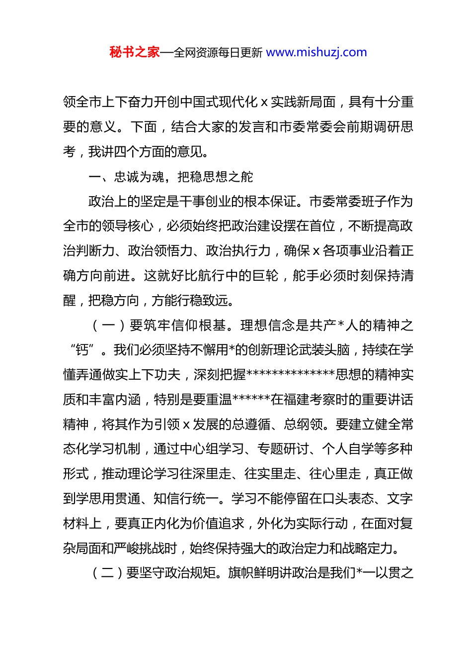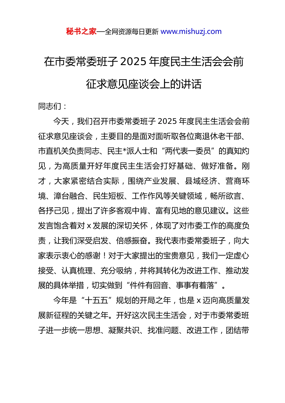 秘书之家—全网资源每日更新 www.mishuzj.com在市委常委班子 2025 年度民主生活会会前征求意见座谈会上的讲话同志们:今天,我们召开市委常委班子 2025 年度民主生活会会前征求意见座谈会,主要目的是面对面听取各位离退休老干部、市直机关负责同志、民主*派人士和“两代表一委员”的真知灼见,为高质量开好年度民主生活会打好基础、做好准备。刚才,大家紧密结合实际,围绕产业发展、县域经济、营商环境、漳台融合、民生短板、工作作风等关键领域,畅所欲言、各抒己见,提出了许多客观中肯、富有见地的意见建议。这些发言饱含着对 x 发展的深切关怀,体现了对市委工作的高度负责,让我们深受启发、倍感振奋。我代表市委常委班子,向大家表示衷心的感谢!对于大家提出的宝贵意见,我们一定虚心接受、认真梳理、充分吸纳,并将其转化为改进工作、推动发展的具体举措,切实做到“件件有回音、事事有着落”。今年是“十五五”规划的开局之年,也是 x 迈向高质量发展新征程的关键之年。开好这次民主生活会,对于市委常委班子进一步统一思想、凝聚共识、找准问题、改进工作,团结带秘书之家—全网资源每日更新 www.mishuzj.com领全市上下奋力开创中国式现代化 x 实践新局面,具有十分重要的意义。下面,结合大家的发言和市委常委会前期调研思考,我讲四个方面的意见。一、忠诚为魂,把稳思想之舵政治上的坚定是干事创业的根本保证。市委常委班子作为全市的领导核心,必须始终把政治建设摆在首位,不断提高政治判断力、政治领悟力、政治执行力,确保 x 各项事业沿着正确方向前进。这就好比航行中的巨轮,舵手必须时刻保持清醒,把稳方向,方能行稳致远。(一)要筑牢信仰根基。理想信念是共产*人的精神之“钙”。我们必须坚持不懈用*的创新理论武装头脑,持续在学懂弄通做实上下功夫,深刻把握**************思想的精神实质和丰富内涵,特别是要重温******在福建考察时的重要讲话精神,将其作为引领 x 发展的总遵循、总纲领。要建立健全常态化学习机制,通过中心组学习、专题研讨、个人自学等多种形式,推动理论学习往深里走、往实里走、往心里走,真正做到学思用贯通、知信行统一。学习不能停留在口头表态、文字材料上,要真正内化为价值追求,外化为实际行动,在面对复杂局面和严峻挑战时,始终保持强大的政治定力和战略定力。(二)要坚守政治规矩。旗帜鲜明讲政治是我们*一以贯之秘书之家—全网资源每日更新 www.mishuzj.com的要求。市委常委班子要带头深刻领悟“两个确立”的决定性意义,增强“四个意识”、坚定“四个自信”、做到“两个维护”,自觉在思想上政治上行动上同以***同志为核心的*中央保持高度一致。要严格执行*的政治纪律和政治规矩,决不允许自行其是、各自为政,确保中央各项决策部署和省委工作要求在 x 不折不扣落地生根。工作中要自觉对照*的理论和路线方针政策,对照*章*规 dj,时时处处检视自身言行,做到*中央提倡的坚决响应、*中央决定的坚决执行、*中央禁止的坚决不做,切实维护*的团结统一和集中领导。(三)要提升政治能力。政治能力是领导干部的第一能力。班子成员要善于从政治上看问题、想问题、作决策,不断提高驾驭全局、防范风险的能力水平。要增强政治敏锐性和政治鉴别力,对经济社会发展中可能出现的风险挑战,要见微知著、防患未然,特别是要有效防范化解金融、房地产、地方政府债务等重点领域风险,牢牢守住不发生系统性风险的底线。要发扬斗争精神,增强斗争本领,在原则问题上敢于亮剑、敢于碰硬,坚决同一切损害*和人民利益的行为作斗争,切实担负起*和人民赋予的政治责任。要善于运用“穿透式”调研方法,深入基层一线,透过现象看本质,从具体业务工作中发现政治端倪,从错综复杂的矛盾中把握政治逻辑,使各项工作都体现秘书之家—全网资源每日更新 www.mishuzj.com政治要求、达到政治效果。二、实干为要,激活动力之源发展是解决一切问题的基础和关键。当前,x 正处在爬坡过坎、转型升级的关键时期,我们必须牢牢把握高质量发展这个首要任务,聚焦“三头六臂”支柱产业培育,全力以赴扬优势、解难题、促发展,努力在...