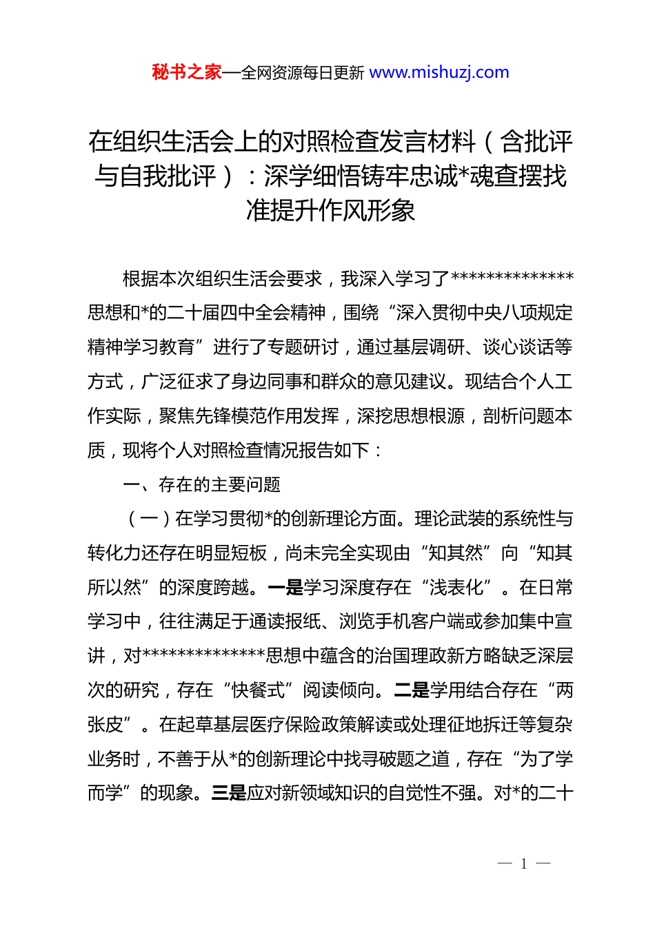 秘书之家—全网资源每日更新 www.mishuzj.com在组织生活会上的对照检查发言材料(含批评与自我批评):深学细悟铸牢忠诚*魂查摆找准提升作风形象根据本次组织生活会要求,我深入学习了**************思想和*的二十届四中全会精神,围绕“深入贯彻中央八项规定精神学习教育”进行了专题研讨,通过基层调研、谈心谈话等方式,广泛征求了身边同事和群众的意见建议。现结合个人工作实际,聚焦先锋模范作用发挥,深挖思想根源,剖析问题本质,现将个人对照检查情况报告如下:一、存在的主要问题(一)在学习贯彻*的创新理论方面。理论武装的系统性与转化力还存在明显短板,尚未完全实现由“知其然”向“知其所以然”的深度跨越。一是学习深度存在“浅表化”。在日常学习中,往往满足于通读报纸、浏览手机客户端或参加集中宣讲,对**************思想中蕴含的治国理政新方略缺乏深层次的研究,存在“快餐式”阅读倾向。二是学用结合存在“两张皮”。在起草基层医疗保险政策解读或处理征地拆迁等复杂业务时,不善于从*的创新理论中找寻破题之道,存在“为了学而学”的现象。三是应对新领域知识的自觉性不强。对*的二十— 1 —秘书之家—全网资源每日更新 www.mishuzj.com届四中全会中关于社会治理现代化的新部署研究不透,导致在指导村级事务管理时,思路不够开阔,方法依然停留在老套路上。(二)在锤炼*性修养方面。政治敏锐性和自我革命精神还不够坚决,距离一名优秀*员的标准仍有差距。一是存在“老好人”思想。在村两委班子会议或单位内部讨论时,对于一些苗头性、倾向性问题,怕伤和气、怕得罪人,往往是“多栽花少挑刺”,批评建议点到为止,缺乏红脸出汗、真刀真枪的斗争精神。二是自我要求存在“歇脚感”。作为一名在机关工作多年的*员,内心深处偶尔会产生“资历差不多、表现还可以”的懈怠心理,在完成急难险重任务时的紧迫感有所减弱。三是世界观改造不够彻底。在面对复杂的社会现象时,有时会受到一些错误论调的影响,未能时刻保持“如履薄冰”的政治警觉,在*性修养的常态化打磨上存在松劲现象。(三)在联系服务群众方面。群众立场站得不够稳,服务基层的主动性和精准度有待提高。一是倾听呼声不够深入。在负责包村工作期间,虽然每周都去入户,但大多是带着任务去、拿着表格回,与群众围坐在一起拉家常、聊心声的时间较少,导致对村民在合作医疗报销、高速公路补偿等方面的隐形诉求掌握不及时。二是解决问题缺乏韧劲。面对一些历史遗留的拆— 2 —秘书之家—全网资源每日更新 www.mishuzj.com迁矛盾,存在“畏难情绪”,习惯于把矛盾上交或按部就班走流程,没有真正做到想群众之所想、急群众之所急。三是服务窗口作风不够细腻。在处理医疗救助咨询时,有时会因为事务繁杂而显得语速过快、态度机械,对文化程度较低的办事群众缺乏足够的耐心,导致群众的获得感不够直接。(四)在发挥先锋模范作用方面。履职尽责的质效与新时代赋予的职责使命相比还有一定落差。一是攻坚克难的势头有所减弱。在面对高速公路建设项目协调、征迁安置等“硬骨头”时,首创精神不足,习惯于沿用旧规旧例,缺乏“杀出一条血路”的担当气概。二是业务精湛度不够。虽然身处医保和政务服务一线,但对最新的精算政策、数据平台操作学习不深,遇到疑难数据比对时往往依赖于下级上报,自己不敢下结论。三是工作状态存在“平庸化”。在日常行政事务中,满足于不违规、不出错,缺乏争创一流、追求卓越的进取心,存在“按部就班、推着走”的消极心态。(五)在改进作风和树立新风方面。落实中央八项规定精神的自觉性仍需增强,形式主义余垢尚未除尽。一是形式主义作风依然存在。在组织村级 dj 活动或撰写总结材料时,存在“过度留痕”的问题,为了展示工作成效,花费大量时间在美化文档、修饰图片上,而忽略了工作本身的实效。二是抵制歪— 3 —秘书之家—全网资源每日更新 www.mishuzj.com风邪气的定力不够强。在日常人际交往和红白喜事中,虽能坚守大原则,但对一些轻微的讲排场、比阔气现象未能理直气壮地进行劝导,存在随大流的心理。三是艰苦奋斗意识有所淡化。在办公用品使用、下乡公务...
