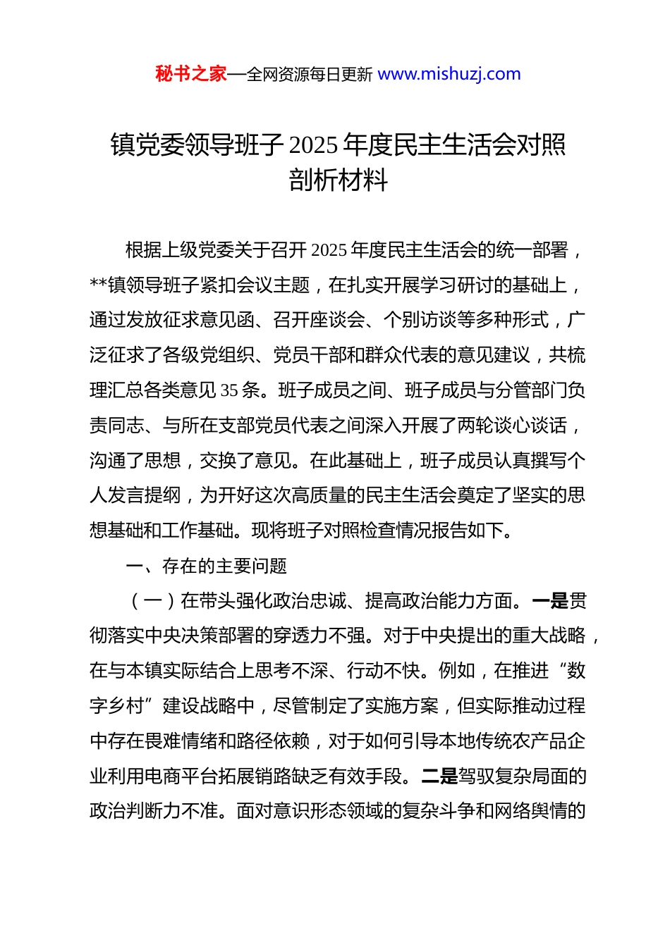 秘书之家—全网资源每日更新 www.mishuzj.com镇党委领导班子 2025 年度民主生活会对照剖析材料 根据上级党委关于召开 2025 年度民主生活会的统一部署,**镇领导班子紧扣会议主题,在扎实开展学习研讨的基础上,通过发放征求意见函、召开座谈会、个别访谈等多种形式,广泛征求了各级党组织、党员干部和群众代表的意见建议,共梳理汇总各类意见 35 条。班子成员之间、班子成员与分管部门负责同志、与所在支部党员代表之间深入开展了两轮谈心谈话,沟通了思想,交换了意见。在此基础上,班子成员认真撰写个人发言提纲,为开好这次高质量的民主生活会奠定了坚实的思想基础和工作基础。现将班子对照检查情况报告如下。一、存在的主要问题(一)在带头强化政治忠诚、提高政治能力方面。一是贯彻落实中央决策部署的穿透力不强。对于中央提出的重大战略,在与本镇实际结合上思考不深、行动不快。例如,在推进“数字乡村”建设战略中,尽管制定了实施方案,但实际推动过程中存在畏难情绪和路径依赖,对于如何引导本地传统农产品企业利用电商平台拓展销路缺乏有效手段。二是驾驭复杂局面的政治判断力不准。面对意识形态领域的复杂斗争和网络舆情的秘书之家—全网资源每日更新 www.mishuzj.com新挑战,部分班子成员的敏锐性和鉴别力不足。在 2025 年第三季度,我镇推进一项工业园区土地用途调整工作时,未能充分预判其可能引发的社会稳定风险,对少数村民因补偿预期不符而产生的负面情绪疏于引导,导致相关不实信息在网络平台发酵,镇政府虽然最终平息了事态,但前期处置的被动局面暴露了班子在重大决策社会风险评估上的政治洞察力缺失,收到了3 起正式的村民投诉。三是应对风险挑战的政治领悟力不透。面对经济下行压力和日益激烈的区域竞争,班子在抢抓机遇、化危为机上的战略定力不足。2025 年上半年,在申报一项自治区级现代农业产业示范园项目时,面对申报材料要求高、竞争对手实力强的局面,一度产生了“争不上、不如不争”的消极思想,导致项目准备工作启动缓慢,险些错失申报窗口期。这反映出班子在领悟“国之大者”、胸怀“两个大局”上站位不高,缺乏“不进则退、慢进亦退”的忧患意识和必胜信心。(二)在带头固本培元、增强党性方面。一是理论学习的系统性和转化率不好。虽然能够严格执行党委理论学习中心组学习制度,但学习方式较为单一,多以“领学通读”为主,深入研讨和思想碰撞不足。在 2025 年第四季度学习党的二十届四中全会精神专题研讨中,有 2 名班子成员的发言材料仅仅是原文摘抄和浅层理解,没有紧密联系分管工作和全镇发展实际,秘书之家—全网资源每日更新 www.mishuzj.com存在“学用脱节”现象,未能真正将党的创新理论转化为谋划工作的思路、促进发展的举措。二是理想信念的坚守和淬炼不实。在长期和平环境和相对复杂的社会思潮影响下,部分同志革命意志有所消退,艰苦奋斗的精神有所弱化。虽然口头上强调理想信念,但内心深处对实现共产主义远大理想的长期性、艰巨性认识不深,有时会私下里流露出“工作任务重、压力大、身心俱疲”的抱怨情绪,共产党人应有的那么一股子革命加拼命的强大精神支撑有所松动。三是道德品行的砥砺和约束不严。班子成员总体能够做到廉洁自律,但对照更高标准,仍存在律己不严、防微杜渐意识不强的问题。例如,个别领导干部在与企业家交往中,界限感把握不清晰,曾受邀参加某本地企业举办的“新产品发布品鉴会”,虽然名义上是公务活动,但活动规模和标准超出了正常范围,带有明显的宴请性质。这种行为虽然未构成严重违纪,但反映出在净化社交圈、生活圈上,抵制不良风气的思想防线构筑得不牢。(三)在带头敬畏人民、敬畏组织、敬畏法纪方面。一是深入践行群众路线的自觉性不高。落实“四下基层”制度存在形式主义倾向,下基层的次数虽然达标,但质量不优。据统计,2025 年下半年班子成员人均下乡调研 15 次,但其中超过 10 次是陪同上级或沿固定线路“走马观花”,真正带着问题、沉到秘书之家—全网资源每日更新 www.mishuzj.com一线的“解剖麻雀”式调研不多。**村 120 户村民反映的冬季供暖管网老化问题...