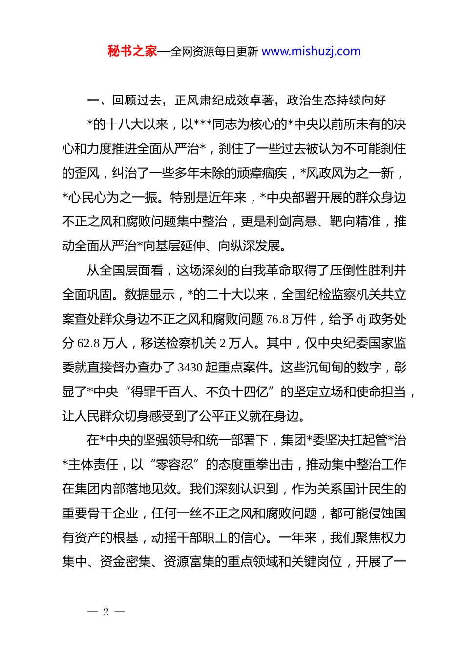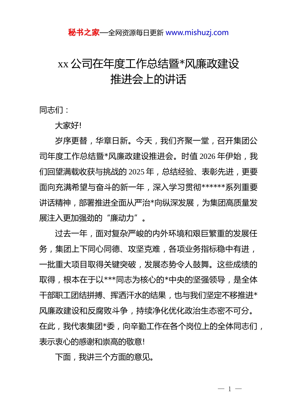 秘书之家—全网资源每日更新 www.mishuzj.comxx 公司在年度工作总结暨*风廉政建设推进会上的讲话同志们:大家好!岁序更替,华章日新。今天,我们齐聚一堂,召开集团公司年度工作总结暨*风廉政建设推进会。时值 2026 年伊始,我们回望满载收获与挑战的 2025 年,总结经验、表彰先进,更要面向充满希望与奋斗的新一年,深入学习贯彻******系列重要讲话精神,部署推进全面从严治*向纵深发展,为集团高质量发展注入更加强劲的“廉动力”。过去一年,面对复杂严峻的内外环境和艰巨繁重的发展任务,集团上下同心同德、攻坚克难,各项业务指标稳中有进,一批重大项目取得关键突破,发展态势令人鼓舞。这些成绩的取得,根本在于以***同志为核心的*中央的坚强领导,是全体干部职工团结拼搏、挥洒汗水的结果,也与我们坚定不移推进*风廉政建设和反腐败斗争,持续净化优化政治生态密不可分。在此,我代表集团*委,向辛勤工作在各个岗位上的全体同志们,表示衷心的感谢和崇高的敬意!下面,我讲三个方面的意见。— 1 —秘书之家—全网资源每日更新 www.mishuzj.com一、回顾过去,正风肃纪成效卓著,政治生态持续向好*的十八大以来,以***同志为核心的*中央以前所未有的决心和力度推进全面从严治*,刹住了一些过去被认为不可能刹住的歪风,纠治了一些多年未除的顽瘴痼疾,*风政风为之一新,*心民心为之一振。特别是近年来,*中央部署开展的群众身边不正之风和腐败问题集中整治,更是利剑高悬、靶向精准,推动全面从严治*向基层延伸、向纵深发展。从全国层面看,这场深刻的自我革命取得了压倒性胜利并全面巩固。数据显示,*的二十大以来,全国纪检监察机关共立案查处群众身边不正之风和腐败问题 76.8 万件,给予 dj 政务处分 62.8 万人,移送检察机关 2 万人。其中,仅中央纪委国家监委就直接督办查办了 3430 起重点案件。这些沉甸甸的数字,彰显了*中央“得罪千百人、不负十四亿”的坚定立场和使命担当,让人民群众切身感受到了公平正义就在身边。在*中央的坚强领导和统一部署下,集团*委坚决扛起管*治*主体责任,以“零容忍”的态度重拳出击,推动集中整治工作在集团内部落地见效。我们深刻认识到,作为关系国计民生的重要骨干企业,任何一丝不正之风和腐败问题,都可能侵蚀国有资产的根基,动摇干部职工的信心。一年来,我们聚焦权力集中、资金密集、资源富集的重点领域和关键岗位,开展了一— 2 —秘书之家—全网资源每日更新 www.mishuzj.com系列专项治理行动,取得了显著成效。一是保持高压态势,惩治腐败力度空前。我们坚持有案必查、有腐必惩,让胆敢伸手的“蠹虫”无处遁形。2025 年全年,集团纪委共收到问题线索举报 xx 件,经过严格初核,立案审查xx 人,给予 dj 政务处分 xx 人,其中涉及中层管理人员 xx 人,因涉嫌职务犯罪移送司法机关处理 xx 人。通过精准有力的执纪执法,我们累计挽回和避免经济损失超过 4500 万元。这些行动,不仅惩处了个人,更形成了强大震慑,教育了广大干部职工,释放出“越往后执纪越严”的强烈信号。二是聚焦突出问题,专项整治精准发力。我们紧盯工程建设、物资采购、招标投标、财务管理等腐败问题易发多发的“重灾区”,开展“地毯式”排查和“点穴式”整治。在 xx 重大能源基地建设项目中,我们收到关于项目招投标环节存在“猫腻”的举报后,立即成立联合调查组,深入核查,最终严肃查处了 xx 部门原负责人 xx 利用职务便利,在设备采购、工程分包等环节“明招暗定”,为特定关系人“量身定制”合同条款,非法收受财物共计 620 余万元的严重违纪违法问题。该案的查处,如同在平静的湖面投下了一颗巨石,在集团内部引发了强烈震动,我们以此为契机,全面复盘了近三年的所有重大招投标项目,修订完善了《集团公司招标采购管理办法》,— 3 —秘书之家—全网资源每日更新 www.mishuzj.com从制度上堵住了“权力寻租”的漏洞。三是着力解决群众急难愁盼,提升职工获得感。全面从严治*,最终要落脚于维护好、发展好、实现好广大人民群众的根本利益。对我们集团而言,就是要维护好广大干部职工的切身利益。过...