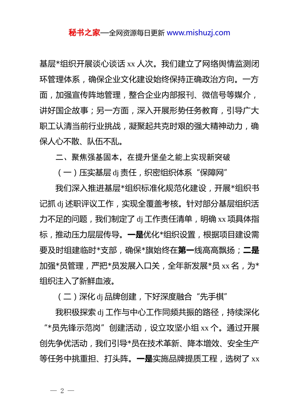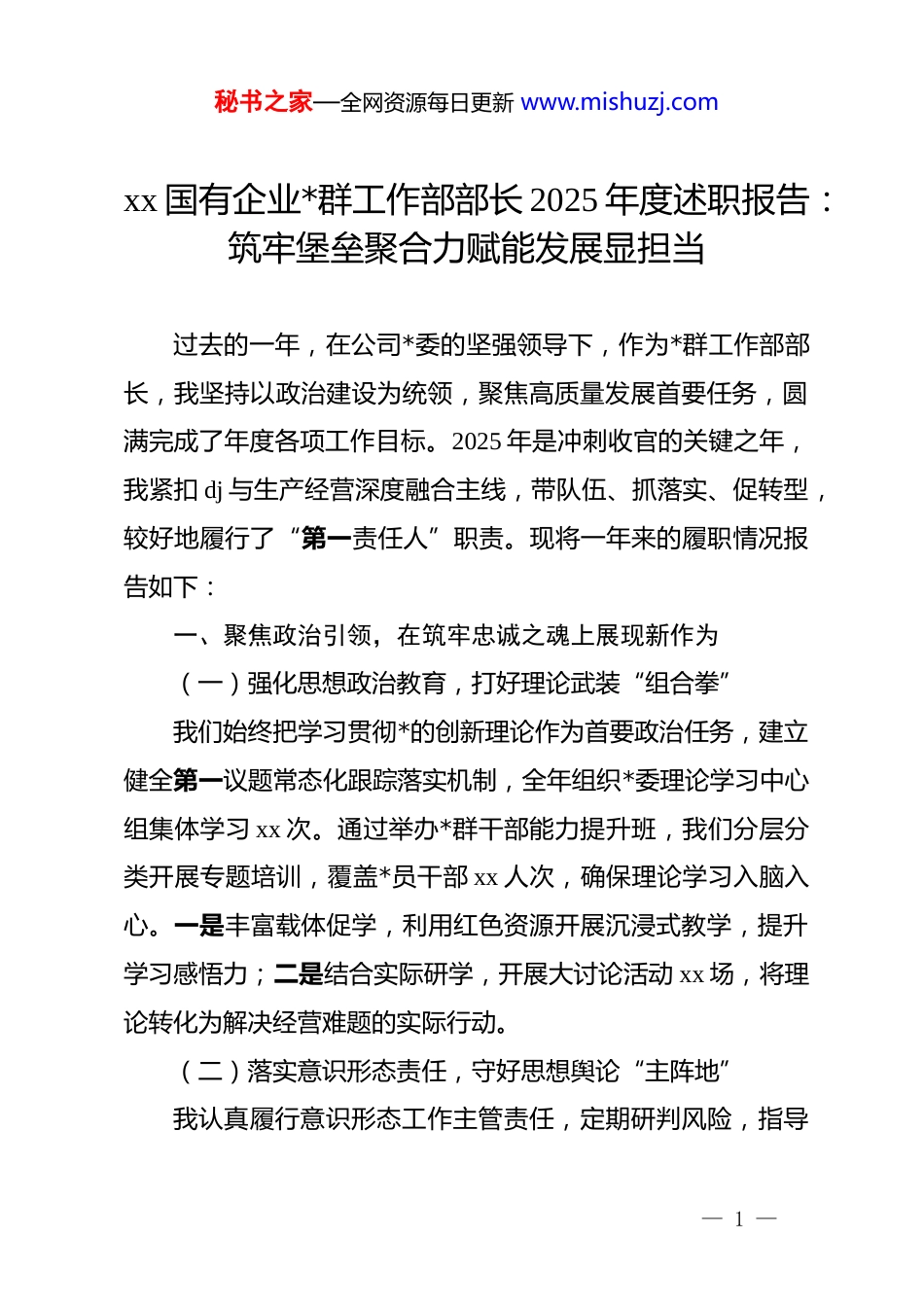 秘书之家—全网资源每日更新 www.mishuzj.comxx 国有企业*群工作部部长 2025 年度述职报告:筑牢堡垒聚合力赋能发展显担当过去的一年,在公司*委的坚强领导下,作为*群工作部部长,我坚持以政治建设为统领,聚焦高质量发展首要任务,圆满完成了年度各项工作目标。2025 年是冲刺收官的关键之年,我紧扣 dj 与生产经营深度融合主线,带队伍、抓落实、促转型,较好地履行了“第一责任人”职责。现将一年来的履职情况报告如下:一、聚焦政治引领,在筑牢忠诚之魂上展现新作为(一)强化思想政治教育,打好理论武装“组合拳”我们始终把学习贯彻*的创新理论作为首要政治任务,建立健全第一议题常态化跟踪落实机制,全年组织*委理论学习中心组集体学习 xx 次。通过举办*群干部能力提升班,我们分层分类开展专题培训,覆盖*员干部 xx 人次,确保理论学习入脑入心。一是丰富载体促学,利用红色资源开展沉浸式教学,提升学习感悟力;二是结合实际研学,开展大讨论活动 xx 场,将理论转化为解决经营难题的实际行动。(二)落实意识形态责任,守好思想舆论“主阵地”我认真履行意识形态工作主管责任,定期研判风险,指导— 1 —秘书之家—全网资源每日更新 www.mishuzj.com基层*组织开展谈心谈话 xx 人次。我们建立了网络舆情监测闭环管理体系,确保企业文化建设始终保持正确政治方向。一方面,加强宣传阵地管理,整合企业内部报刊、微信号等媒介,讲好国企故事;另一方面,深入开展形势任务教育,引导广大职工认清当前行业挑战,凝聚起共克时艰的强大精神动力,确保人心不散、队伍不乱。二、聚焦强基固本,在提升堡垒之能上实现新突破(一)压实基层 dj 责任,织密组织体系“保障网”我们深入推进基层*组织标准化规范化建设,开展*组织书记抓 dj 述职评议工作,实现全覆盖考核。针对部分基层组织活力不足的问题,我们制定了 dj 工作责任清单,明确 xx 项具体指标,推动压力层层传导。一是优化*组织设置,根据项目建设需要及时组建临时*支部,确保*旗始终在第一线高高飘扬;二是加强*员管理,严把*员发展入口关,全年新发展*员 xx 名,为*组织注入了新鲜血液。(二)深化 dj 品牌创建,下好深度融合“先手棋”我积极探索 dj 工作与中心工作同频共振的路径,持续深化“*员先锋示范岗”创建活动,设立攻坚小组 xx 个。通过开展创先争优活动,我们引导*员在技术革新、降本增效、安全生产等任务中挑重担、打头阵。一是实施品牌提质工程,选树了 xx— 2 —秘书之家—全网资源每日更新 www.mishuzj.com个具有行业影响力的优秀 dj 品牌,发挥典型引领作用;二是推动项目攻坚,*员带头攻克生产工艺瓶颈 xx 项,为公司节约成本约 xx 万元,实现了 dj 工作由虚转实的转变。三、聚焦人文关怀,在汇聚发展之势上取得新成效(一)提升群团工作质效,架起联系群众“连心桥”我们坚持以 dj 带工建、带团建,充分发挥桥梁纽带作用,成功举办了职工技能大赛、文化艺术节等大型活动。通过完善职工代表大会制度,我们确保涉及职工切身利益的重大事项均经过民主决策。一是关注职工成长,建立劳模创新工作室 xx 个,培养了一批技术能手和工匠人才;二是丰富文体生活,组织开展各类球赛、远足活动 xx 场,有效缓解了员工的工作压力,增强了企业的向心力和凝聚力。(二)精准开展暖心服务,绘就幸福企业“同心圆”我始终坚持民生导向,深入一线开展调研,协调解决职工最关心、最直接、最现实的利益问题。我们健全了困难职工常态化帮扶机制,全年发放各类慰问金 xx 万元。一是做实关爱举措,落实夏季送清凉、冬季送温暖等专项行动,惠及员工 xx 人次;二是改善办公环境,针对一线站点基础设施陈旧的问题,督促完成 xx 处配套设施升级改造,让广大职工切身感受到企业的关怀和温暖,进一步激发了大家的工作热情。— 3 —秘书之家—全网资源每日更新 www.mishuzj.com四、聚焦清正廉洁,在保持风清气正上取得新进展(一)狠抓*风廉政建设,筑牢拒腐防变“防火墙”我严格落实从严治*主体责任,协助*委制定*风廉政建设责任目标,并签订责任书。我们定期召开警...