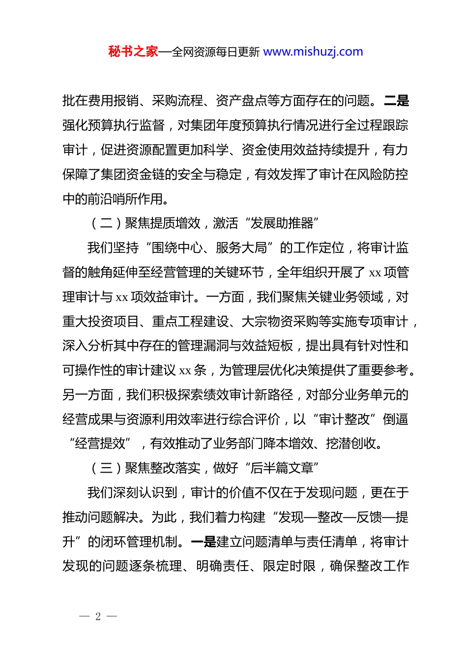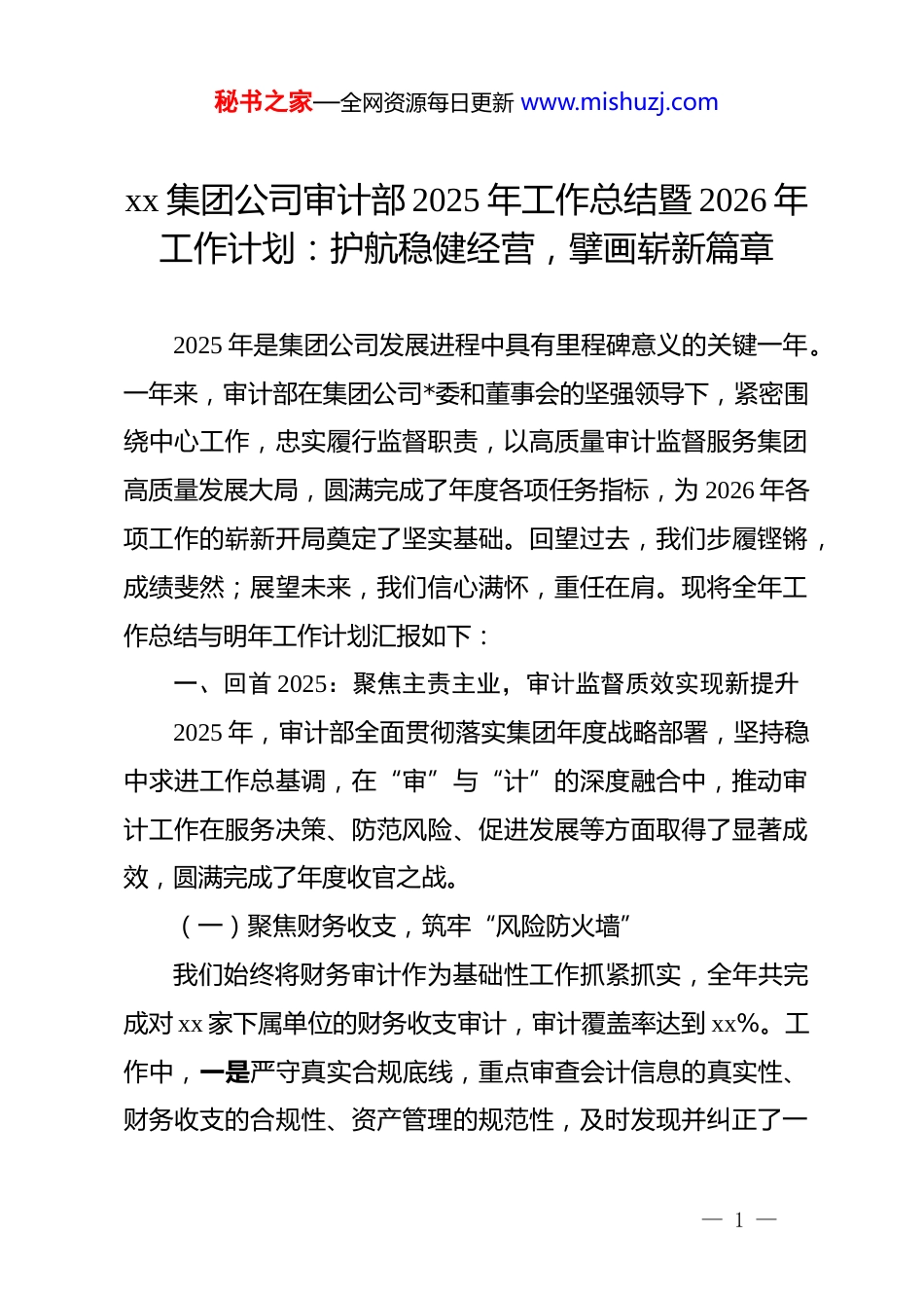 秘书之家—全网资源每日更新 www.mishuzj.comxx 集团公司审计部 2025 年工作总结暨 2026 年工作计划:护航稳健经营,擘画崭新篇章2025 年是集团公司发展进程中具有里程碑意义的关键一年。一年来,审计部在集团公司*委和董事会的坚强领导下,紧密围绕中心工作,忠实履行监督职责,以高质量审计监督服务集团高质量发展大局,圆满完成了年度各项任务指标,为 2026 年各项工作的崭新开局奠定了坚实基础。回望过去,我们步履铿锵,成绩斐然;展望未来,我们信心满怀,重任在肩。现将全年工作总结与明年工作计划汇报如下:一、回首 2025:聚焦主责主业,审计监督质效实现新提升2025 年,审计部全面贯彻落实集团年度战略部署,坚持稳中求进工作总基调,在“审”与“计”的深度融合中,推动审计工作在服务决策、防范风险、促进发展等方面取得了显著成效,圆满完成了年度收官之战。(一)聚焦财务收支,筑牢“风险防火墙”我们始终将财务审计作为基础性工作抓紧抓实,全年共完成对 xx 家下属单位的财务收支审计,审计覆盖率达到 xx%。工作中,一是严守真实合规底线,重点审查会计信息的真实性、财务收支的合规性、资产管理的规范性,及时发现并纠正了一— 1 —秘书之家—全网资源每日更新 www.mishuzj.com批在费用报销、采购流程、资产盘点等方面存在的问题。二是强化预算执行监督,对集团年度预算执行情况进行全过程跟踪审计,促进资源配置更加科学、资金使用效益持续提升,有力保障了集团资金链的安全与稳定,有效发挥了审计在风险防控中的前沿哨所作用。(二)聚焦提质增效,激活“发展助推器”我们坚持“围绕中心、服务大局”的工作定位,将审计监督的触角延伸至经营管理的关键环节,全年组织开展了 xx 项管理审计与 xx 项效益审计。一方面,我们聚焦关键业务领域,对重大投资项目、重点工程建设、大宗物资采购等实施专项审计,深入分析其中存在的管理漏洞与效益短板,提出具有针对性和可操作性的审计建议 xx 条,为管理层优化决策提供了重要参考。另一方面,我们积极探索绩效审计新路径,对部分业务单元的经营成果与资源利用效率进行综合评价,以“审计整改”倒逼“经营提效”,有效推动了业务部门降本增效、挖潜创收。(三)聚焦整改落实,做好“后半篇文章”我们深刻认识到,审计的价值不仅在于发现问题,更在于推动问题解决。为此,我们着力构建“发现—整改—反馈—提升”的闭环管理机制。一是建立问题清单与责任清单,将审计发现的问题逐条梳理、明确责任、限定时限,确保整改工作— 2 —秘书之家—全网资源每日更新 www.mishuzj.com“不悬空”“不打折”。二是强化跟踪督办力度,通过定期“回头看”、现场核查等方式,对整改情况进行动态监控与质效评估,全年推动 xx 项审计发现问题完成彻底整改,整改率达xx%。通过抓实审计整改“后半篇文章”,审计成果的权威性与威慑力得到显著增强。(四)聚焦队伍建设,锻造“审计铁军魂”我们深知,高素质的审计队伍是审计事业发展的根本保障一年来,我们始终将队伍建设摆在突出位置。首先,持续强化政治能力建设,通过组织集体学习、专题研讨等形式,引导全体审计人员不断提高政治判断力、政治领悟力、政治执行力,确保审计工作的正确方向。其次,大力提升专业素养,全年组织审计业务培训 xx 人次,鼓励员工考取 cpa、cia 等专业资格证书,并积极选派骨干参与外部交流,审计团队的专业化、复合型能力得到系统性提升,为打造一支“能查、能说、能写”的审计铁军注入了不竭动力。二、审视当下:正视短板弱项,精准剖析发展面临新挑战在肯定成绩的同时,我们也清醒地认识到,对标集团公司高质量发展的新要求和内外部环境的新变化,我们的工作仍存在一些亟待改进的短板与弱项,必须予以高度重视并切实加以解决。— 3 —秘书之家—全网资源每日更新 www.mishuzj.com(一)审计广度仍需拓展当前,审计监督的全覆盖广度仍有不足,审计工作主要集中于传统的财务收支领域和重点业务板块。对于一些新兴业务领域、边缘性业务环节以及新设立的分子公司,审计介入的及时性与系统性尚有欠缺,存在部分监督盲区,这为...