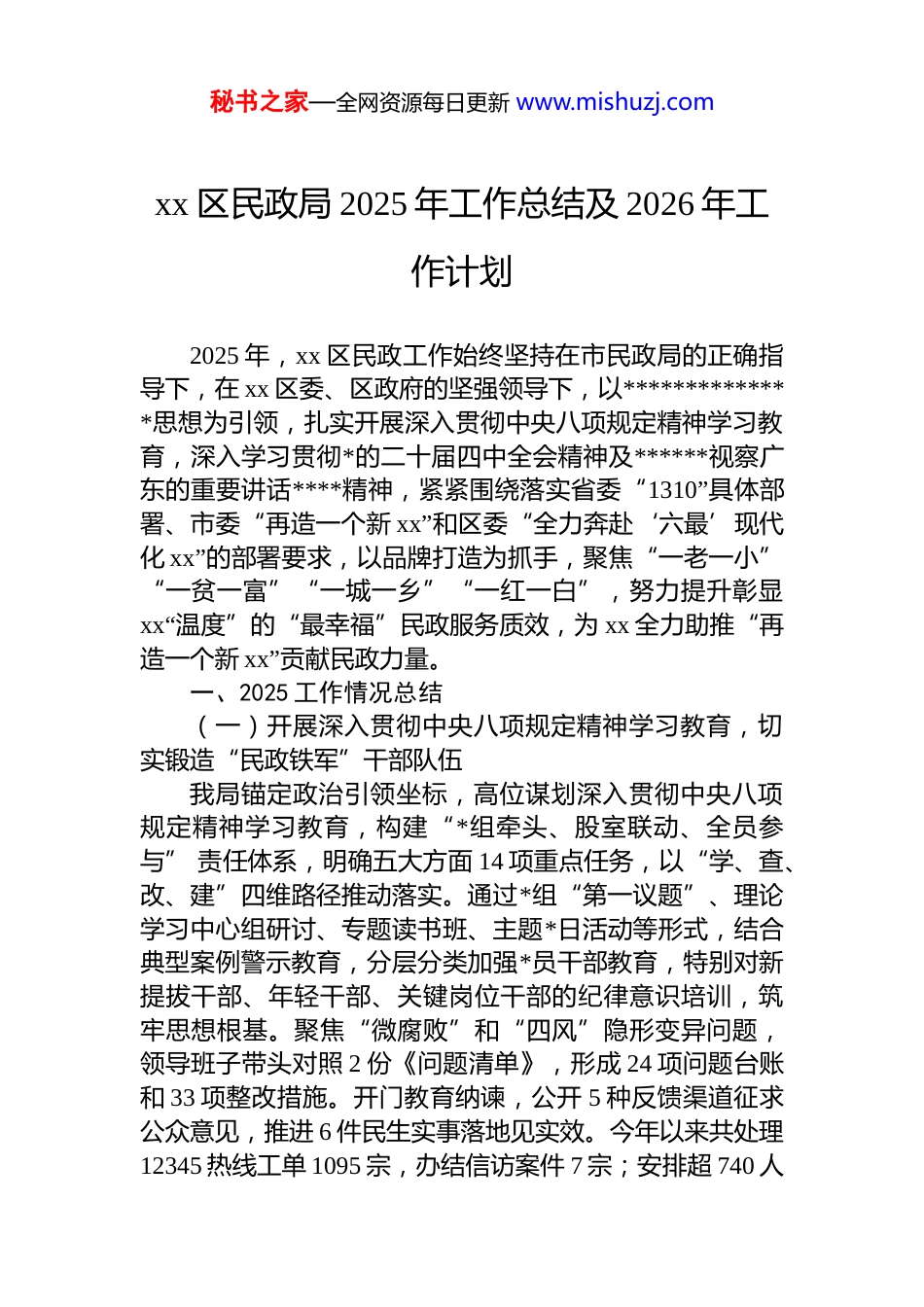 秘书之家—全网资源每日更新 www.mishuzj.comxx 区民政局 2025 年工作总结及 2026 年工作计划2025 年,xx 区民政工作始终坚持在市民政局的正确指导下,在 xx 区委、区政府的坚强领导下,以**************思想为引领,扎实开展深入贯彻中央八项规定精神学习教育,深入学习贯彻*的二十届四中全会精神及******视察广东的重要讲话****精神,紧紧围绕落实省委“1310”具体部署、市委“再造一个新 xx”和区委“全力奔赴‘六最’现代化 xx”的部署要求,以品牌打造为抓手,聚焦“一老一小”“一贫一富”“一城一乡”“一红一白”,努力提升彰显xx“温度”的“最幸福”民政服务质效,为 xx 全力助推“再造一个新 xx”贡献民政力量。一、2025 工作情况总结(一)开展深入贯彻中央八项规定精神学习教育,切实锻造“民政铁军”干部队伍我局锚定政治引领坐标,高位谋划深入贯彻中央八项规定精神学习教育,构建“*组牵头、股室联动、全员参与” 责任体系,明确五大方面 14 项重点任务,以“学、查、改、建”四维路径推动落实。通过*组“第一议题”、理论学习中心组研讨、专题读书班、主题*日活动等形式,结合典型案例警示教育,分层分类加强*员干部教育,特别对新提拔干部、年轻干部、关键岗位干部的纪律意识培训,筑牢思想根基。聚焦“微腐败”和“四风”隐形变异问题,领导班子带头对照 2 份《问题清单》,形成 24 项问题台账和 33 项整改措施。开门教育纳谏,公开 5 种反馈渠道征求公众意见,推进 6 件民生实事落地见实效。今年以来共处理12345 热线工单 1095 宗,办结信访案件 7 宗;安排超 740 人秘书之家—全网资源每日更新 www.mishuzj.com次*员干部深入“双联系”社区开展蚊媒防控等工作,落实“四个万家”。(二)聚焦“一老一小”,以“舒心”服务托起“朝夕美好”1.全面推进“禅颐居”养老服务品牌建设,增进老年人福祉我局“禅颐居”养老服务品牌被纳入“区十件民生实事”“全区改革重点项目”等五大核心任务统筹推进,取得了“五个全市第一”好成绩,即国家级示范性老年友好型社区数量(3 个)、省“五星级”养老机构数量(4 家)、每千名老人养老床位数(31 张)、民办养老机构占比(81%)、护理型床位占比(84%)均居全市第一,构建起养老事业与产业互促新格局。一是创新居家养老模式。建成家庭养老床位 105 张,完成居家适老化改造超 30 户,实现“床位搬进家、服务送上门”。二是完善社区服务网络。目前全区建有居家养老服务中心 6 个、长者饭堂(助餐点)20 个,实现镇街全覆盖打造“15 分钟养老圈”。三是推动机构多元发展。全区 21家养老机构(公办 4 家、民办 17 家)拥有养老床位 5357 张,护理型床位占比 84%超 2025 年目标值,16 家养老机构获评省“三星级”以上水平,同步推进平安、泰康两个高端养老项目建设与张槎、石湾敬老院升级改造。四是探索银发经济路径。建立禅港养老服务一体化机制,深化机构、社区、居家“三位一体”融合与大湾区“跨境养老”;目前共有 2 家养老机构纳入“广东院舍照顾服务计划”。五是筑牢安全底线。通过联合监管检查,实现养老机构安全隐患100%整改,规范行业发展。2.创新实施“禅伴成长”困境儿童关爱服务品牌,夯实福利保障基础一是筑牢基本生活保障底线。截至 12 月,全区在册散居孤儿、事实无人抚养儿童 54 名,累计发放基本生活保障秘书之家—全网资源每日更新 www.mishuzj.com金、助学金、价格临时补贴共约 xx 万元;依法办理收养登记 4 宗;落实病残孤儿收养保障政策,助力孤弃儿童回归家庭。二是深化“禅伴成长”服务品牌效能。结合新春、“六一”等节点,开展慰问及“微心愿”活动,惠及困境儿童、留守儿童 150 人次;组织全区儿童工作队伍培训,提升 153 名儿童督导员、儿童主任的政策掌握与心理服务实务能力,通过定期走访实现困境儿童信息动态更新。联合区慈善会、爱心企业举办“地名文脉・童心探索”“科技实践・筑梦未来” 等慈善研学活动,覆盖困境、留守及流动儿童 70 人次,丰富关爱服务内涵,拓宽儿童成长视野。(三)聚焦“一贫一富”,...