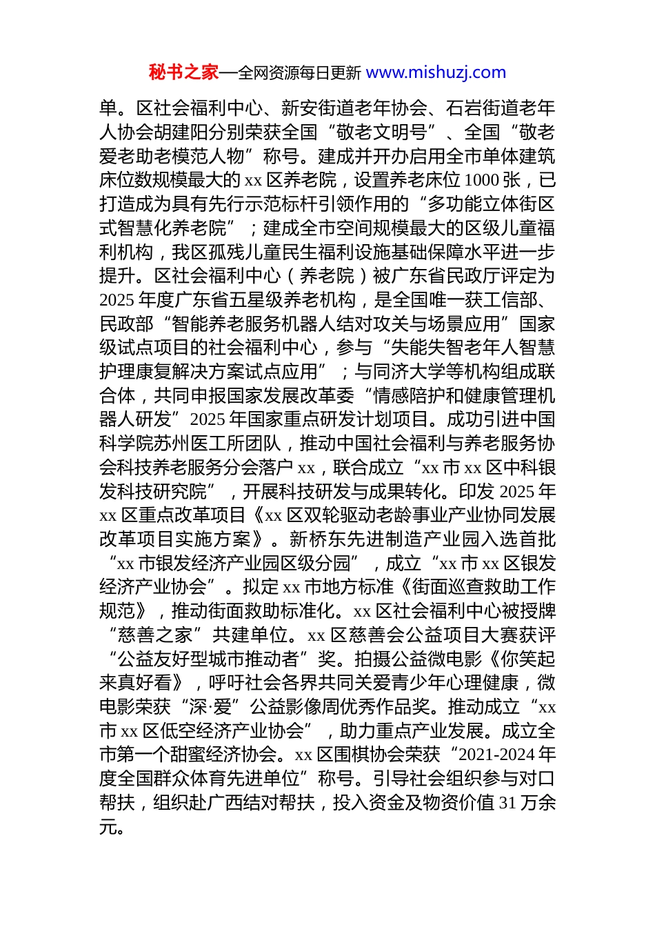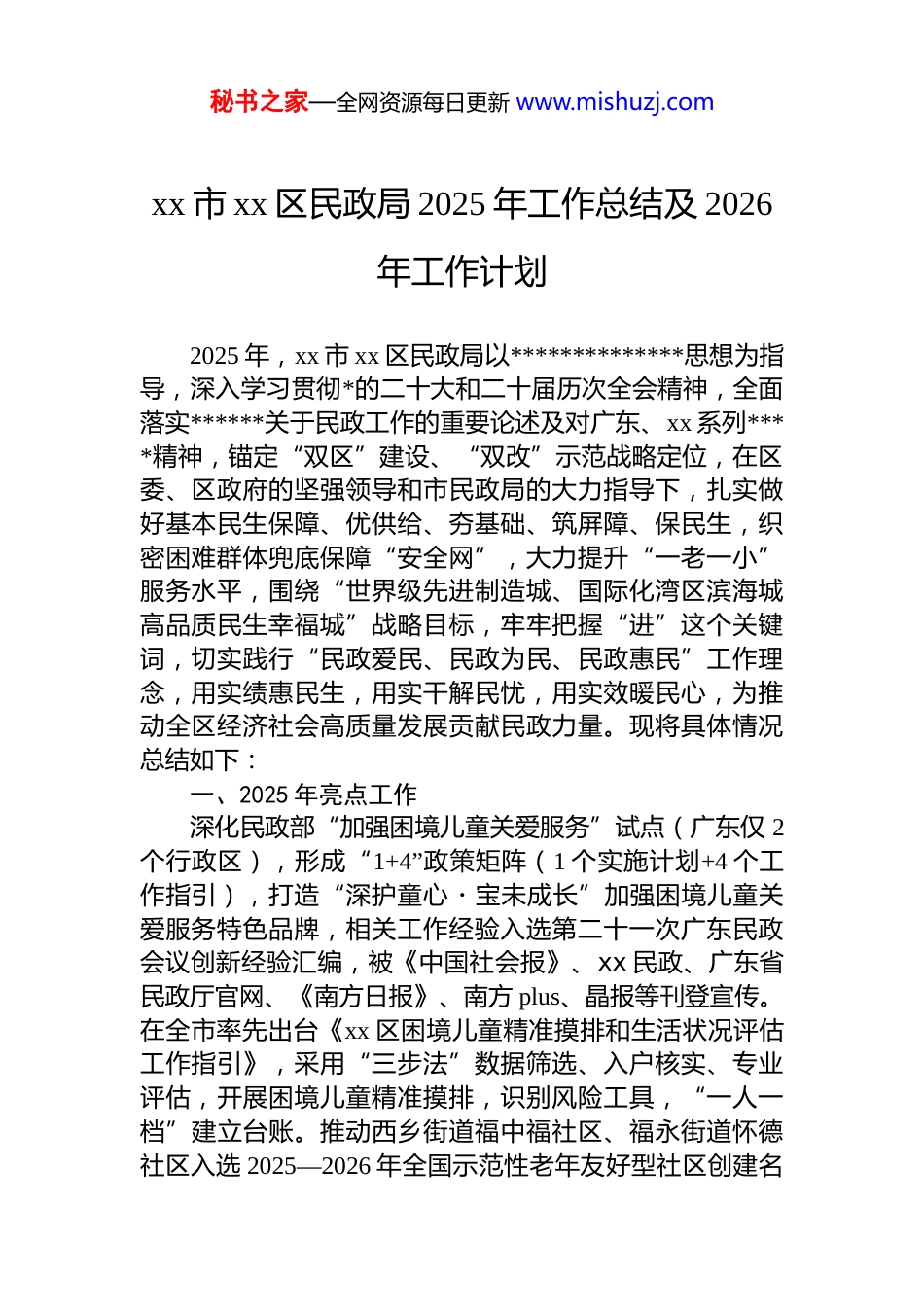 秘书之家—全网资源每日更新 www.mishuzj.comxx 市 xx 区民政局 2025 年工作总结及 2026年工作计划2025 年,xx 市 xx 区民政局以**************思想为指导,深入学习贯彻*的二十大和二十届历次全会精神,全面落实******关于民政工作的重要论述及对广东、xx 系列****精神,锚定“双区”建设、“双改”示范战略定位,在区委、区政府的坚强领导和市民政局的大力指导下,扎实做好基本民生保障、优供给、夯基础、筑屏障、保民生,织密困难群体兜底保障“安全网”,大力提升“一老一小”服务水平,围绕“世界级先进制造城、国际化湾区滨海城高品质民生幸福城”战略目标,牢牢把握“进”这个关键词,切实践行“民政爱民、民政为民、民政惠民”工作理念,用实绩惠民生,用实干解民忧,用实效暖民心,为推动全区经济社会高质量发展贡献民政力量。现将具体情况总结如下:一、2025 年亮点工作深化民政部“加强困境儿童关爱服务”试点(广东仅 2个行政区),形成“1+4”政策矩阵(1 个实施计划+4 个工作指引),打造“深护童心・宝未成长”加强困境儿童关爱服务特色品牌,相关工作经验入选第二十一次广东民政会议创新经验汇编,被《中国社会报》、xx 民政、广东省民政厅官网、《南方日报》、南方 plus、晶报等刊登宣传。在全市率先出台《xx 区困境儿童精准摸排和生活状况评估工作指引》,采用“三步法”数据筛选、入户核实、专业评估,开展困境儿童精准摸排,识别风险工具,“一人一档”建立台账。推动西乡街道福中福社区、福永街道怀德社区入选 2025—2026 年全国示范性老年友好型社区创建名秘书之家—全网资源每日更新 www.mishuzj.com单。区社会福利中心、新安街道老年协会、石岩街道老年人协会胡建阳分别荣获全国“敬老文明号”、全国“敬老爱老助老模范人物”称号。建成并开办启用全市单体建筑床位数规模最大的 xx 区养老院,设置养老床位 1000 张,已打造成为具有先行示范标杆引领作用的“多功能立体街区式智慧化养老院”;建成全市空间规模最大的区级儿童福利机构,我区孤残儿童民生福利设施基础保障水平进一步提升。区社会福利中心(养老院)被广东省民政厅评定为2025 年度广东省五星级养老机构,是全国唯一获工信部、民政部“智能养老服务机器人结对攻关与场景应用”国家级试点项目的社会福利中心,参与“失能失智老年人智慧护理康复解决方案试点应用”;与同济大学等机构组成联合体,共同申报国家发展改革委“情感陪护和健康管理机器人研发”2025 年国家重点研发计划项目。成功引进中国科学院苏州医工所团队,推动中国社会福利与养老服务协会科技养老服务分会落户 xx,联合成立“xx 市 xx 区中科银发科技研究院”,开展科技研发与成果转化。印发 2025 年xx 区重点改革项目《xx 区双轮驱动老龄事业产业协同发展改革项目实施方案》。新桥东先进制造产业园入选首批“xx 市银发经济产业园区级分园”,成立“xx 市 xx 区银发经济产业协会”。拟定 xx 市地方标准《街面巡查救助工作规范》,推动街面救助标准化。xx 区社会福利中心被授牌“慈善之家”共建单位。xx 区慈善会公益项目大赛获评“公益友好型城市推动者”奖。拍摄公益微电影《你笑起来真好看》,呼吁社会各界共同关爱青少年心理健康,微电影荣获“深·爱”公益影像周优秀作品奖。推动成立“xx市 xx 区低空经济产业协会”,助力重点产业发展。成立全市第一个甜蜜经济协会。xx 区围棋协会荣获“2021-2024 年度全国群众体育先进单位”称号。引导社会组织参与对口帮扶,组织赴广西结对帮扶,投入资金及物资价值 31 万余元。秘书之家—全网资源每日更新 www.mishuzj.com在 xx 市基层儿童工作队伍培训班“技能比拼考核”中,xx 区代表队荣获第三名的成绩,1 名儿童工作者获得个人新锐卓立奖。区社会福利中心李怀刚荣获“第二届全国老年人能力评估师职业技能竞赛”铜奖,连续两届赛事中摘取竞赛优秀组织单位和个人荣誉。区社会福利中心钟永萍劳模工匠创新工作室,成功获评 2025 年 xx 市重点支持的劳模工匠创新工作室。区社会福利中心与中国工艺美术大师、大国工匠、第 109...