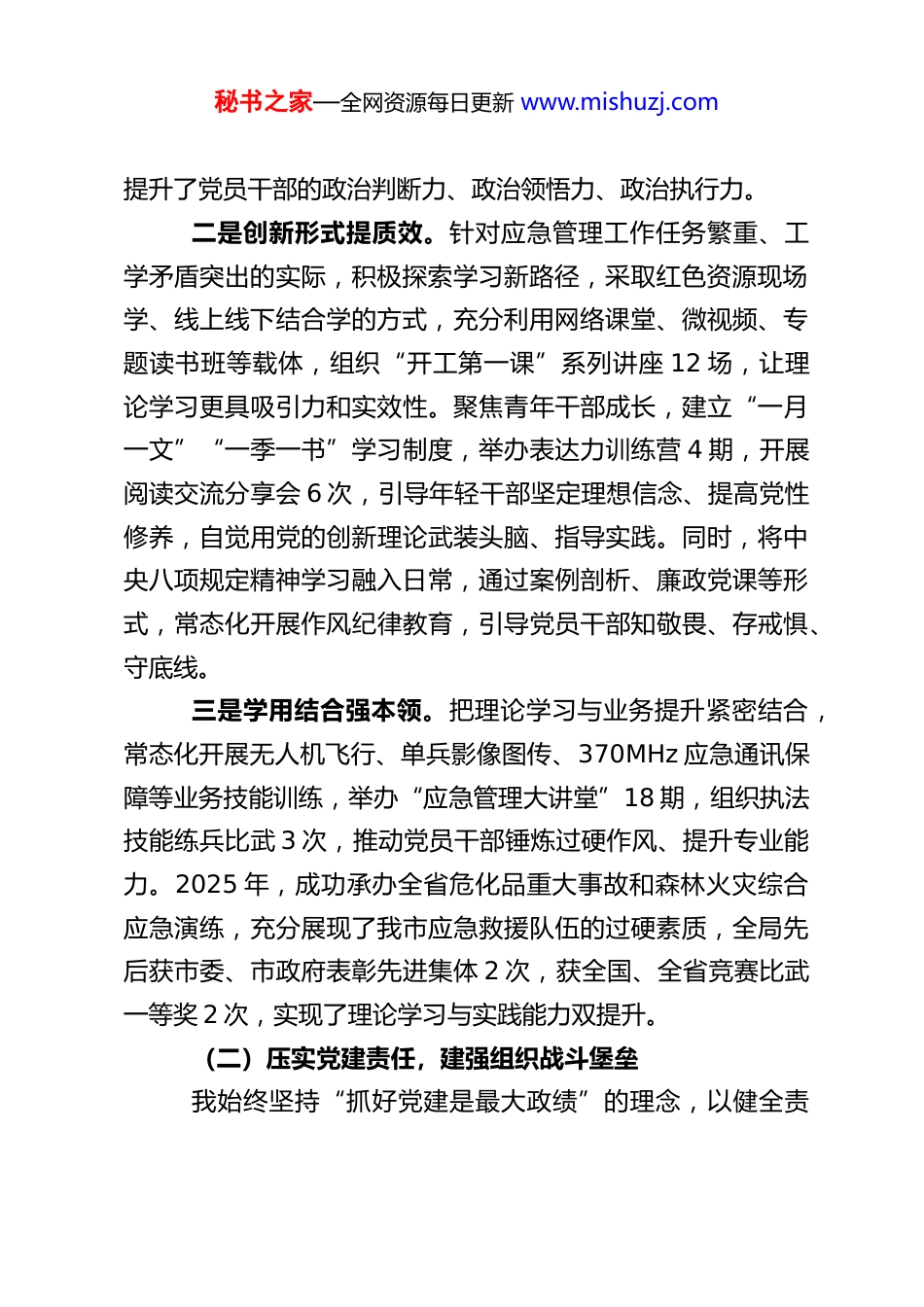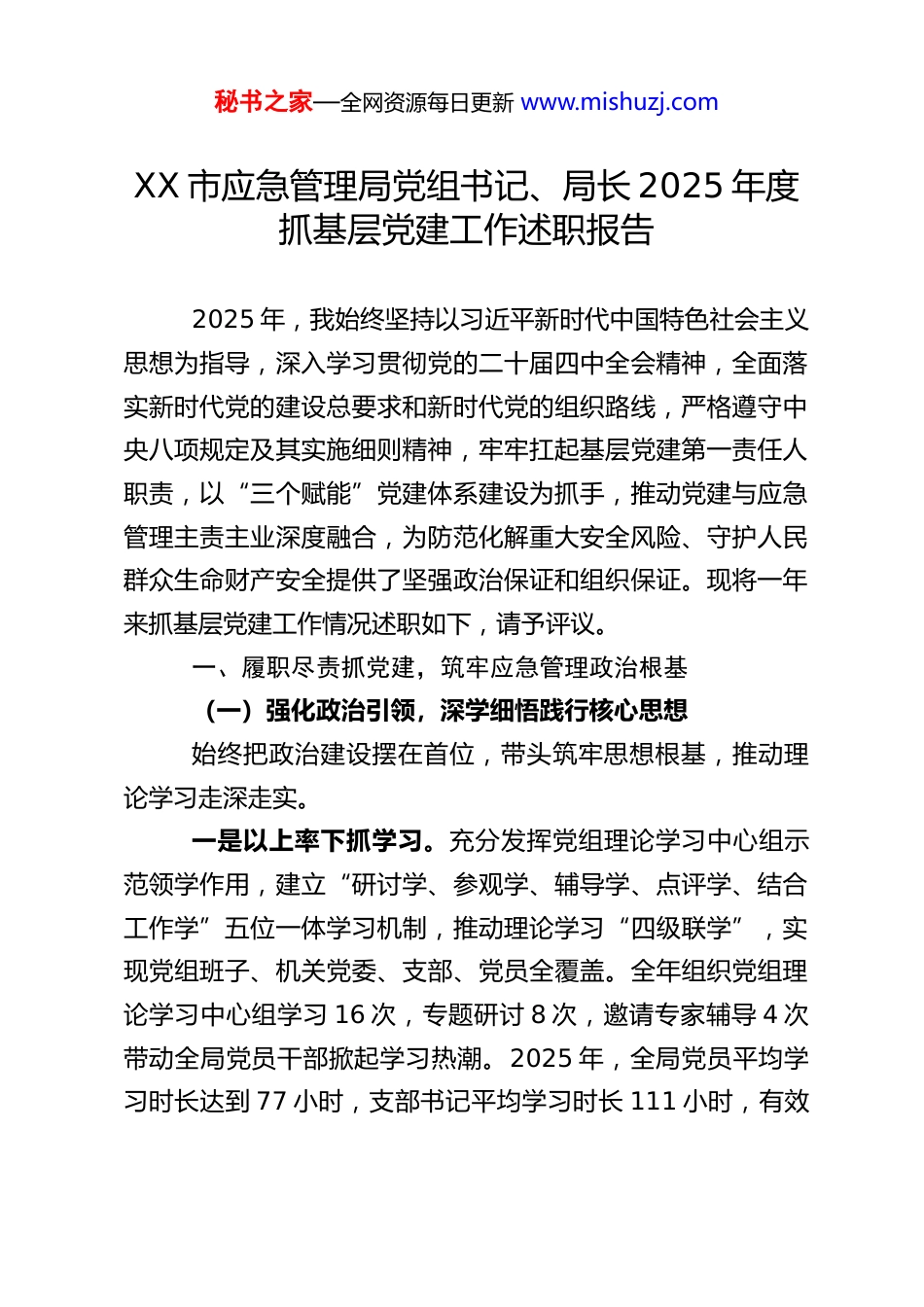 秘书之家—全网资源每日更新 www.mishuzj.comXX 市应急管理局党组书记、局长 2025 年度抓基层党建工作述职报告2025 年,我始终坚持以习近平新时代中国特色社会主义思想为指导,深入学习贯彻党的二十届四中全会精神,全面落实新时代党的建设总要求和新时代党的组织路线,严格遵守中央八项规定及其实施细则精神,牢牢扛起基层党建第一责任人职责,以“三个赋能”党建体系建设为抓手,推动党建与应急管理主责主业深度融合,为防范化解重大安全风险、守护人民群众生命财产安全提供了坚强政治保证和组织保证。现将一年来抓基层党建工作情况述职如下,请予评议。一、履职尽责抓党建,筑牢应急管理政治根基(一)强化政治引领,深学细悟践行核心思想始终把政治建设摆在首位,带头筑牢思想根基,推动理论学习走深走实。一是以上率下抓学习。充分发挥党组理论学习中心组示范领学作用,建立“研讨学、参观学、辅导学、点评学、结合工作学”五位一体学习机制,推动理论学习“四级联学”,实现党组班子、机关党委、支部、党员全覆盖。全年组织党组理论学习中心组学习 16 次,专题研讨 8 次,邀请专家辅导 4 次带动全局党员干部掀起学习热潮。2025 年,全局党员平均学习时长达到 77 小时,支部书记平均学习时长 111 小时,有效秘书之家—全网资源每日更新 www.mishuzj.com提升了党员干部的政治判断力、政治领悟力、政治执行力。二是创新形式提质效。针对应急管理工作任务繁重、工学矛盾突出的实际,积极探索学习新路径,采取红色资源现场学、线上线下结合学的方式,充分利用网络课堂、微视频、专题读书班等载体,组织“开工第一课”系列讲座 12 场,让理论学习更具吸引力和实效性。聚焦青年干部成长,建立“一月一文”“一季一书”学习制度,举办表达力训练营 4 期,开展阅读交流分享会 6 次,引导年轻干部坚定理想信念、提高党性修养,自觉用党的创新理论武装头脑、指导实践。同时,将中央八项规定精神学习融入日常,通过案例剖析、廉政党课等形式,常态化开展作风纪律教育,引导党员干部知敬畏、存戒惧、守底线。三是学用结合强本领。把理论学习与业务提升紧密结合,常态化开展无人机飞行、单兵影像图传、370MHz 应急通讯保障等业务技能训练,举办“应急管理大讲堂”18 期,组织执法技能练兵比武 3 次,推动党员干部锤炼过硬作风、提升专业能力。2025 年,成功承办全省危化品重大事故和森林火灾综合应急演练,充分展现了我市应急救援队伍的过硬素质,全局先后获市委、市政府表彰先进集体 2 次,获全国、全省竞赛比武一等奖 2 次,实现了理论学习与实践能力双提升。(二)压实党建责任,建强组织战斗堡垒我始终坚持“抓好党建是最大政绩”的理念,以健全责秘书之家—全网资源每日更新 www.mishuzj.com任体系、强化组织建设为抓手,推动基层党建工作全面进步、全面过硬。一是构建全员参与格局。树立党建工作“一盘棋”思想,完善职责清晰、衔接紧密的机关党建责任链条,设立机关党委、纪委、工会、青工委、女工委等组织机构,打造“1+5+N”工作格局,实现党建工作全员发力、人人参与。全年评选表扬局机关党建、业务工作突出团队 12 个、优秀个人 35 名,发放奖励资金 1.77 万元,有效激发了党员干部干事创业的积极性。二是健全责任落实机制。全面落实机关党建主体责任,完善全面从严治党“三张清单”“三级五岗”责任机制,制定月度工作计划,细化分解 111 项具体任务,明确责任主体、时间节点和工作要求。强化党建督查考核,实施月度提醒提示、季度评选争创、半年述职评议、年终综合考核的全流程管理,做到责任清晰、层层落实。编发《XX 应急党建》12 期,及时交流支部党建经验做法,促进全局党建工作质量整体提升,确保党的二十届四中全会关于“健全党的组织体系”的要求落到实处。三是深化支部规范化建设。以创建红旗支部为抓手,引领应急管理事业高质量发展,依托“三提三争”“一支部一实事”活动,推动支部建设与干事创业、提效争先深度融合。组织开展联学共建、“优流程优服务”“打擂比拼”“双报到”等活动 30 余次,有效提升了支部凝聚...