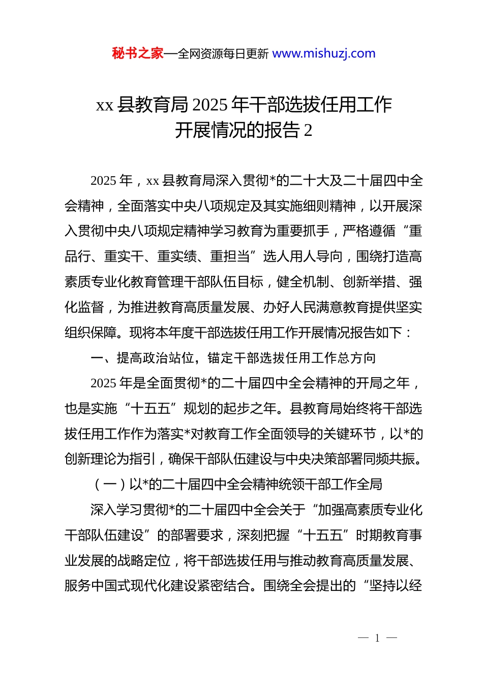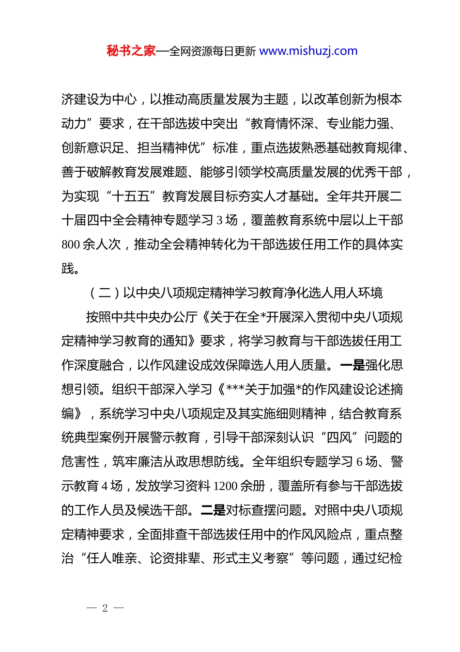 秘书之家—全网资源每日更新 www.mishuzj.comxx 县教育局 2025 年干部选拔任用工作开展情况的报告 22025 年,xx 县教育局深入贯彻*的二十大及二十届四中全会精神,全面落实中央八项规定及其实施细则精神,以开展深入贯彻中央八项规定精神学习教育为重要抓手,严格遵循“重品行、重实干、重实绩、重担当”选人用人导向,围绕打造高素质专业化教育管理干部队伍目标,健全机制、创新举措、强化监督,为推进教育高质量发展、办好人民满意教育提供坚实组织保障。现将本年度干部选拔任用工作开展情况报告如下:一、提高政治站位,锚定干部选拔任用工作总方向2025 年是全面贯彻*的二十届四中全会精神的开局之年,也是实施“十五五”规划的起步之年。县教育局始终将干部选拔任用工作作为落实*对教育工作全面领导的关键环节,以*的创新理论为指引,确保干部队伍建设与中央决策部署同频共振。(一)以*的二十届四中全会精神统领干部工作全局深入学习贯彻*的二十届四中全会关于“加强高素质专业化干部队伍建设”的部署要求,深刻把握“十五五”时期教育事业发展的战略定位,将干部选拔任用与推动教育高质量发展、服务中国式现代化建设紧密结合。围绕全会提出的“坚持以经— 1 —秘书之家—全网资源每日更新 www.mishuzj.com济建设为中心,以推动高质量发展为主题,以改革创新为根本动力”要求,在干部选拔中突出“教育情怀深、专业能力强、创新意识足、担当精神优”标准,重点选拔熟悉基础教育规律、善于破解教育发展难题、能够引领学校高质量发展的优秀干部,为实现“十五五”教育发展目标夯实人才基础。全年共开展二十届四中全会精神专题学习 3 场,覆盖教育系统中层以上干部800 余人次,推动全会精神转化为干部选拔任用工作的具体实践。(二)以中央八项规定精神学习教育净化选人用人环境按照中共中央办公厅《关于在全*开展深入贯彻中央八项规定精神学习教育的通知》要求,将学习教育与干部选拔任用工作深度融合,以作风建设成效保障选人用人质量。一是强化思想引领。组织干部深入学习《***关于加强*的作风建设论述摘编》,系统学习中央八项规定及其实施细则精神,结合教育系统典型案例开展警示教育,引导干部深刻认识“四风”问题的危害性,筑牢廉洁从政思想防线。全年组织专题学习 6 场、警示教育 4 场,发放学习资料 1200 余册,覆盖所有参与干部选拔的工作人员及候选干部。二是对标查摆问题。对照中央八项规定精神要求,全面排查干部选拔任用中的作风风险点,重点整治“任人唯亲、论资排辈、形式主义考察”等问题,通过纪检— 2 —秘书之家—全网资源每日更新 www.mishuzj.com监察、信访反映、群众评议等渠道收集意见建议 23 条,立行立改问题 18 个。三是健全长效机制。将中央八项规定精神融入干部选拔任用全流程,修订《xx 县教育干部管理暂行办法》,新增“作风建设专项考察”条款,明确在民主推荐、组织考察、任前公示等环节中,将作风表现作为重要评价指标,推动作风建设常态化长效化。二、健全制度体系,规范干部选拔任用全流程县教育局坚持“制度先行、规范运作”,以完善的体制机制确保干部选拔任用工作公平、公正、公开,切实提升选人用人公信力。(一)优化选拔任用规程,严把“五道关口”严格执行《xx 县教育干部管理暂行办法》,进一步细化选拔任用流程,确保每个环节有章可循、有据可查。一是严把资格审核关。制定清晰的干部选拔资格标准,对候选人的政治立场、学历学位、工作年限、专业资质等进行严格审查,坚决杜绝不符合条件人员进入选拔范围。2025 年共审核候选人资格320 人次,取消不符合条件人员资格 12 人。二是严把民主推荐关。采取“会议推荐+谈话推荐”相结合的方式,广泛征求学校教职工、学生家长、社会代表意见,确保推荐结果真实反映民意。全年开展民主推荐会 46 场,参与推荐人数达 3800 余人— 3 —秘书之家—全网资源每日更新 www.mishuzj.com次。三是严把组织考察关。组建由局领导、纪检干部、业务骨干组成的考察组,通过实地调研、个别谈话、查阅资料等方式,全面考察候选人的德、能、勤、绩、廉表现,形成详...