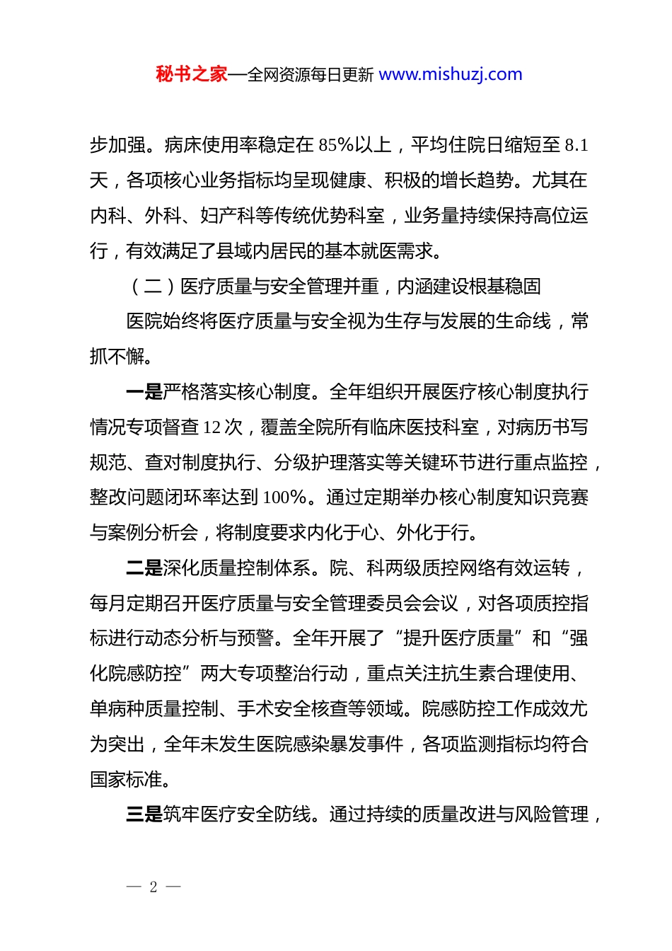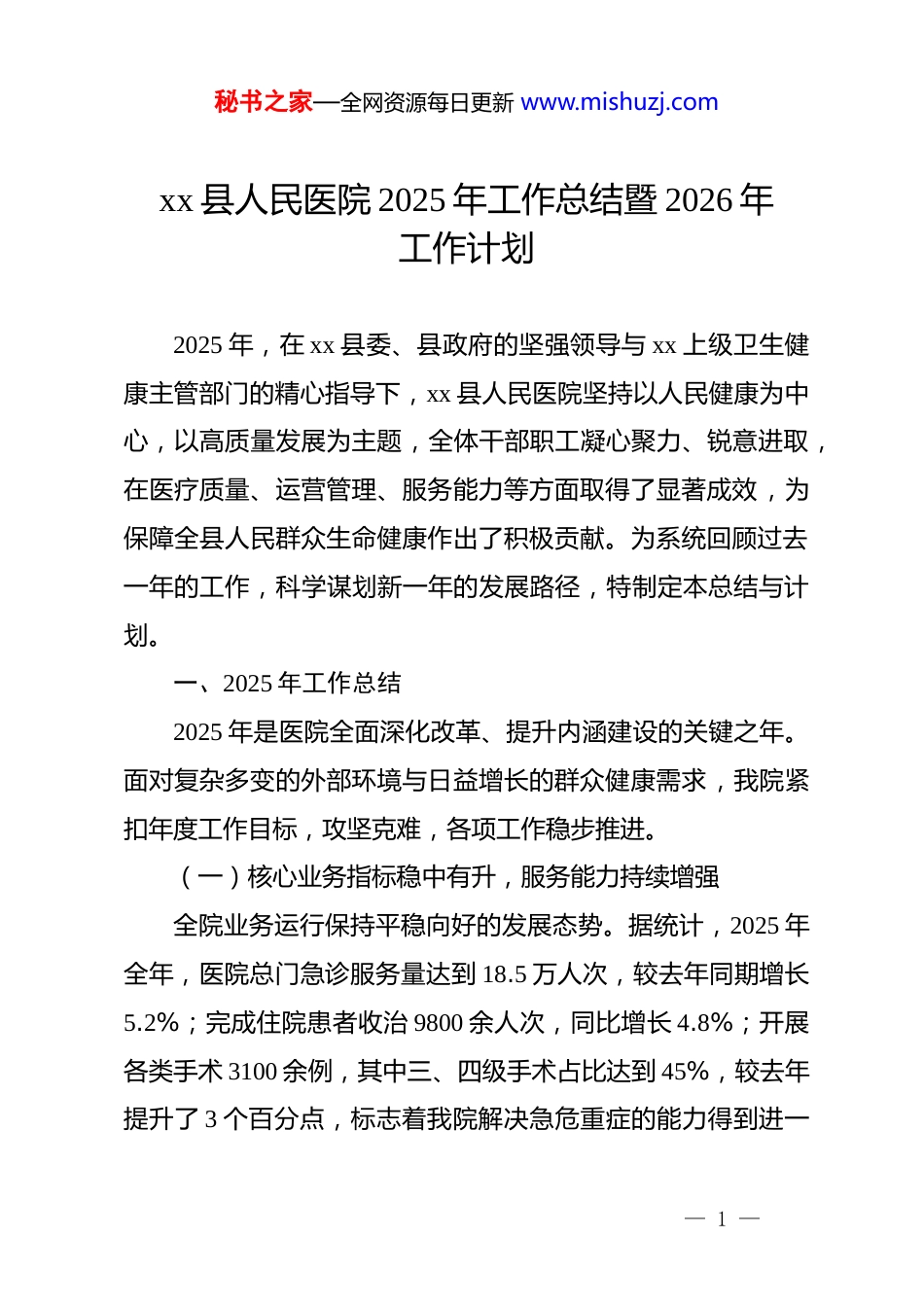 秘书之家—全网资源每日更新 www.mishuzj.comxx 县人民医院 2025 年工作总结暨 2026 年工作计划2025 年,在 xx 县委、县政府的坚强领导与 xx 上级卫生健康主管部门的精心指导下,xx 县人民医院坚持以人民健康为中心,以高质量发展为主题,全体干部职工凝心聚力、锐意进取,在医疗质量、运营管理、服务能力等方面取得了显著成效,为保障全县人民群众生命健康作出了积极贡献。为系统回顾过去一年的工作,科学谋划新一年的发展路径,特制定本总结与计划。一、2025 年工作总结2025 年是医院全面深化改革、提升内涵建设的关键之年。面对复杂多变的外部环境与日益增长的群众健康需求,我院紧扣年度工作目标,攻坚克难,各项工作稳步推进。(一)核心业务指标稳中有升,服务能力持续增强全院业务运行保持平稳向好的发展态势。据统计,2025 年全年,医院总门急诊服务量达到 18.5 万人次,较去年同期增长5.2%;完成住院患者收治 9800 余人次,同比增长 4.8%;开展各类手术 3100 余例,其中三、四级手术占比达到 45%,较去年提升了 3 个百分点,标志着我院解决急危重症的能力得到进一— 1 —秘书之家—全网资源每日更新 www.mishuzj.com步加强。病床使用率稳定在 85%以上,平均住院日缩短至 8.1天,各项核心业务指标均呈现健康、积极的增长趋势。尤其在内科、外科、妇产科等传统优势科室,业务量持续保持高位运行,有效满足了县域内居民的基本就医需求。(二)医疗质量与安全管理并重,内涵建设根基稳固医院始终将医疗质量与安全视为生存与发展的生命线,常抓不懈。一是严格落实核心制度。全年组织开展医疗核心制度执行情况专项督查 12 次,覆盖全院所有临床医技科室,对病历书写规范、查对制度执行、分级护理落实等关键环节进行重点监控,整改问题闭环率达到 100%。通过定期举办核心制度知识竞赛与案例分析会,将制度要求内化于心、外化于行。二是深化质量控制体系。院、科两级质控网络有效运转,每月定期召开医疗质量与安全管理委员会会议,对各项质控指标进行动态分析与预警。全年开展了“提升医疗质量”和“强化院感防控”两大专项整治行动,重点关注抗生素合理使用、单病种质量控制、手术安全核查等领域。院感防控工作成效尤为突出,全年未发生医院感染暴发事件,各项监测指标均符合国家标准。三是筑牢医疗安全防线。通过持续的质量改进与风险管理,— 2 —秘书之家—全网资源每日更新 www.mishuzj.com全年未发生经鉴定为二级及以上的医疗事故,重大医疗纠纷发生率为零。患者满意度调查显示,门诊患者满意度达 95.3%,住院患者满意度达 96.8%,群众就医获得感与安全感显著提升。(三)运营管理精细化转型,医保基金使用规范高效面对医保支付方式改革带来的新挑战,医院主动适应,向精细化管理要效益。一是强化财务内控与成本管控。财务科对年度预算执行情况进行全过程跟踪与分析,严格控制非业务性支出。2025 年,医院实现业务总收入 1.5 亿元,业务支出 1.4 亿元,收支结构趋于合理。通过推行科室成本核算,各科室成本意识普遍增强,医疗设备、办公资源利用效率得到提升。二是规范医保管理行为。医院严格执行医保政策与诊疗规范,坚决杜绝过度检查、无指征用药、分解住院等违规行为。依据病种分值(dip)付费管理要求,组织全院医师进行系统培训,强化临床路径管理,引导医生在保障医疗质量的前提下,主动控制医疗成本。2025 年,我院医保次均住院费用较全市同级医院平均水平低 5%,药占比控制在 26%以内,耗材占比控制在 19%以内,有效保障了医保基金的安全、合规、高效使用。(四)dj 引领作用充分彰显,队伍凝聚力显著增强医院*委始终坚持以 dj 引领业务发展,将*组织的政治优势、— 3 —秘书之家—全网资源每日更新 www.mishuzj.com组织优势转化为推动医院发展的强大动力。通过深入学习中央、xx 自治区*委、xx 市委及 xx 县委经济工作会议精神,全院干部职工的思想认识和政治站位得到进一步统一。创新开展“dj 查房”模式,由*员专家带领团队深入临床一线,不仅解决业务难题,更将*组织的关怀送到患者床边。通过设立“*...