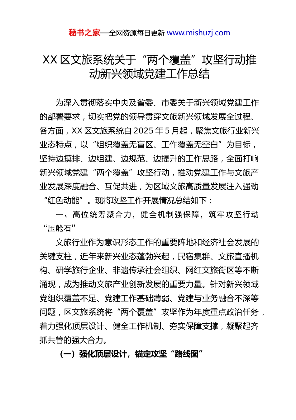 秘书之家—全网资源每日更新 www.mishuzj.comXX 区文旅系统关于“两个覆盖”攻坚行动推动新兴领域党建工作总结为深入贯彻落实中央及省委、市委关于新兴领域党建工作的部署要求,切实把党的领导贯穿文旅新兴领域发展全过程、各方面,XX 区文旅系统自 2025 年 5 月起,聚焦文旅行业新兴业态特点,以“组织覆盖无盲区、工作覆盖无空白”为目标,坚持边摸排、边组建、边规范、边提升的工作思路,全面打响新兴领域党建“两个覆盖”攻坚行动,推动党建工作与文旅产业发展深度融合、互促共进,为区域文旅高质量发展注入强劲“红色动能”。现将攻坚工作开展情况总结如下:一、高位统筹聚合力,健全机制强保障,筑牢攻坚行动“压舱石”文旅行业作为意识形态工作的重要阵地和经济社会发展的关键支柱,近年来新兴业态蓬勃兴起,民宿集群、文旅直播机构、研学旅行企业、非遗传承社会组织、网红文旅街区等不断涌现,成为推动文旅产业创新发展的重要力量。针对新兴领域党组织覆盖不足、党建工作基础薄弱、党建与业务融合不深等问题,区文旅系统将“两个覆盖”攻坚作为年度重点政治任务,着力强化顶层设计、健全工作机制、夯实保障支撑,凝聚起齐抓共管的强大合力。(一)强化顶层设计,锚定攻坚“路线图”秘书之家—全网资源每日更新 www.mishuzj.com区文旅局党组始终把新兴领域党建工作摆在突出位置,坚持“书记抓、抓书记”,成立由局党组书记任组长,分管副局长任副组长,局机关各科室、下属单位及各街道文旅办负责人为成员的新兴领域党建“两个覆盖”攻坚工作领导小组,定期召开党组会议专题研究部署,破解工作难题。领导班子带头深入一线调研,聚焦民宿集群、文旅科技企业、文旅直播基地、研学机构、文旅社会组织等重点领域,采取“座谈交流+实地走访+问卷调研”的方式,开展专题调研 8 场,与 200 余家文旅新兴业态经营主体、300 余名从业人员面对面沟通,发放调查问卷 500 余份,全面摸清文旅新兴领域经营发展现状、党员队伍底数、党建工作短板及从业人员实际需求。在深入调研基础上,结合文旅行业特点科学制定《XX 区文旅系统新兴领域党建“两个覆盖”攻坚行动实施方案》,明确“摸底排查、组建提升、规范巩固、融合见效”四个阶段的目标任务、时间节点和责任分工,召开全区文旅系统新兴领域党建攻坚动员会,统一思想认识、凝聚行动共识,为攻坚行动绘制了清晰的“路线图”和“任务书”。(二)健全工作机制,压实攻坚“责任链”构建“区委统一领导、文旅局党组牵头抓总、行业科室分类指导、乡镇(街道)协同推进、经营主体积极参与”的立体化工作格局,形成上下联动、左右协同、齐抓共管的工作体系。成立由局市场管理科、产业发展科、社会组织管理科等科室骨秘书之家—全网资源每日更新 www.mishuzj.com干组成的工作专班,建立联席会议制度,每月召开 1 次工作推进会,每季度开展 1 次专题调度,及时协调解决排查组建、阵地建设、作用发挥等方面的堵点难点问题,累计召开联席会议6 次,解决各类问题 40 余个。压实“行业主管+属地管理”双责任,明确局机关各科室按照“管行业必须管党建”原则,负责对应领域新兴业态党建工作指导;各街道文旅办履行属地责任,配合开展排查摸底、组织组建等工作,形成横到边、纵到底、无死角的责任体系。建立“督查—整改—提升”闭环工作机制,由局党组牵头成立专项督导组,采取“四不两直”方式开展专项督导 30 余次,通过查阅资料、实地核查、座谈访谈等形式,对各单位攻坚任务推进情况进行全方位督导,发现问题现场反馈、限期整改,跟踪问效确保各项任务落地见效。(三)营造浓厚氛围,夯实攻坚“支撑力”充分发挥文旅系统宣传优势,构建多渠道、广覆盖的宣传矩阵,营造重视新兴领域党建的浓厚氛围。通过区文旅局官方公众号、视频号、抖音号等平台刊发攻坚行动进展、政策解读、先进案例等报道 20 余篇,制作“党建引领文旅新兴业态发展”专题短视频 10 条,累计阅读量超 10 万次;在景区游客中心、民宿集群、文旅直播基地等场所设置宣传展板 50 余块,发放宣传手册 1000 余份,让党建工作深入人心。注重先进典型...