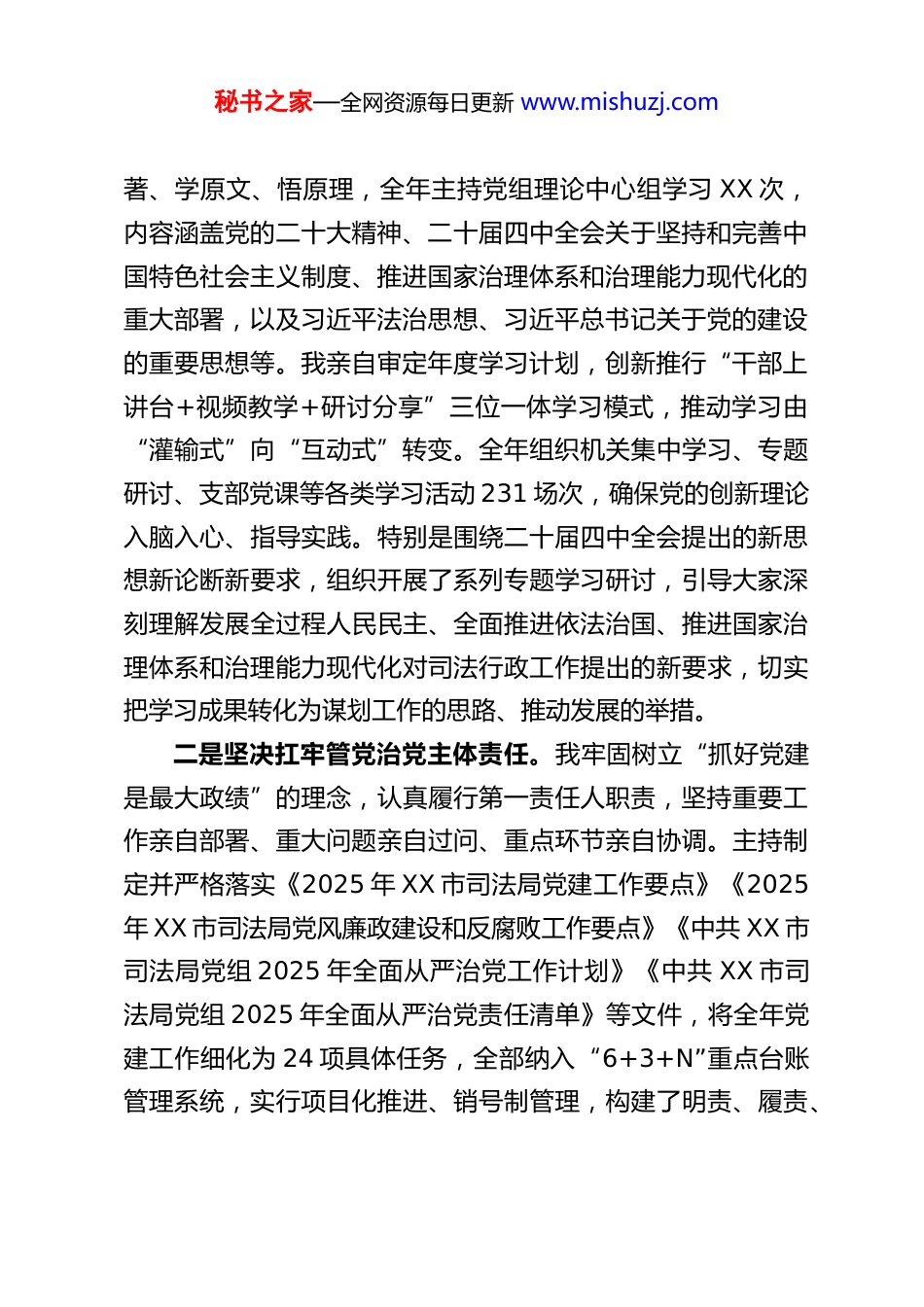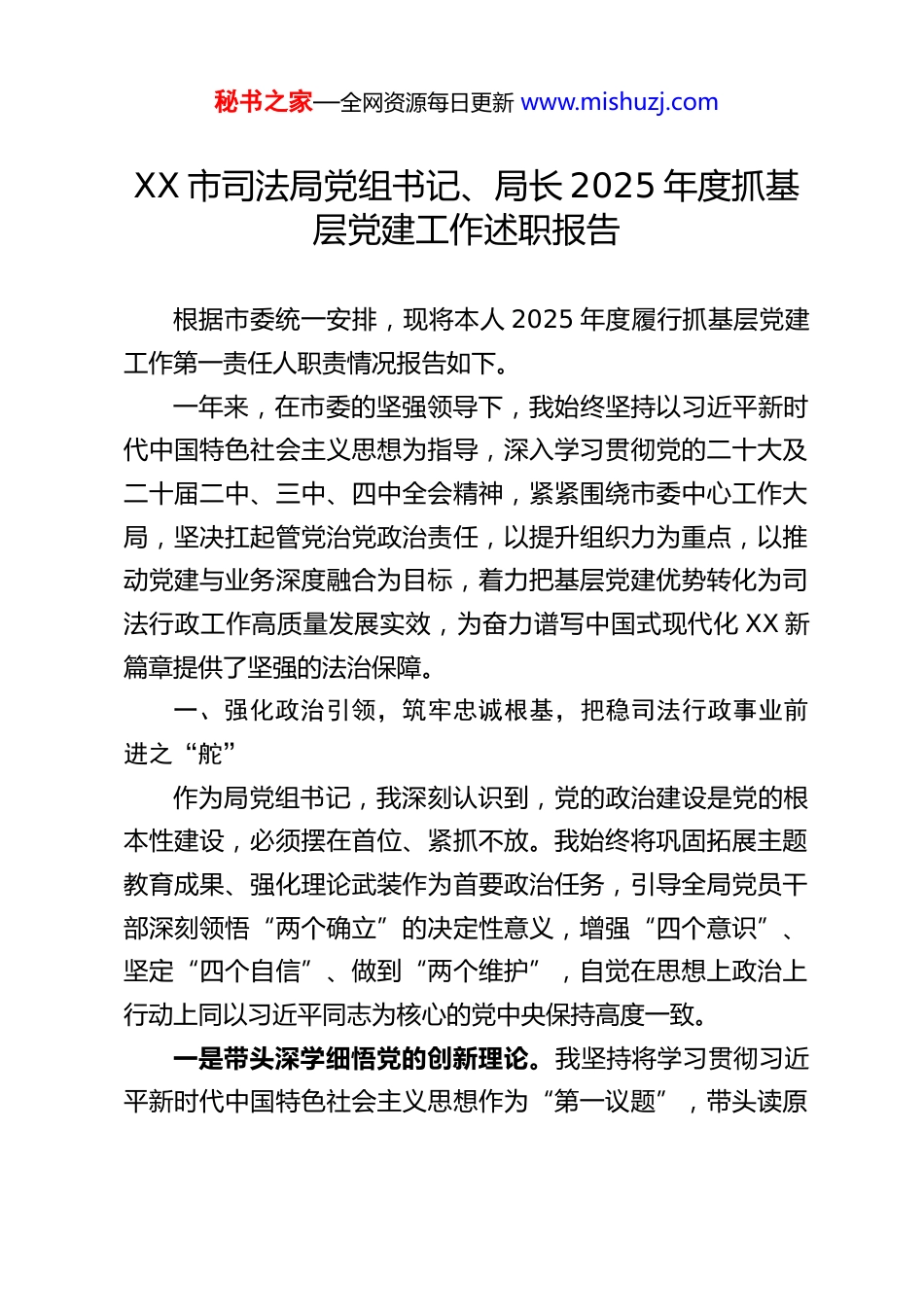 秘书之家—全网资源每日更新 www.mishuzj.comXX 市司法局党组书记、局长 2025 年度抓基层党建工作述职报告根据市委统一安排,现将本人 2025 年度履行抓基层党建工作第一责任人职责情况报告如下。一年来,在市委的坚强领导下,我始终坚持以习近平新时代中国特色社会主义思想为指导,深入学习贯彻党的二十大及二十届二中、三中、四中全会精神,紧紧围绕市委中心工作大局,坚决扛起管党治党政治责任,以提升组织力为重点,以推动党建与业务深度融合为目标,着力把基层党建优势转化为司法行政工作高质量发展实效,为奋力谱写中国式现代化 XX 新篇章提供了坚强的法治保障。一、强化政治引领,筑牢忠诚根基,把稳司法行政事业前进之“舵”作为局党组书记,我深刻认识到,党的政治建设是党的根本性建设,必须摆在首位、紧抓不放。我始终将巩固拓展主题教育成果、强化理论武装作为首要政治任务,引导全局党员干部深刻领悟“两个确立”的决定性意义,增强“四个意识”、坚定“四个自信”、做到“两个维护”,自觉在思想上政治上行动上同以习近平同志为核心的党中央保持高度一致。一是带头深学细悟党的创新理论。我坚持将学习贯彻习近平新时代中国特色社会主义思想作为“第一议题”,带头读原秘书之家—全网资源每日更新 www.mishuzj.com著、学原文、悟原理,全年主持党组理论中心组学习 XX 次,内容涵盖党的二十大精神、二十届四中全会关于坚持和完善中国特色社会主义制度、推进国家治理体系和治理能力现代化的重大部署,以及习近平法治思想、习近平总书记关于党的建设的重要思想等。我亲自审定年度学习计划,创新推行“干部上讲台+视频教学+研讨分享”三位一体学习模式,推动学习由“灌输式”向“互动式”转变。全年组织机关集中学习、专题研讨、支部党课等各类学习活动 231 场次,确保党的创新理论入脑入心、指导实践。特别是围绕二十届四中全会提出的新思想新论断新要求,组织开展了系列专题学习研讨,引导大家深刻理解发展全过程人民民主、全面推进依法治国、推进国家治理体系和治理能力现代化对司法行政工作提出的新要求,切实把学习成果转化为谋划工作的思路、推动发展的举措。二是坚决扛牢管党治党主体责任。我牢固树立“抓好党建是最大政绩”的理念,认真履行第一责任人职责,坚持重要工作亲自部署、重大问题亲自过问、重点环节亲自协调。主持制定并严格落实《2025 年 XX 市司法局党建工作要点》《2025年 XX 市司法局党风廉政建设和反腐败工作要点》《中共 XX 市司法局党组 2025 年全面从严治党工作计划》《中共 XX 市司法局党组 2025 年全面从严治党责任清单》等文件,将全年党建工作细化为 24 项具体任务,全部纳入“6+3+N”重点台账管理系统,实行项目化推进、销号制管理,构建了明责、履责、秘书之家—全网资源每日更新 www.mishuzj.com考责、问责的闭环责任体系,确保压力层层传导、任务件件落地。定期主持召开党组会议专题研究党建工作,听取各支部书记述职,分析研判形势,解决突出问题,推动全面从严治党向纵深发展、向基层延伸。三是不断夯实基层组织战斗堡垒。我高度重视基层基础工作,着力增强党组织的政治功能和组织功能。指导完成了市强制隔离戒毒所党委的换届选举工作,选优配强了党委班子。根据工作需要,规范新建了 2 个临时党支部和 1 个团支部,确保党的组织和工作全覆盖。严格党员发展和管理,全年高标准发展党员 6 名,为党组织注入新鲜血液。严格落实“三会一课”、组织生活会、民主评议党员等制度,督促各支部规范开展党内政治生活,不断提升党支部标准化规范化建设水平,使每个支部都成为党旗高高飘扬的战斗堡垒。二、深化作风建设,严明纪律规矩,营造风清气正政治生态之“净”我深知,作风建设永远在路上,纪律严明是事业成功的重要保障。我始终坚持严的主基调不动摇,以深入贯彻中央八项规定精神学习教育为重要抓手,驰而不息纠治“四风”,一体推进不敢腐、不能腐、不想腐。一是持续深化落实中央八项规定精神。我将贯彻落实中央八项规定精神作为一项严肃的政治纪律来抓,亲自推动制定《XX 市司法局深入贯彻中央八项...