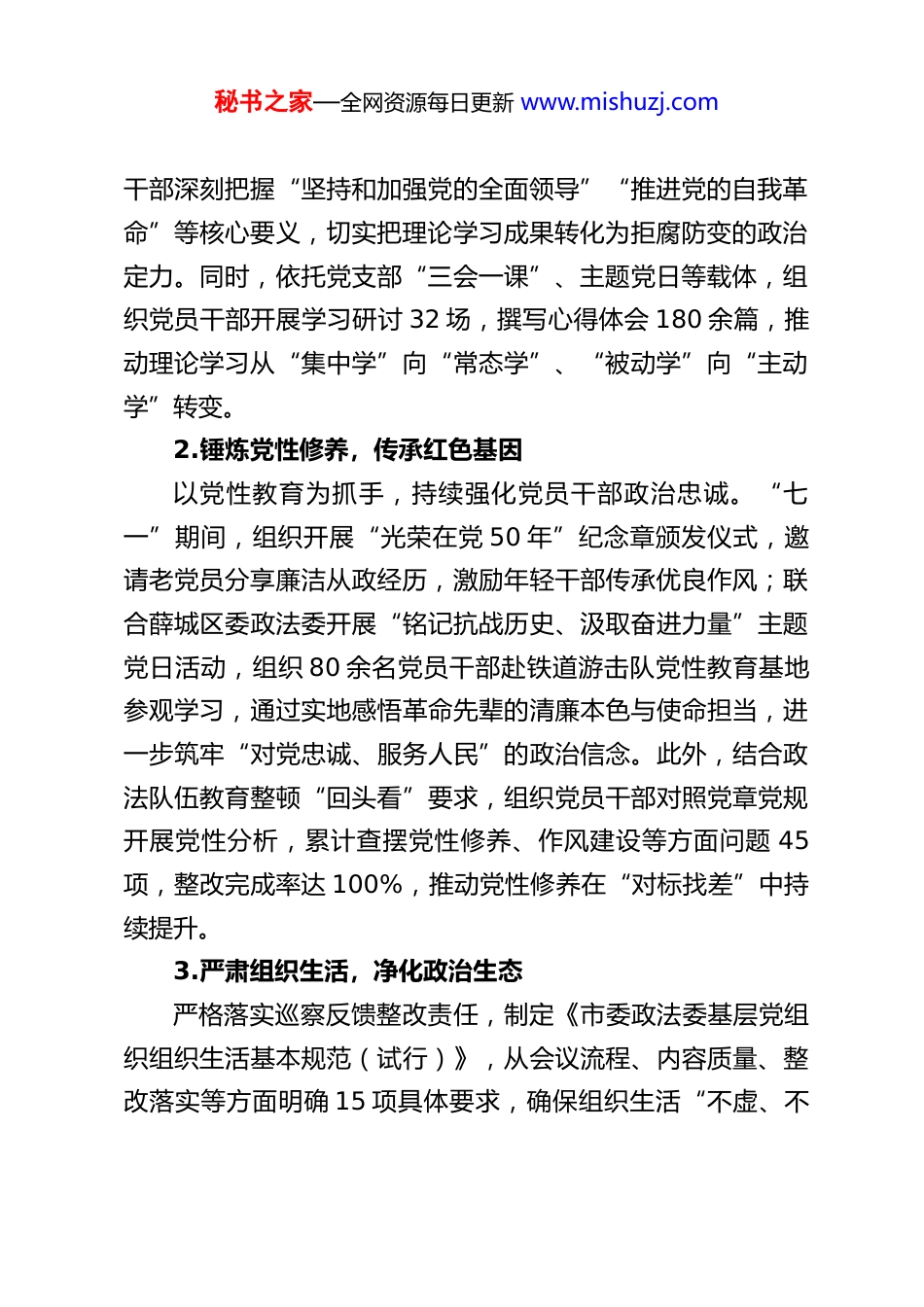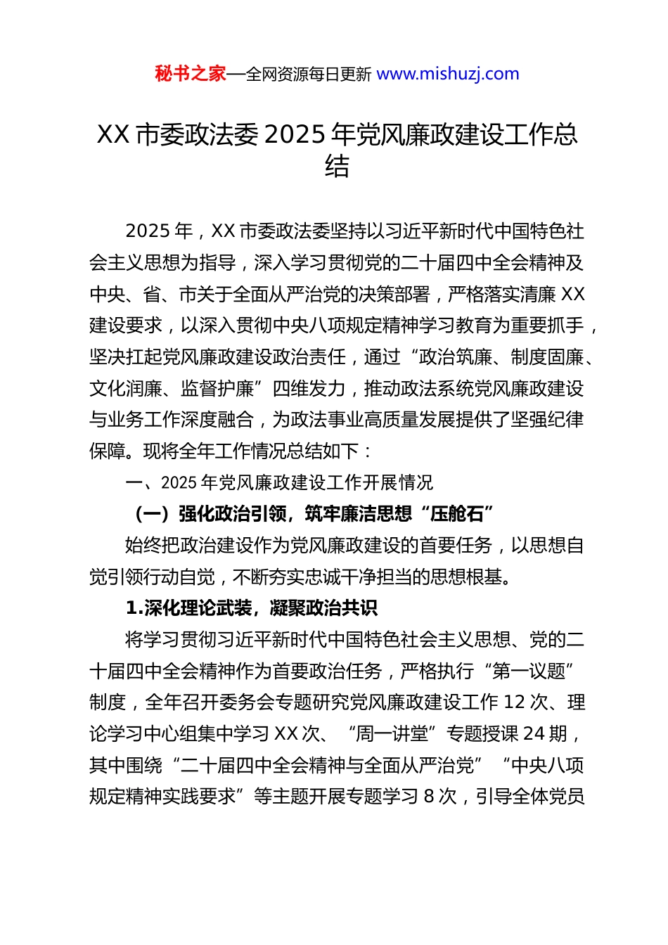 秘书之家—全网资源每日更新 www.mishuzj.comXX 市委政法委 2025 年党风廉政建设工作总结2025 年,XX 市委政法委坚持以习近平新时代中国特色社会主义思想为指导,深入学习贯彻党的二十届四中全会精神及中央、省、市关于全面从严治党的决策部署,严格落实清廉 XX建设要求,以深入贯彻中央八项规定精神学习教育为重要抓手,坚决扛起党风廉政建设政治责任,通过“政治筑廉、制度固廉、文化润廉、监督护廉”四维发力,推动政法系统党风廉政建设与业务工作深度融合,为政法事业高质量发展提供了坚强纪律保障。现将全年工作情况总结如下:一、2025 年党风廉政建设工作开展情况(一)强化政治引领,筑牢廉洁思想“压舱石”始终把政治建设作为党风廉政建设的首要任务,以思想自觉引领行动自觉,不断夯实忠诚干净担当的思想根基。1.深化理论武装,凝聚政治共识将学习贯彻习近平新时代中国特色社会主义思想、党的二十届四中全会精神作为首要政治任务,严格执行“第一议题”制度,全年召开委务会专题研究党风廉政建设工作 12 次、理论学习中心组集中学习 XX 次、“周一讲堂”专题授课 24 期,其中围绕“二十届四中全会精神与全面从严治党”“中央八项规定精神实践要求”等主题开展专题学习 8 次,引导全体党员秘书之家—全网资源每日更新 www.mishuzj.com干部深刻把握“坚持和加强党的全面领导”“推进党的自我革命”等核心要义,切实把理论学习成果转化为拒腐防变的政治定力。同时,依托党支部“三会一课”、主题党日等载体,组织党员干部开展学习研讨 32 场,撰写心得体会 180 余篇,推动理论学习从“集中学”向“常态学”、“被动学”向“主动学”转变。2.锤炼党性修养,传承红色基因以党性教育为抓手,持续强化党员干部政治忠诚。“七一”期间,组织开展“光荣在党 50 年”纪念章颁发仪式,邀请老党员分享廉洁从政经历,激励年轻干部传承优良作风;联合薛城区委政法委开展“铭记抗战历史、汲取奋进力量”主题党日活动,组织 80 余名党员干部赴铁道游击队党性教育基地参观学习,通过实地感悟革命先辈的清廉本色与使命担当,进一步筑牢“对党忠诚、服务人民”的政治信念。此外,结合政法队伍教育整顿“回头看”要求,组织党员干部对照党章党规开展党性分析,累计查摆党性修养、作风建设等方面问题 45项,整改完成率达 100%,推动党性修养在“对标找差”中持续提升。3.严肃组织生活,净化政治生态严格落实巡察反馈整改责任,制定《市委政法委基层党组织组织生活基本规范(试行)》,从会议流程、内容质量、整改落实等方面明确 15 项具体要求,确保组织生活“不虚、不秘书之家—全网资源每日更新 www.mishuzj.com空、不偏”。全年召开民主生活会 2 次、组织生活会 6 次,开展民主评议党员 1 次,党员干部主动揭短亮丑、相互批评提醒,累计提出批评意见 210 余条,均建立整改台账并跟踪问效。同时,将党风廉政建设要求融入组织生活全过程,每次党支部学习均设置“廉政课堂”环节,通报典型案例、解读纪律规定,推动党员干部在常态化“政治体检”中净化思想、规范行为,营造风清气正的政治生态。(二)健全制度体系,扎紧权力运行“铁笼子”坚持以制度管权、管事、管人,构建“事前预防、事中监督、事后问责”的廉政风险防控体系,确保权力运行公开透明、规范有序。1.规范决策程序,强化权力制约严格执行“三重一大”决策制度及末位表态制度,凡涉及重大决策、重要人事任免、重大项目安排和大额资金使用,均由委务会集体研究决定,全年召开“三重一大”事项决策会议18 次,邀请派驻纪检监察组全程列席指导,确保决策过程合法合规、公开透明。同时,建立“班子成员履行全面从严治党责任清单”,明确 12 项主体责任、8 项监督责任,委务会每季度听取班子成员责任落实情况汇报,全年开展责任落实督查 4 次,发现并整改责任传导不到位问题 6 项,推动全面从严治党责任层层压实。2.落实廉政机制,防范风险隐患秘书之家—全网资源每日更新 www.mishuzj.com深入落实党风廉政建设“十个一”工作机制(即制定一份责任清单、开展一次廉政谈话、组织一次风...