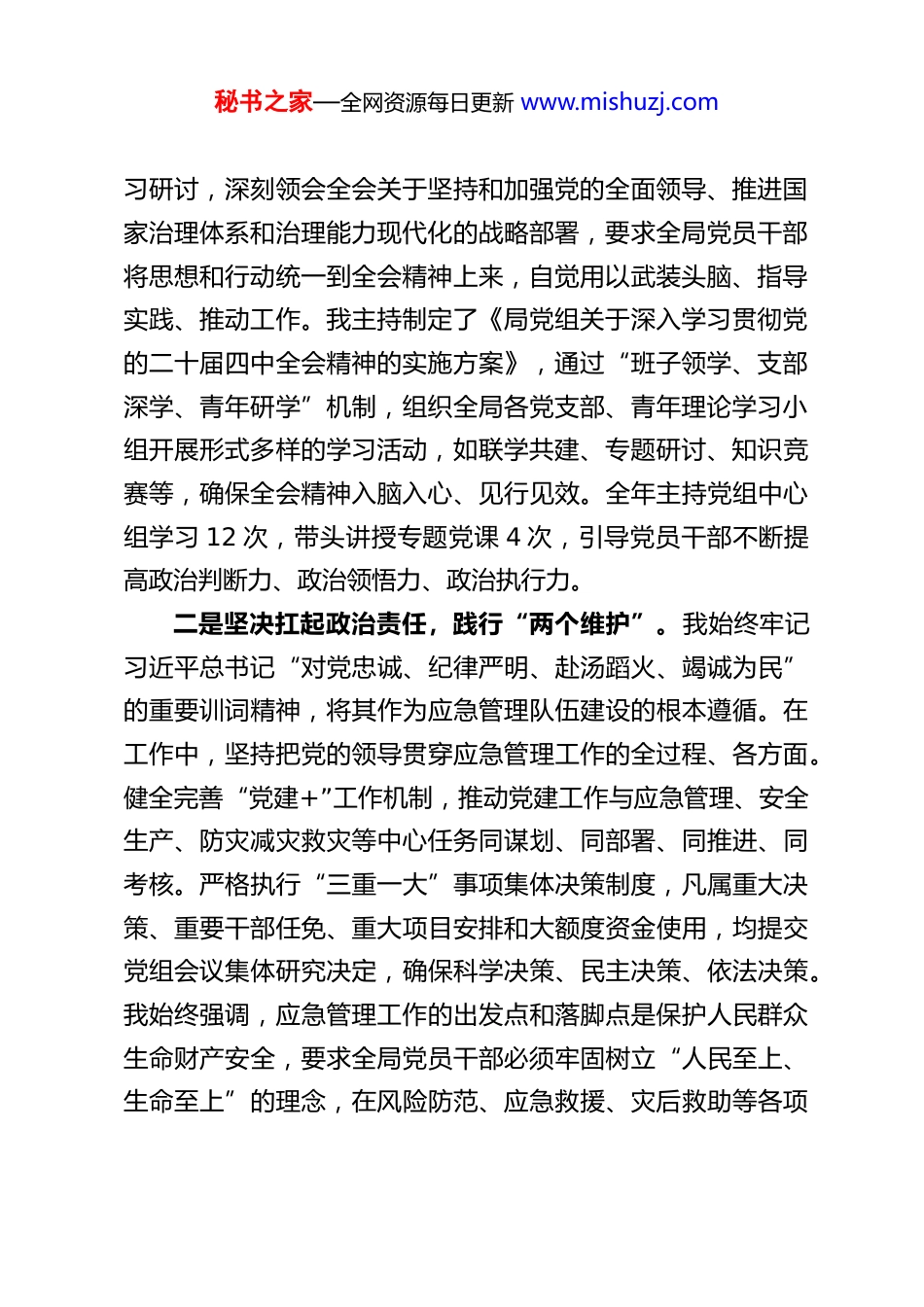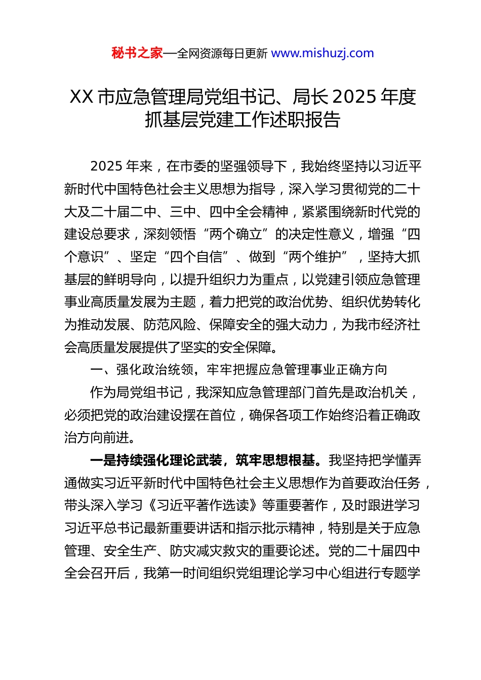 秘书之家—全网资源每日更新 www.mishuzj.comXX 市应急管理局党组书记、局长 2025 年度抓基层党建工作述职报告2025 年来,在市委的坚强领导下,我始终坚持以习近平新时代中国特色社会主义思想为指导,深入学习贯彻党的二十大及二十届二中、三中、四中全会精神,紧紧围绕新时代党的建设总要求,深刻领悟“两个确立”的决定性意义,增强“四个意识”、坚定“四个自信”、做到“两个维护”,坚持大抓基层的鲜明导向,以提升组织力为重点,以党建引领应急管理事业高质量发展为主题,着力把党的政治优势、组织优势转化为推动发展、防范风险、保障安全的强大动力,为我市经济社会高质量发展提供了坚实的安全保障。一、强化政治统领,牢牢把握应急管理事业正确方向作为局党组书记,我深知应急管理部门首先是政治机关,必须把党的政治建设摆在首位,确保各项工作始终沿着正确政治方向前进。一是持续强化理论武装,筑牢思想根基。我坚持把学懂弄通做实习近平新时代中国特色社会主义思想作为首要政治任务,带头深入学习《习近平著作选读》等重要著作,及时跟进学习习近平总书记最新重要讲话和指示批示精神,特别是关于应急管理、安全生产、防灾减灾救灾的重要论述。党的二十届四中全会召开后,我第一时间组织党组理论学习中心组进行专题学秘书之家—全网资源每日更新 www.mishuzj.com习研讨,深刻领会全会关于坚持和加强党的全面领导、推进国家治理体系和治理能力现代化的战略部署,要求全局党员干部将思想和行动统一到全会精神上来,自觉用以武装头脑、指导实践、推动工作。我主持制定了《局党组关于深入学习贯彻党的二十届四中全会精神的实施方案》,通过“班子领学、支部深学、青年研学”机制,组织全局各党支部、青年理论学习小组开展形式多样的学习活动,如联学共建、专题研讨、知识竞赛等,确保全会精神入脑入心、见行见效。全年主持党组中心组学习 12 次,带头讲授专题党课 4 次,引导党员干部不断提高政治判断力、政治领悟力、政治执行力。二是坚决扛起政治责任,践行“两个维护”。我始终牢记习近平总书记“对党忠诚、纪律严明、赴汤蹈火、竭诚为民”的重要训词精神,将其作为应急管理队伍建设的根本遵循。在工作中,坚持把党的领导贯穿应急管理工作的全过程、各方面。健全完善“党建+”工作机制,推动党建工作与应急管理、安全生产、防灾减灾救灾等中心任务同谋划、同部署、同推进、同考核。严格执行“三重一大”事项集体决策制度,凡属重大决策、重要干部任免、重大项目安排和大额度资金使用,均提交党组会议集体研究决定,确保科学决策、民主决策、依法决策。我始终强调,应急管理工作的出发点和落脚点是保护人民群众生命财产安全,要求全局党员干部必须牢固树立“人民至上、生命至上”的理念,在风险防范、应急救援、灾后救助等各项秘书之家—全网资源每日更新 www.mishuzj.com工作中,自觉践行党的根本宗旨,将“两个维护”体现在坚决贯彻落实党中央决策部署的行动上,体现在履职尽责、做好本职工作的实效上,体现在日常言行中。三是严明政治纪律规矩,净化政治生态。我带头遵守党的政治纪律和政治规矩,在重大原则问题上始终保持头脑清醒、立场坚定。严格落实意识形态工作责任制,定期分析研判意识形态领域风险,加强对局门户网站、微信公众号等宣传阵地的管理,牢牢掌握意识形态工作领导权。严肃党内政治生活,严格执行民主集中制,认真组织召开年度民主生活会和支部组织生活会,带头开展批评和自我批评,营造了风清气正的良好政治生态。二、夯实基层基础,着力提升党组织战斗堡垒作用我牢固树立大抓基层的鲜明导向,以提升组织力为重点,持续用力、精准发力,推动基层党组织全面进步、全面过硬。一是建强支部战斗堡垒。我坚持把党支部建设作为最重要的基本建设,严格落实《中国共产党支部工作条例(试行)》,持续推进党支部标准化规范化建设。优化支部设置,选优配强支部书记,督促各支部严格落实“三会一课”、主题党日、组织生活会、民主评议党员等基本制度。我本人坚持每月至少参加 1 次所在支部或联系点的组织生活,与普通党员一起学习交流、接受教育。指...