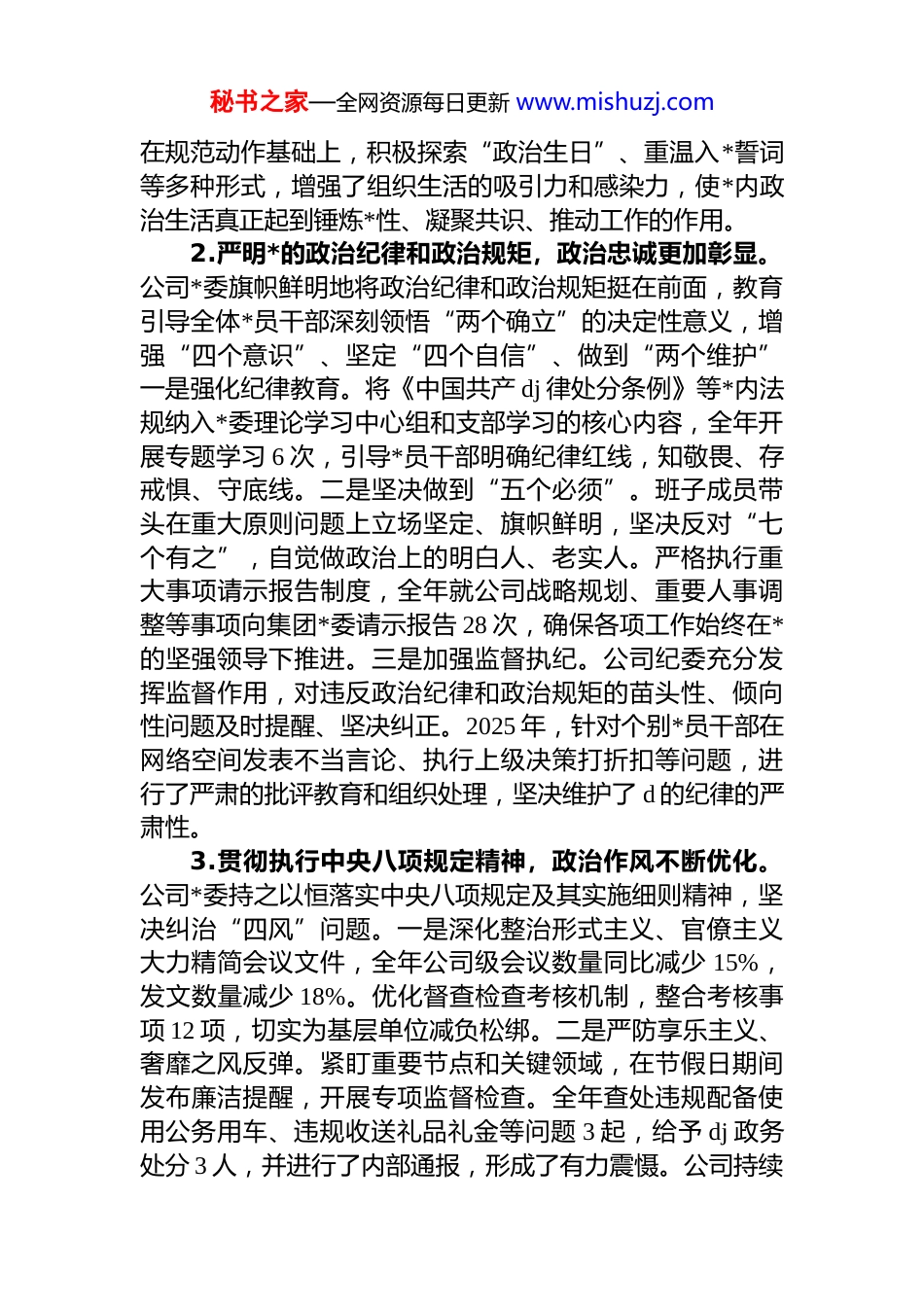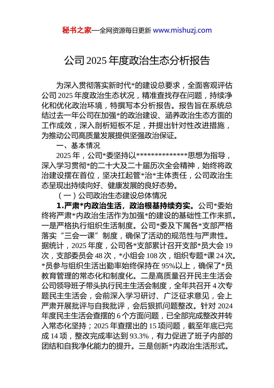 秘书之家—全网资源每日更新 www.mishuzj.com公司 2025 年度政治生态分析报告为深入贯彻落实新时代*的建设总要求,全面客观评估公司 2025 年度政治生态状况,精准查找存在问题,持续净化和优化政治环境,特撰写本分析报告。报告旨在系统总结过去一年公司在加强*的政治建设、涵养政治生态方面的工作成效,深入剖析短板不足,并提出针对性改进措施,为推动公司高质量发展提供坚强政治保证。一、基本情况2025 年,公司*委坚持以**************思想为指导,深入学习贯彻*的二十大及二十届历次全会精神,始终将政治建设摆在首位,坚决扛起管*治*主体责任,公司政治生态呈现出持续向好、健康发展的良好态势。(一)公司政治生态建设总体情况1.严肃*内政治生活,政治根基持续夯实。公司*委始终将严肃*内政治生活作为加强*的建设的基础性工作来抓。一是严格执行组织生活制度。公司*委及下属各*支部严格落实“三会一课”制度,确保了活动的规范性与严肃性。据统计,2025 年度,公司各*支部累计召开支部*员大会 19次,支部委员会 48 次,*小组会 108 次,组织专题*课 24 次。*员参与组织生活出勤率始终保持在 95%以上,确保了*员教育管理的常态化和制度化。二是高质量召开民主生活会公司领导班子带头执行民主生活会制度,全年共召开 4 次专题民主生活会,会前深入学习研讨、广泛征求意见,会上严肃开展批评与自我批评,会后狠抓问题整改。针对 2024年度民主生活会查摆的 6 个方面问题,已全部完成整改并转入常态化坚持;2025 年查摆出的 15 项问题,截至年底已完成 14 项,整改完成率达到 93.3%,有力促进了班子内部的团结和自我净化能力的提升。三是创新*内政治生活形式。秘书之家—全网资源每日更新 www.mishuzj.com在规范动作基础上,积极探索“政治生日”、重温入*誓词等多种形式,增强了组织生活的吸引力和感染力,使*内政治生活真正起到锤炼*性、凝聚共识、推动工作的作用。2.严明*的政治纪律和政治规矩,政治忠诚更加彰显。公司*委旗帜鲜明地将政治纪律和政治规矩挺在前面,教育引导全体*员干部深刻领悟“两个确立”的决定性意义,增强“四个意识”、坚定“四个自信”、做到“两个维护”一是强化纪律教育。将《中国共产 dj 律处分条例》等*内法规纳入*委理论学习中心组和支部学习的核心内容,全年开展专题学习 6 次,引导*员干部明确纪律红线,知敬畏、存戒惧、守底线。二是坚决做到“五个必须”。班子成员带头在重大原则问题上立场坚定、旗帜鲜明,坚决反对“七个有之”,自觉做政治上的明白人、老实人。严格执行重大事项请示报告制度,全年就公司战略规划、重要人事调整等事项向集团*委请示报告 28 次,确保各项工作始终在*的坚强领导下推进。三是加强监督执纪。公司纪委充分发挥监督作用,对违反政治纪律和政治规矩的苗头性、倾向性问题及时提醒、坚决纠正。2025 年,针对个别*员干部在网络空间发表不当言论、执行上级决策打折扣等问题,进行了严肃的批评教育和组织处理,坚决维护了 d 的纪律的严肃性。3.贯彻执行中央八项规定精神,政治作风不断优化。公司*委持之以恒落实中央八项规定及其实施细则精神,坚决纠治“四风”问题。一是深化整治形式主义、官僚主义大力精简会议文件,全年公司级会议数量同比减少 15%,发文数量减少 18%。优化督查检查考核机制,整合考核事项 12 项,切实为基层单位减负松绑。二是严防享乐主义、奢靡之风反弹。紧盯重要节点和关键领域,在节假日期间发布廉洁提醒,开展专项监督检查。全年查处违规配备使用公务用车、违规收送礼品礼金等问题 3 起,给予 dj 政务处分 3 人,并进行了内部通报,形成了有力震慑。公司持续秘书之家—全网资源每日更新 www.mishuzj.com关注中央纪委国家监委发布的全国查处违反中央八项规定精神问题月报数据,并以此为镜鉴,加强内部警示教育。三是树立过“紧日子”思想。严格控制“三公”经费支出全年公务接待费、会议费、差旅费等一般性支出同比下降12%,将节省下来的资金更多地投入到技术研发和安全生产中。4.发展积极健康的*内政治文化,政治风尚向上向好。公司*委高度重...