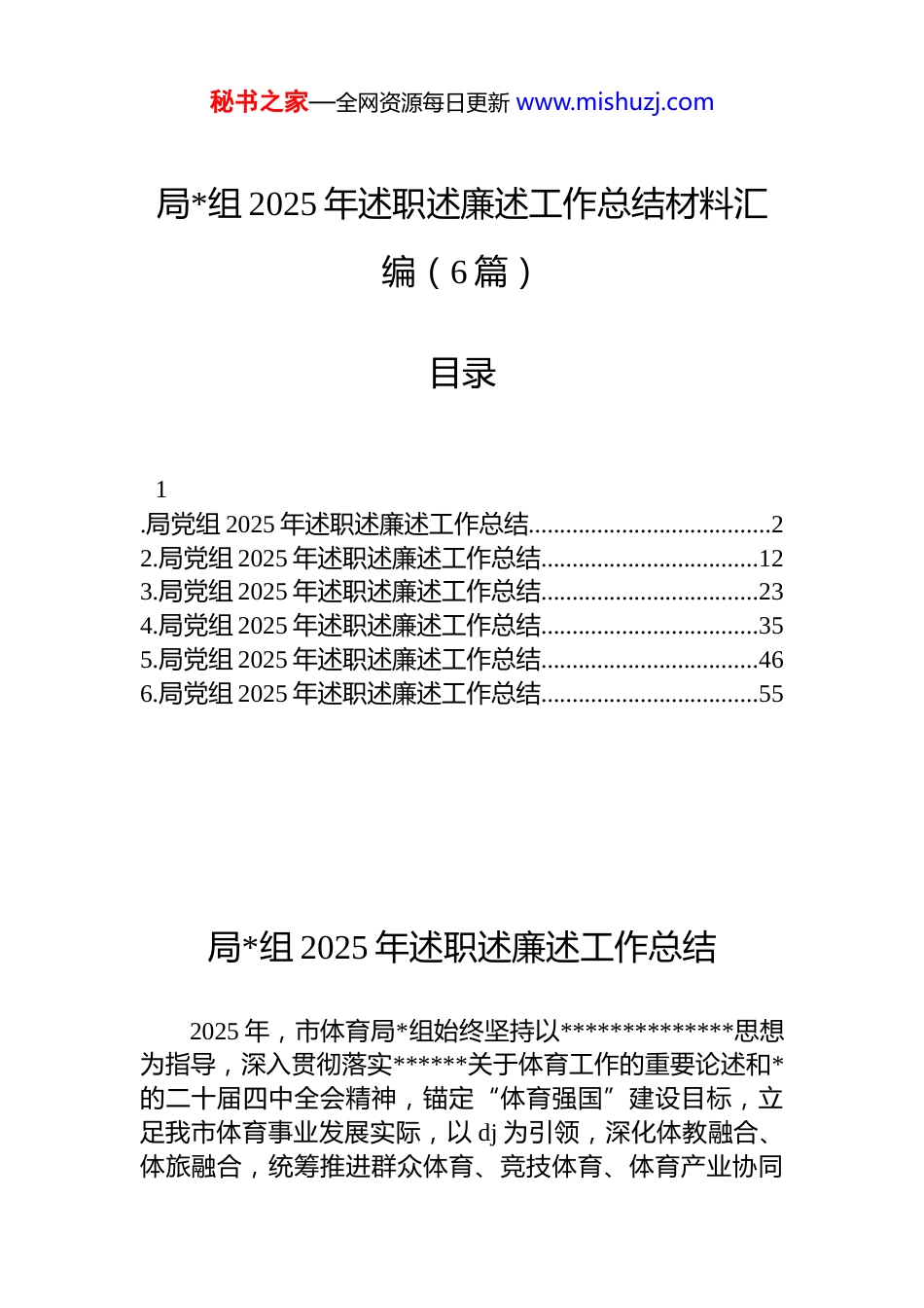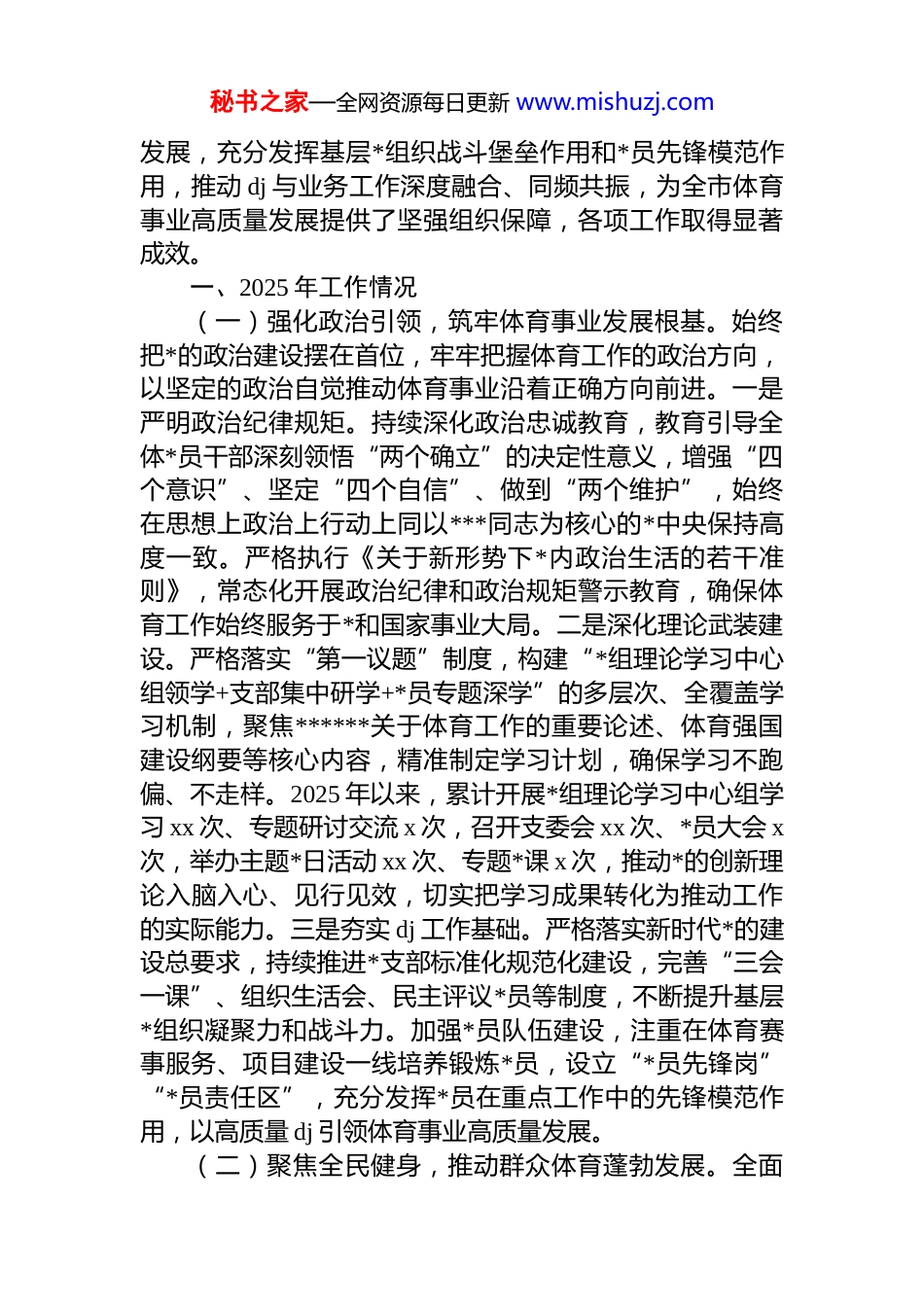 秘书之家—全网资源每日更新 www.mishuzj.com局*组 2025 年述职述廉述工作总结材料汇编(6 篇)目录1.局党组 2025 年述职述廉述工作总结.......................................22.局党组 2025 年述职述廉述工作总结...................................123.局党组 2025 年述职述廉述工作总结...................................234.局党组 2025 年述职述廉述工作总结...................................355.局党组 2025 年述职述廉述工作总结...................................466.局党组 2025 年述职述廉述工作总结...................................55局*组 2025 年述职述廉述工作总结2025 年,市体育局*组始终坚持以**************思想为指导,深入贯彻落实******关于体育工作的重要论述和*的二十届四中全会精神,锚定“体育强国”建设目标,立足我市体育事业发展实际,以 dj 为引领,深化体教融合、体旅融合,统筹推进群众体育、竞技体育、体育产业协同秘书之家—全网资源每日更新 www.mishuzj.com发展,充分发挥基层*组织战斗堡垒作用和*员先锋模范作用,推动 dj 与业务工作深度融合、同频共振,为全市体育事业高质量发展提供了坚强组织保障,各项工作取得显著成效。一、2025 年工作情况(一)强化政治引领,筑牢体育事业发展根基。始终把*的政治建设摆在首位,牢牢把握体育工作的政治方向,以坚定的政治自觉推动体育事业沿着正确方向前进。一是严明政治纪律规矩。持续深化政治忠诚教育,教育引导全体*员干部深刻领悟“两个确立”的决定性意义,增强“四个意识”、坚定“四个自信”、做到“两个维护”,始终在思想上政治上行动上同以***同志为核心的*中央保持高度一致。严格执行《关于新形势下*内政治生活的若干准则》,常态化开展政治纪律和政治规矩警示教育,确保体育工作始终服务于*和国家事业大局。二是深化理论武装建设。严格落实“第一议题”制度,构建“*组理论学习中心组领学+支部集中研学+*员专题深学”的多层次、全覆盖学习机制,聚焦******关于体育工作的重要论述、体育强国建设纲要等核心内容,精准制定学习计划,确保学习不跑偏、不走样。2025 年以来,累计开展*组理论学习中心组学习 xx 次、专题研讨交流 x 次,召开支委会 xx 次、*员大会 x次,举办主题*日活动 xx 次、专题*课 x 次,推动*的创新理论入脑入心、见行见效,切实把学习成果转化为推动工作的实际能力。三是夯实 dj 工作基础。严格落实新时代*的建设总要求,持续推进*支部标准化规范化建设,完善“三会一课”、组织生活会、民主评议*员等制度,不断提升基层*组织凝聚力和战斗力。加强*员队伍建设,注重在体育赛事服务、项目建设一线培养锻炼*员,设立“*员先锋岗”“*员责任区”,充分发挥*员在重点工作中的先锋模范作用,以高质量 dj 引领体育事业高质量发展。(二)聚焦全民健身,推动群众体育蓬勃发展。全面秘书之家—全网资源每日更新 www.mishuzj.com落实以人民为中心的发展思想,坚持把人民作为发展体育事业的主体,以构建更高水平的全民健身公共服务体系为目标,不断完善健身设施、丰富赛事活动、提升服务水平推动群众体育生活化、常态化。一是完善全民健身设施网络。加快推进“xx 分钟”便民健身圈建设,聚焦群众健身需求,统筹推进城乡体育设施均衡布局,持续加大对社区乡村健身设施的投入力度。二是丰富群众性体育赛事活动坚持“月月有活动、节节有赛事”的赛事举办机制,结合重要节庆节点,精心策划开展主题鲜明、群众参与度高的体育活动,不断激发群众健身热情。在元旦、春节期间,成功举办 xxxx 年全国新年登高健身大会、“体育大拜年”系列活动,营造了欢乐祥和的节日氛围;“三八”国际妇女节期间,举办“xx”健身操舞大赛,展现了新时代女性健康向上的精神风貌。全年累计举办各类群众性赛事活动超百场,参与群众超 xx 万人次。同时,鼓励各县区结合地域特色开展体育活动,xx 县中国象棋邀请赛、武都区“万象杯”门球全国邀请赛、xx 县“xx”和美乡村篮球赛(村ba)、xx 镇农民运动会等特色赛事蓬勃开展,形成了“一县一...