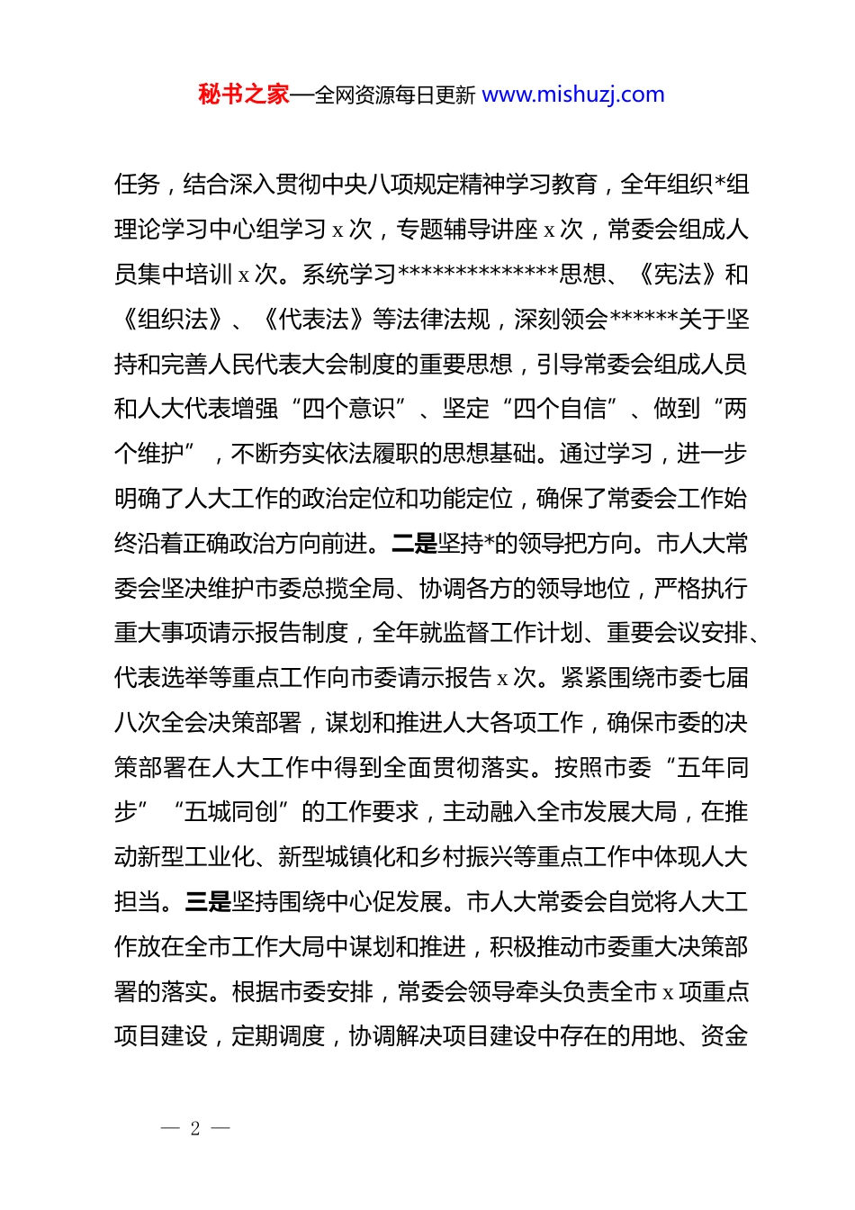 秘书之家—全网资源每日更新 www.mishuzj.com某市人大常委会 2025 年工作总结及 2026 年工作计划根据市人大常委会工作安排,现将 x 市第七届人民代表大会第六次会议以来,市人大常委会 2025 年工作情况及 2026 年工作思路报告如下:一、工作开展情况2025 年是“十四五”规划收官之年,也是人民代表大会制度确立 71 周年。一年来,在市委的坚强领导下,市人大常委会坚持以**************思想为指导,深入贯彻*的二十大和二十届二中、三中、四中全会精神,全面落实******考察江西重要讲话精神,聚焦“走在前、勇争先、善作为”的目标要求,按照“五年同步”“五城同创”的实践路径,依法行使宪法和法律赋予的各项职权,全年共召开市人民代表大会会议 1 次、常委会会议 x 次、主任会议 x 次,听取和审议“一府一委两院”专项工作报告 x 项,作出决议决定 x 项,开展执法检查 x 次、专题调研 x 次,任免国家机关工作人员 x 人次,为奋力谱写中国式现代化 x 篇章贡献了人大力量。(一)把牢“三个坚持”,政治引领坚定有力。一是坚持理论武装筑根基。市人大常委会始终把理论学习作为首要政治— 1 —秘书之家—全网资源每日更新 www.mishuzj.com任务,结合深入贯彻中央八项规定精神学习教育,全年组织*组理论学习中心组学习 x 次,专题辅导讲座 x 次,常委会组成人员集中培训 x 次。系统学习**************思想、《宪法》和《组织法》、《代表法》等法律法规,深刻领会******关于坚持和完善人民代表大会制度的重要思想,引导常委会组成人员和人大代表增强“四个意识”、坚定“四个自信”、做到“两个维护”,不断夯实依法履职的思想基础。通过学习,进一步明确了人大工作的政治定位和功能定位,确保了常委会工作始终沿着正确政治方向前进。二是坚持*的领导把方向。市人大常委会坚决维护市委总揽全局、协调各方的领导地位,严格执行重大事项请示报告制度,全年就监督工作计划、重要会议安排、代表选举等重点工作向市委请示报告 x 次。紧紧围绕市委七届八次全会决策部署,谋划和推进人大各项工作,确保市委的决策部署在人大工作中得到全面贯彻落实。按照市委“五年同步”“五城同创”的工作要求,主动融入全市发展大局,在推动新型工业化、新型城镇化和乡村振兴等重点工作中体现人大担当。三是坚持围绕中心促发展。市人大常委会自觉将人大工作放在全市工作大局中谋划和推进,积极推动市委重大决策部署的落实。根据市委安排,常委会领导牵头负责全市 x 项重点项目建设,定期调度,协调解决项目建设中存在的用地、资金— 2 —秘书之家—全网资源每日更新 www.mishuzj.com等难题 x 个。常委会各专门委员会和工作委员会结合职责分工,积极参与招商引资、优化营商环境、生态环境保护等重点工作,特别是在推动国家级铜基新材料产业集群建设、全国城乡融合发展样板区创建等方面,开展了系列调研和监督活动,提出了x 条有针对性的意见建议,得到市委的充分肯定。(二)突出“三个聚焦”,监督实效显著提升。一是聚焦经济工作强监督。市人大常委会高度关注全市经济运行情况,听取和审议了市人民政府关于 2025 年国民经济和社会发展计划执行情况的报告,审查批准了 2025 年国民经济和社会发展计划。加强预算审查监督,听取和审议了 2024 年市级预算执行和其他财政收支的审计工作报告、2024 年全市和市级预算执行情况与2025 年全市和市级预算草案的报告,批准了 2025 年市级预算。围绕市委提出的“打造国家级铜基新材料集群主阵地”目标,组织代表对全市铜产业发展情况开展了专题调研,提出了加快技术改造、延伸产业链条等 x 条建议,推动了 x 个铜产业重点项目的落地和建设。二是聚焦依法治市促规范。市人大常委会听取和审议了市人民法院关于加强刑事审判工作情况的报告、市人民检察院关于开展公益诉讼检察工作情况的报告,提出了加强司法建设、提升司法公信力的意见建议 x 条。对《中华人民共和国环境保护法》《x 省生态文明建设促进条例》等 x 部法— 3 —秘书之家—全网资源每日更新 www.mishuzj.com律法规的实施情况开...